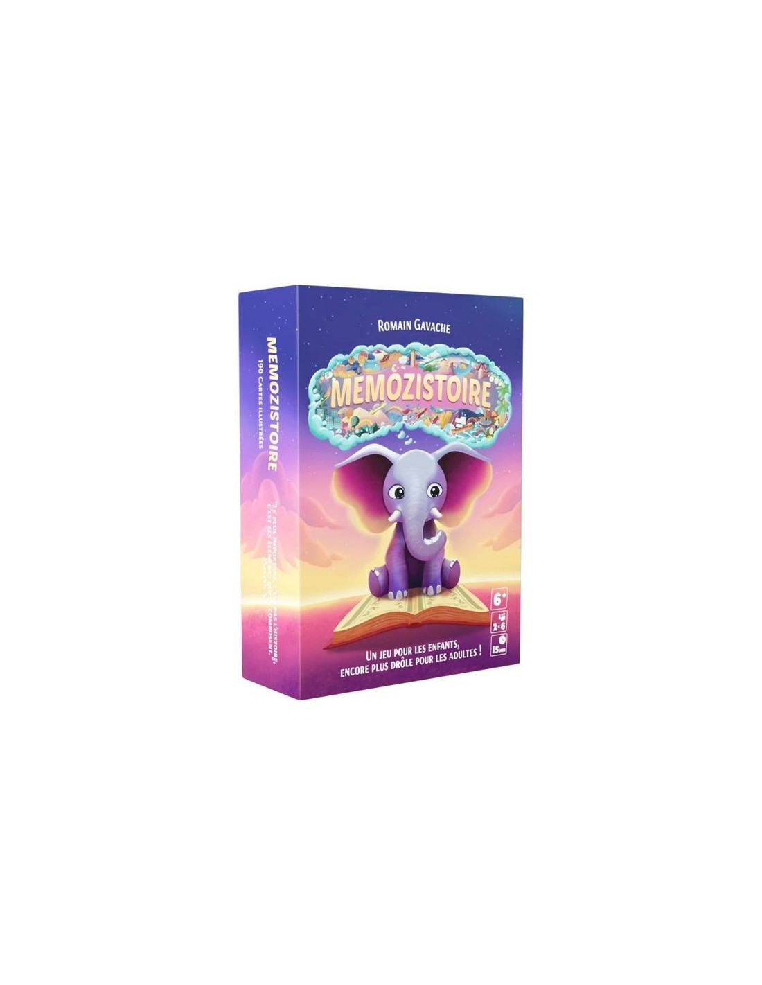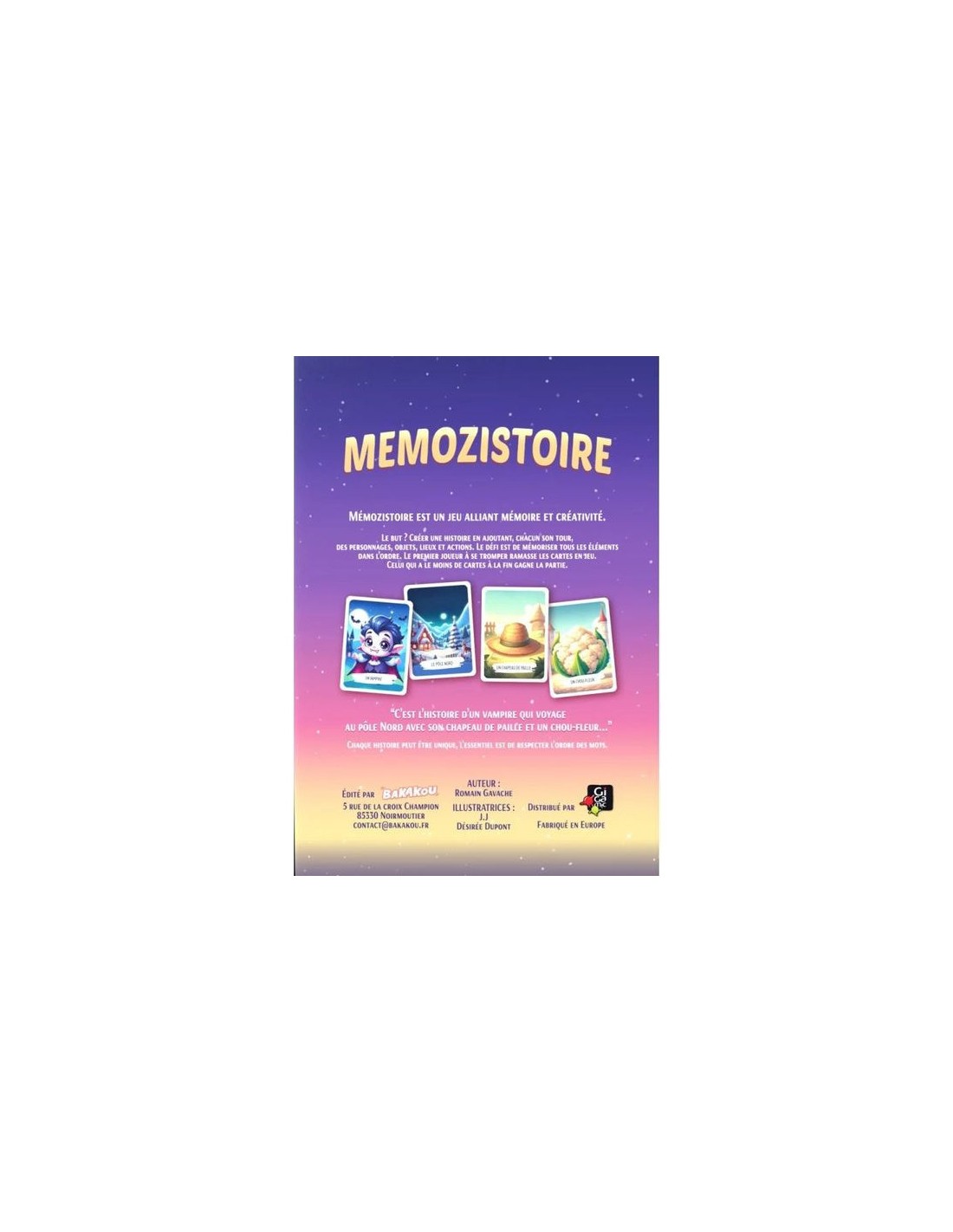 Memozistoire est un jeu alliant mémoire et créativité. Le but ? Créer une histoire en ajoutant, chacun son tour, des personnages, objets, lieux et actions. Le défi, est de mémoriser tous les éléments dans l’ordre. Le premier joueur à se tromper ramasse les cartes en jeu.