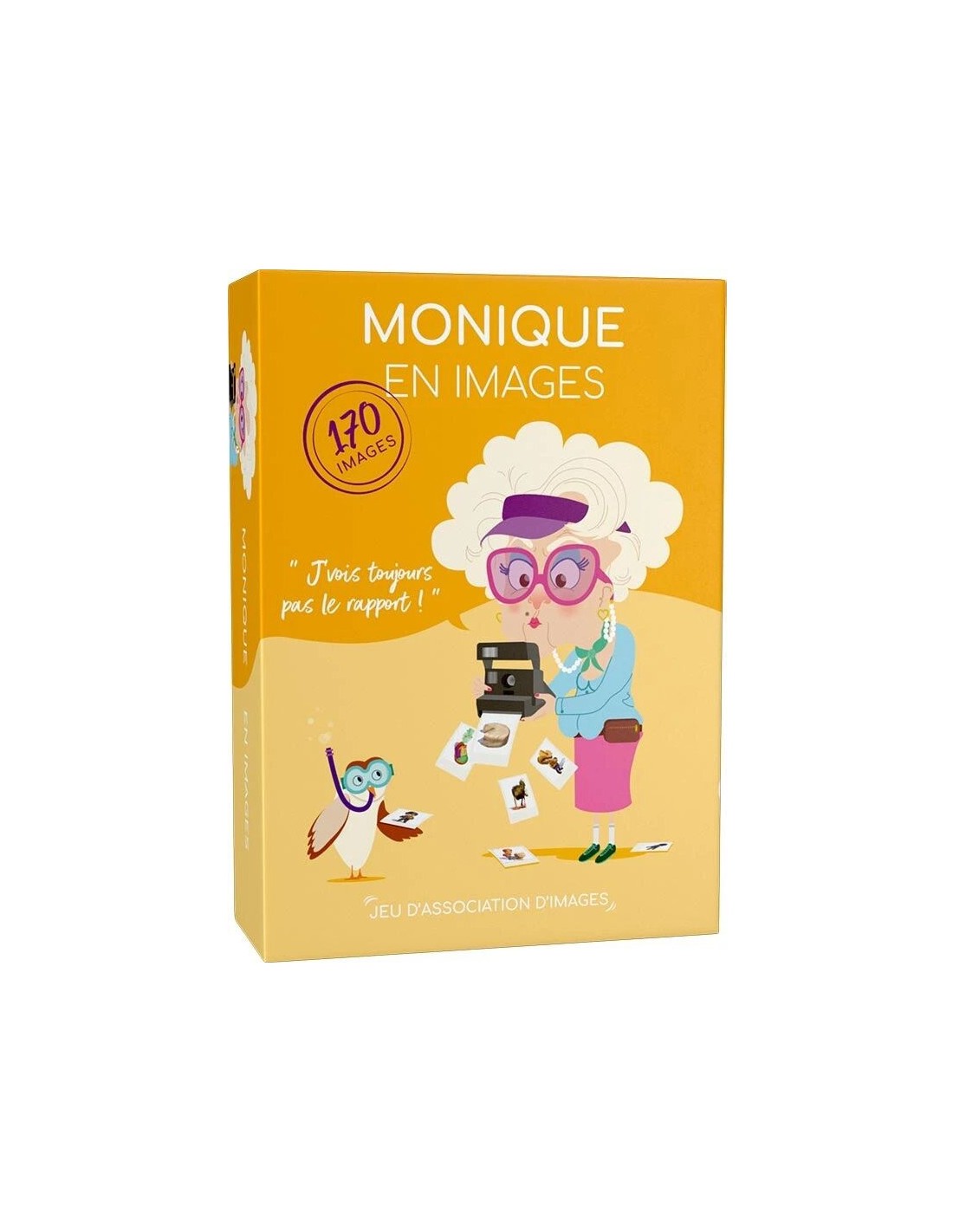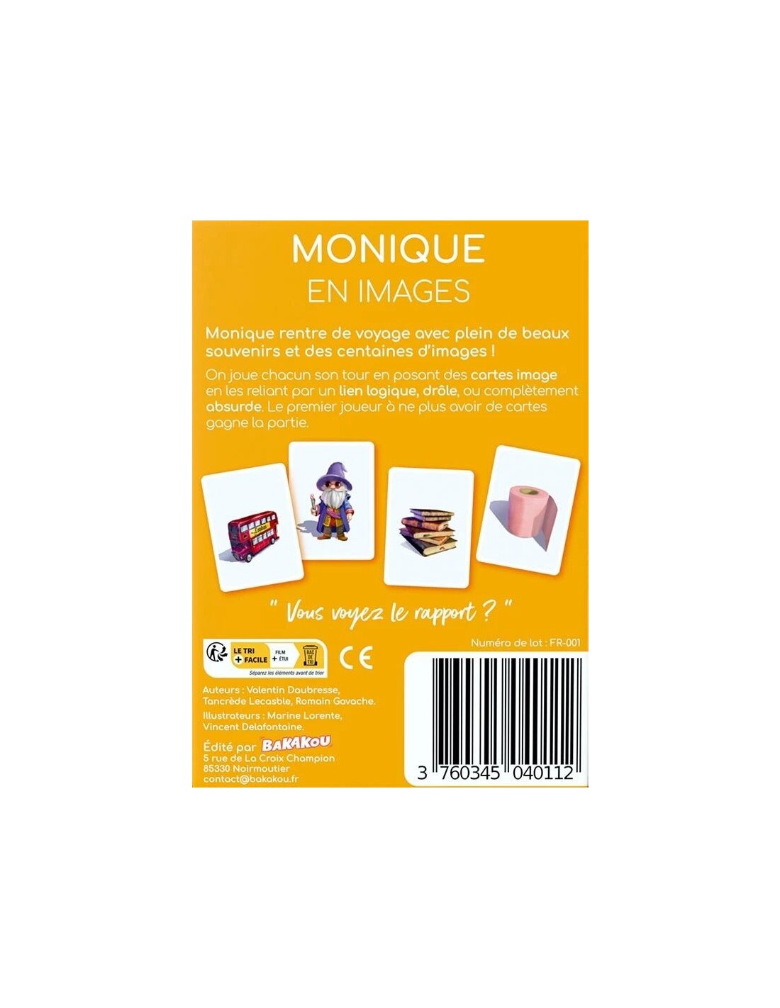 Monique rentre de voyage avec pleins de beaux souvenirs et des centaines d’images ! On joue chacun son tour en passant des cartes images en les reliant par un lien logique, drôle, ou complètement absurde. Le premier joueur à n’avoir plus de cartes gagne la partie.
