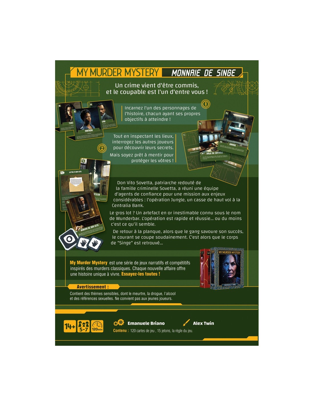 Vous faites partie du gang du redouté Don Vito, patriarche d’une famille criminelle. Vous venez de réussir un casse, affublés de masques d’animaux. Mais de retour à la planque, le courant se coupe soudainement. C'est alors que le corps de "Singe" est retrouvé... My Murder Mystery est une série de jeux d'enquête compétitifs qui recréent la magie d'une Murder Party sans Maître de jeu et dans un format compact.