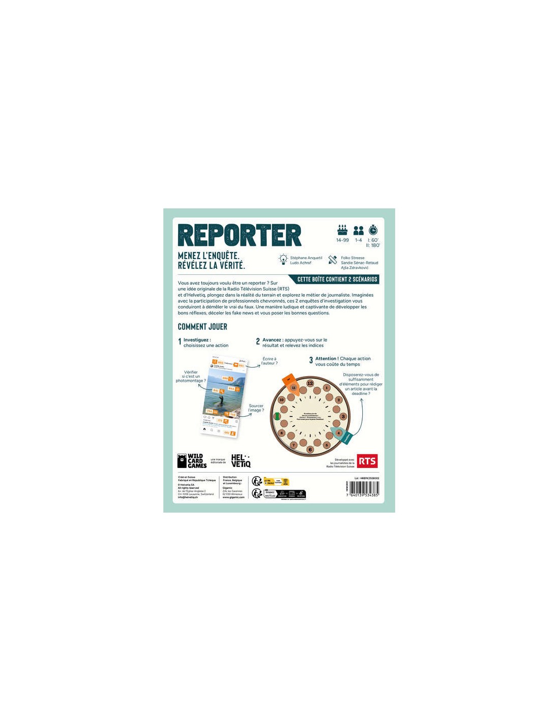 Une manière ludique et captivante d’apprendre les bases du métier et développer les bons réflexes pour déceler les fake news. La boîte propose deux scénarios pour un plaisir immédiat et une expérience immersive. - Le premier jeu d‘enquête journalistique - Deux scénarios complètement différents - Un matériel immersif et varié, incluant de l‘audiovisuel professionnel réalisé par la Radio Télévision Suisse