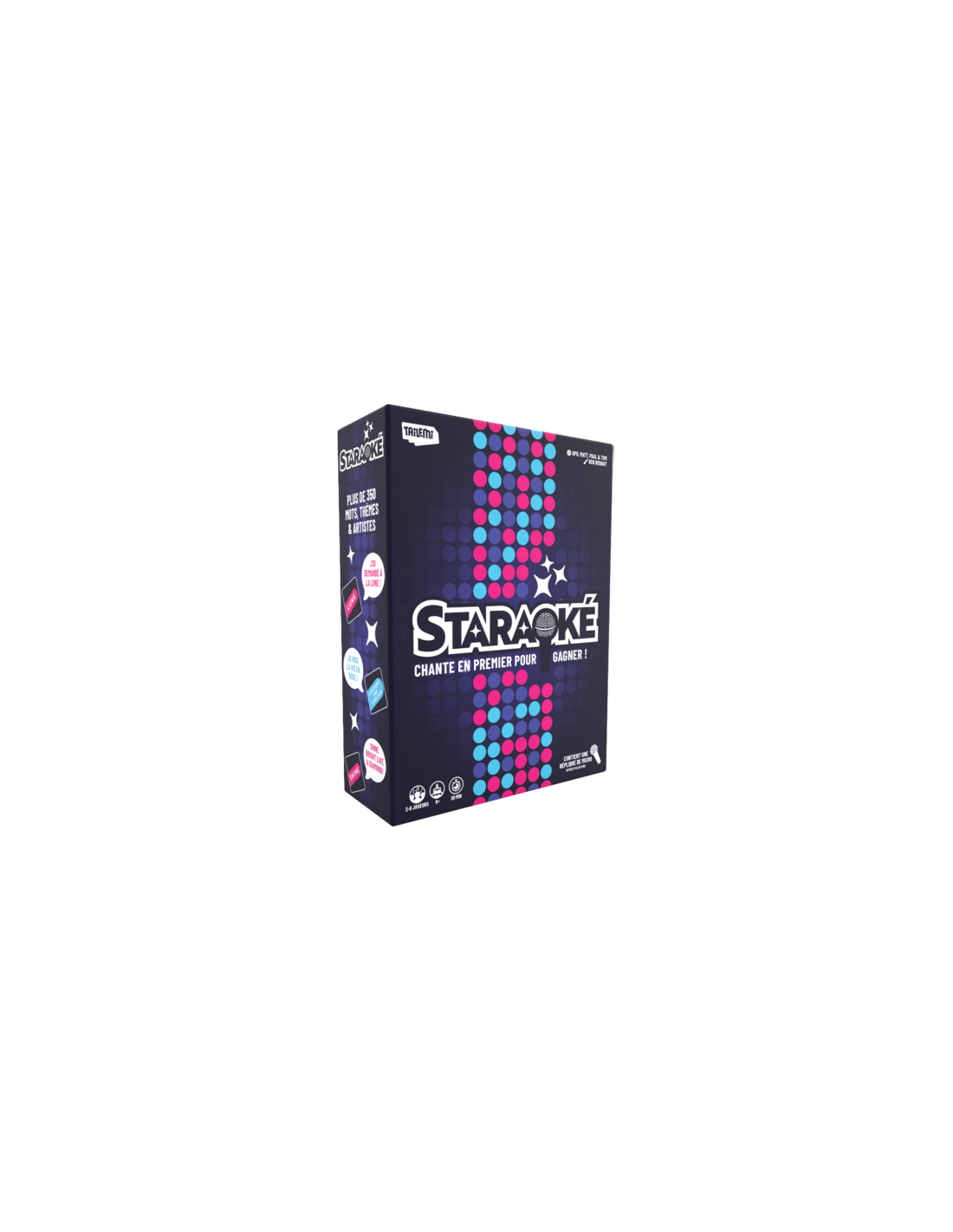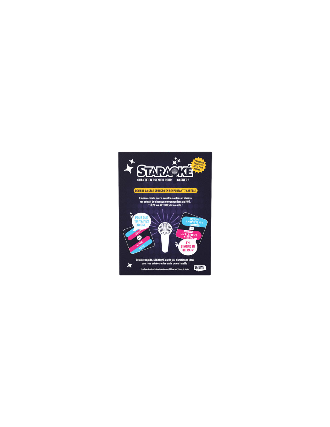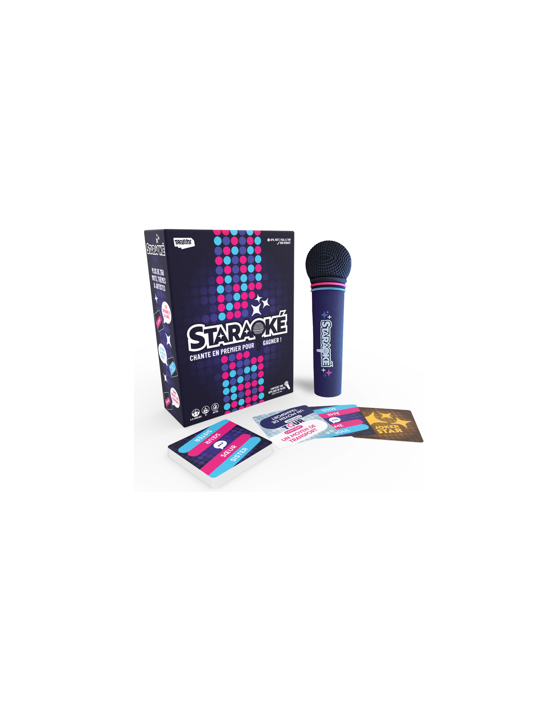 Staraoké est un jeu musical de rapidité où les joueurs doivent chanter un extrait de chanson contenant le mot, le thème ou artistes indiqués sur la carte catégorie. Le premier qui attrape le micro et chante un extrait correspondant à la carte catégorie remporte le tour. Des cartes spéciales Star Tour contiennent également un mot ou artistes mais déclenchent une « mort subite ».