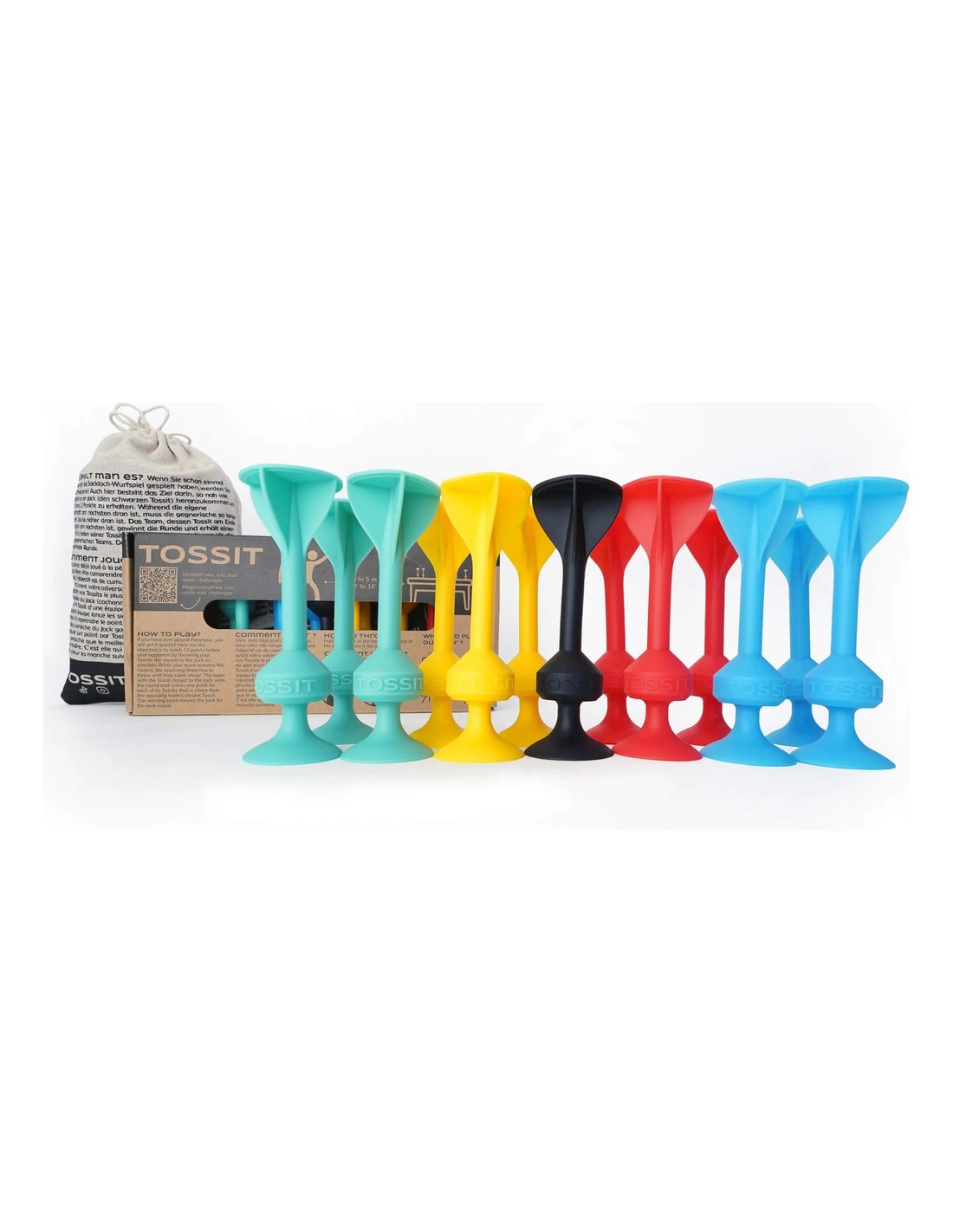 Tossit est un jeu d'adresse qui propose un mix entre pétanque et fléchette, se joue à l'intérieur ou à l'extérieur, au sol ou à la verticale. Jouez sur toutes les surfaces lisses autour de vous en intérieur comme en extérieur ! Table, sol, plafond, fenêtre, voiture...Le set Tossit Pack Famille: Rouge-Cyan-Bleu-Jaune est le pack qu'il vous faut pour jouer à 4 et vous amuser entre potes, en famille, en soirée, ou même au bureau entre deux pauses !