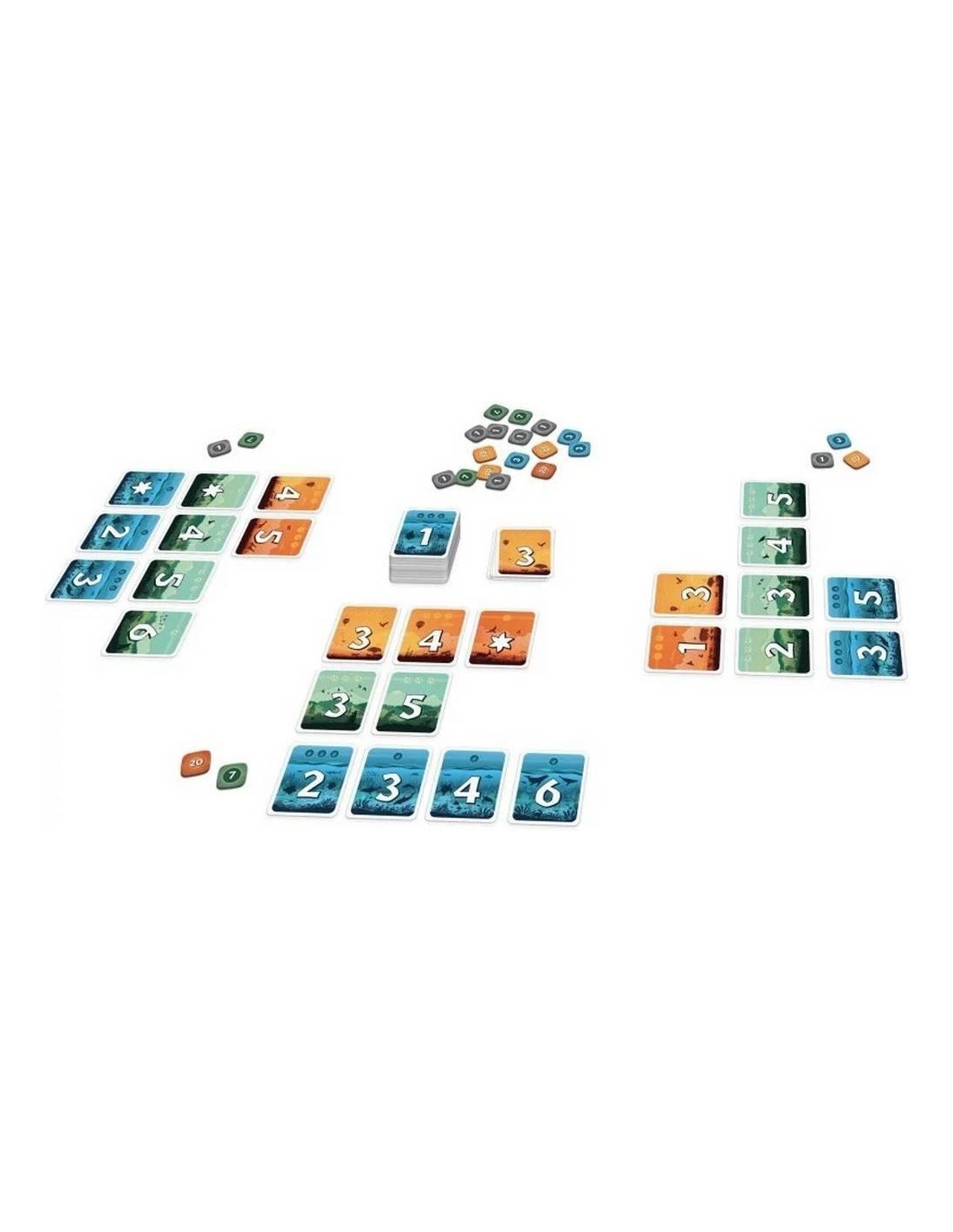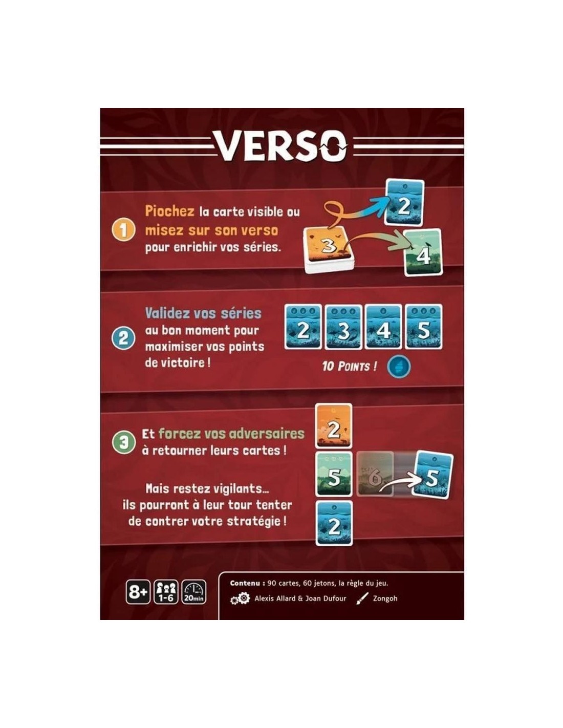 Plongez dans un jeu de cartes, à la fois accessible et stratégique ! Choisissez entre la face visible ou prenez le risque de découvrir le verso pour compléter vos séries. Planifiez et validez vos combinaisons au bon moment pour amasser vos points de victoire. Déjouez la stratégie de vos adversaires en les forçant à retourner leurs cartes…mais restez vigilants, car ils pourraient bien vous contrer à leur tour !