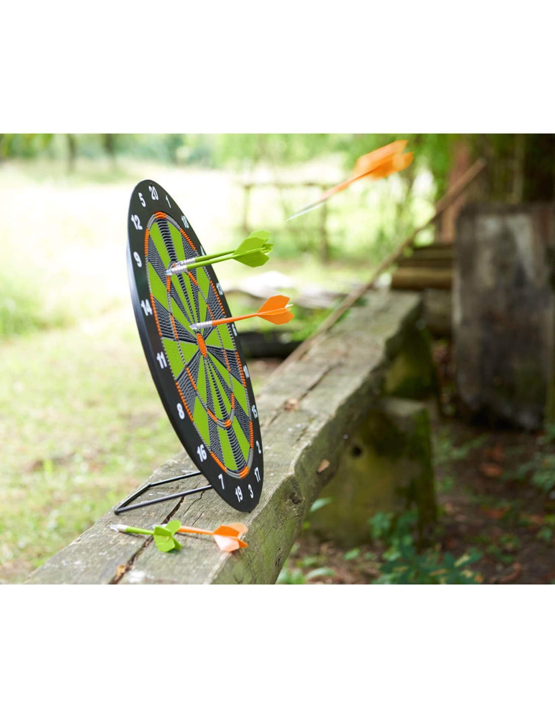 Il est souvent difficile de trouver un entre-deux adéquat entre les jeux de fléchettes pour les tout petits (bien souvent magnétiques) et les vraies fléchettes (aux pointes dangereusement aiguisées). Haba propose la solution idéale avec ce jeu qui a tout d’un vrai (couleurs neutres, support de fixation, carnet marque-point, …) mais dont les bouts des fléchettes sont munis d’une sécurité en plastique.