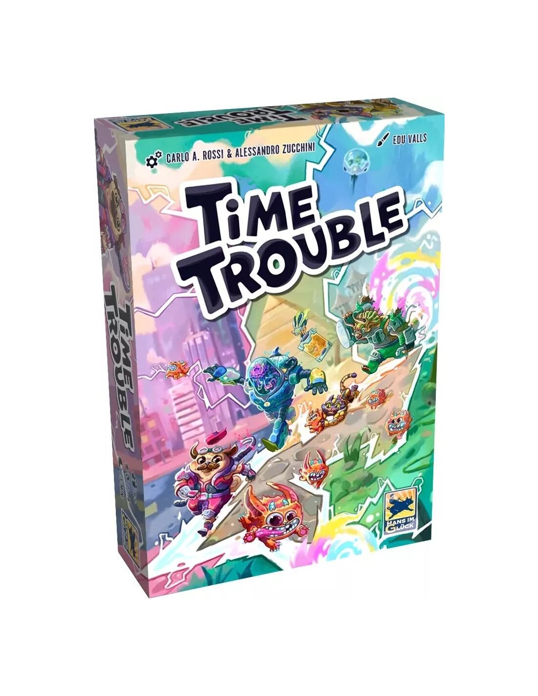 Dans Time Trouble vous faites voyager quatre adorables personnages à travers différents niveaux en plaçant des cartes transparentes les unes sur les autres. Votre objectif est d'attraper les Fluffys qui perturbent la chronologie temporelle. À chaque niveau, vous voyagez dans le temps pour relever de nouveaux défis. Ensemble, vous devez coordonner vos actions et utiliser les capacités des personnages pour réussir - mais vous n'avez que quelques secondes pour mettre vos plans à exécution !- Age : à partir de 9 ans