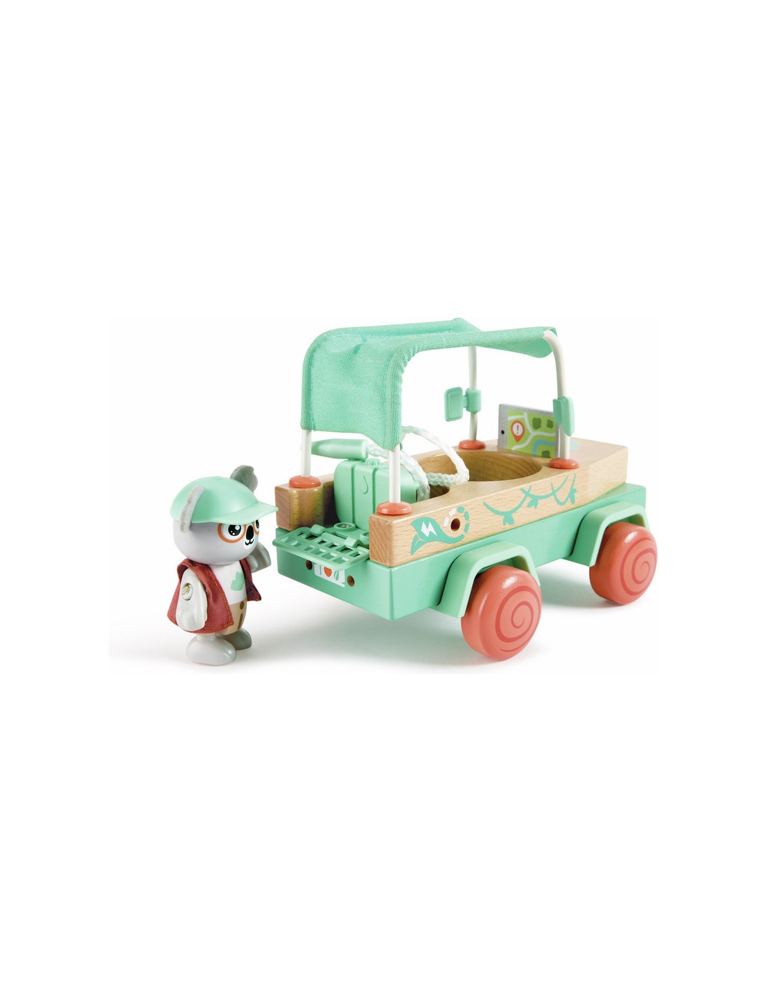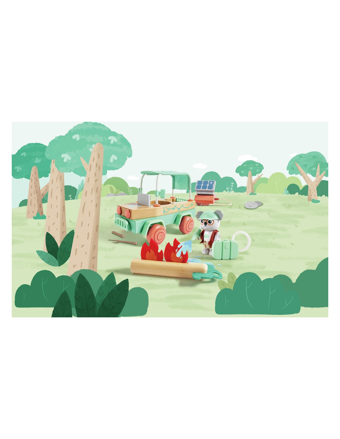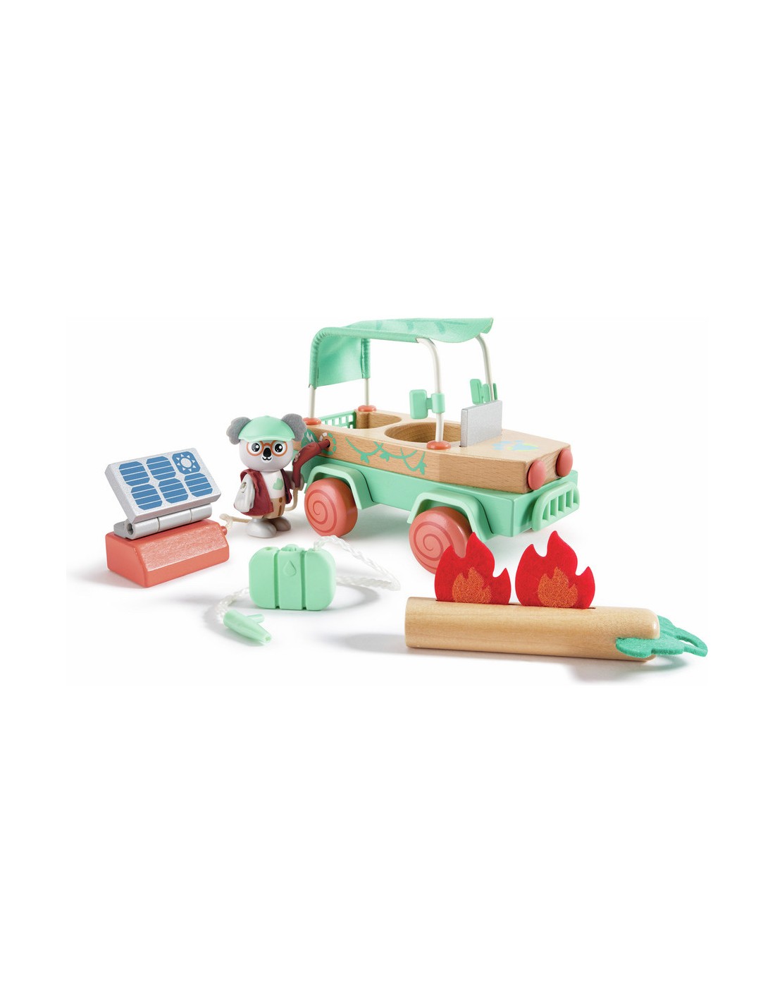 - Une Multitude D’Accessoires : ce cet comporte un véhicule tout-terrain, une figurine de koala, un chapeau, une veste, un arbre tombé, un crochet, une cuve d’eau, deux flammes en feutre, un chargeur solaire portatif, une tablette et un dépliant