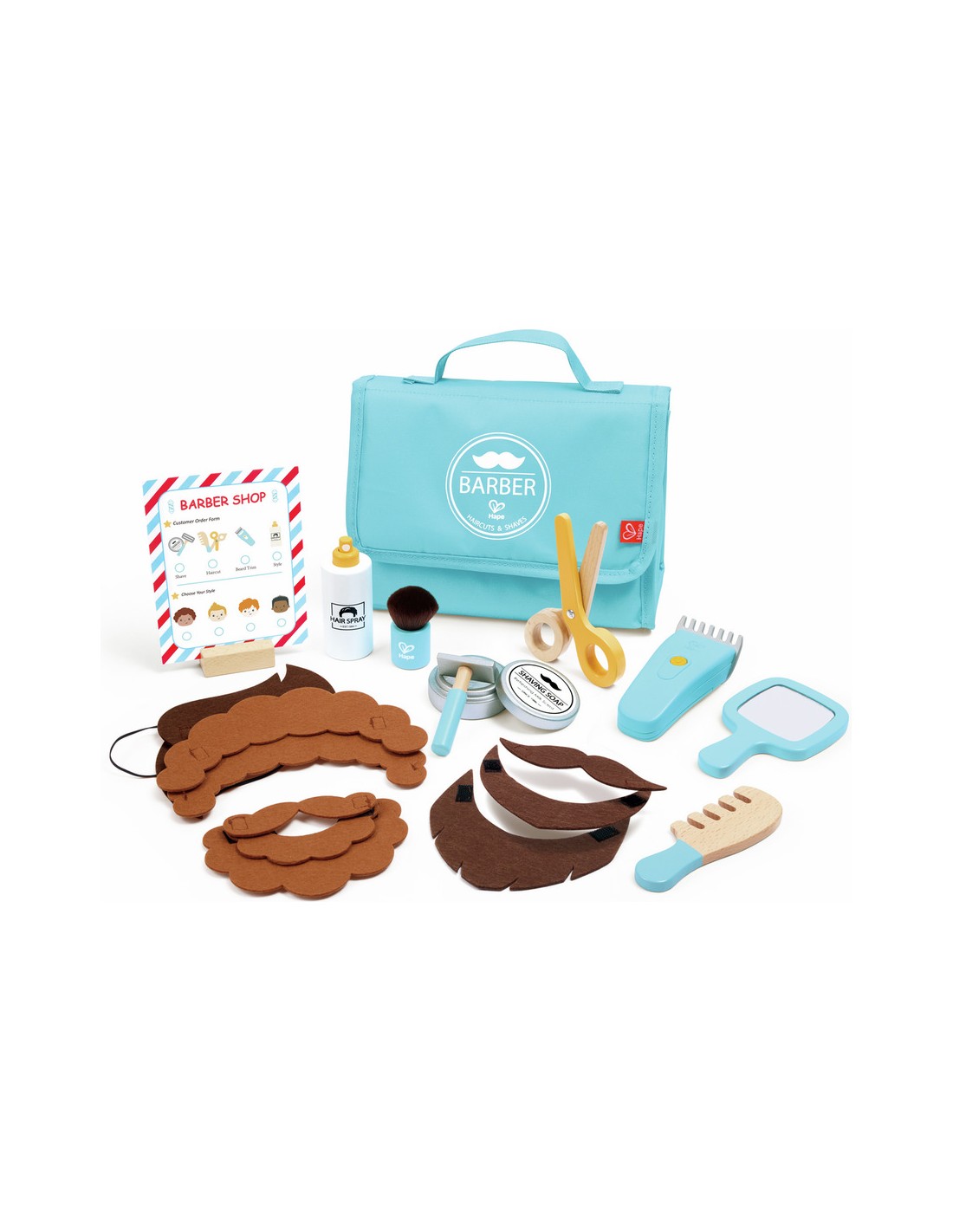 Laissez les enfants gérer leur propre salon de coiffure avec le kit de salon de coiffure Snip & Style de Hape ! Ce vaste ensemble de jeu contient tout ce dont un petit coiffeur a besoin : d'une tondeuse et de ciseaux à un miroir, un peigne, une brosse et même des cheveux et des moustaches feutrés à faire soi-même.