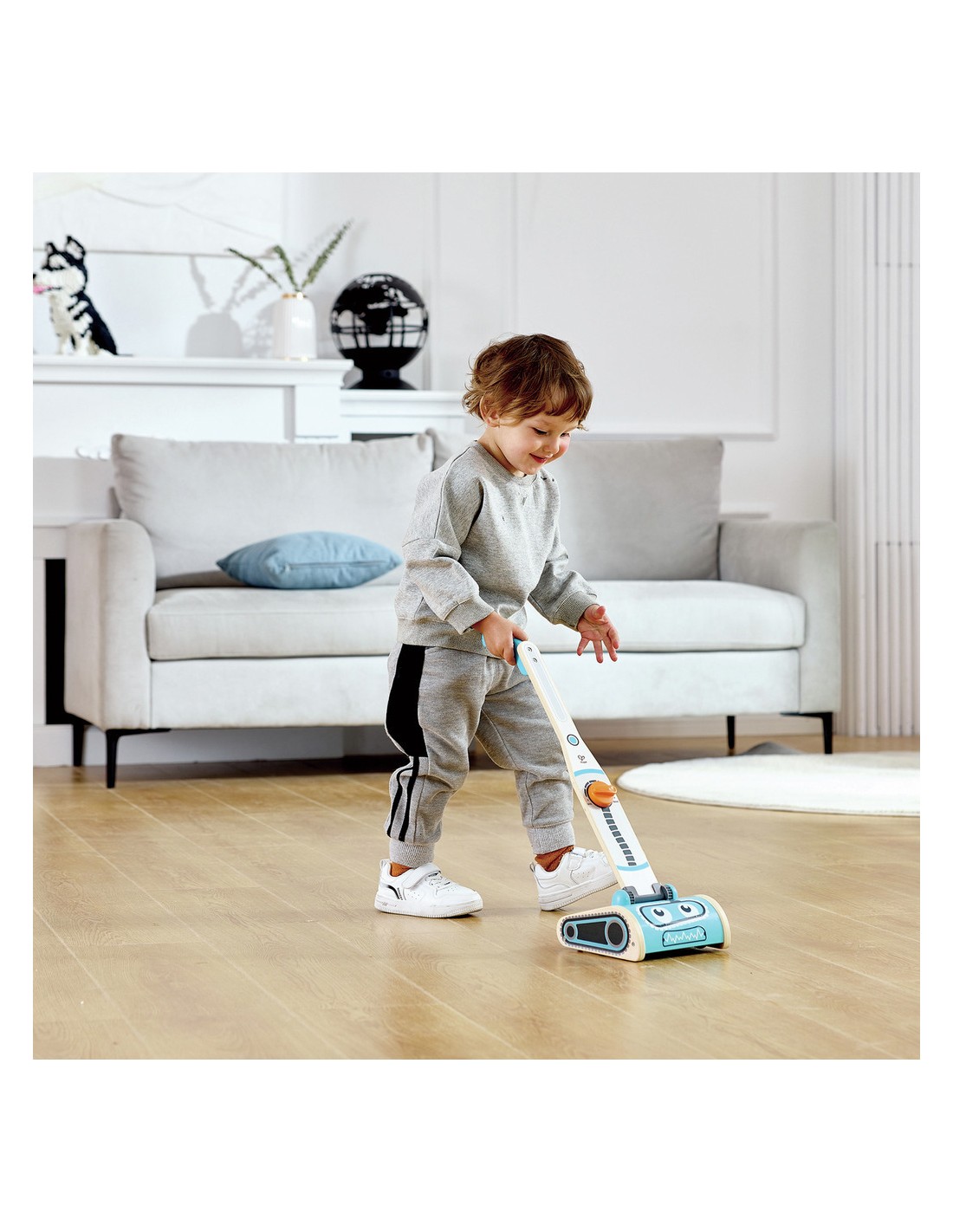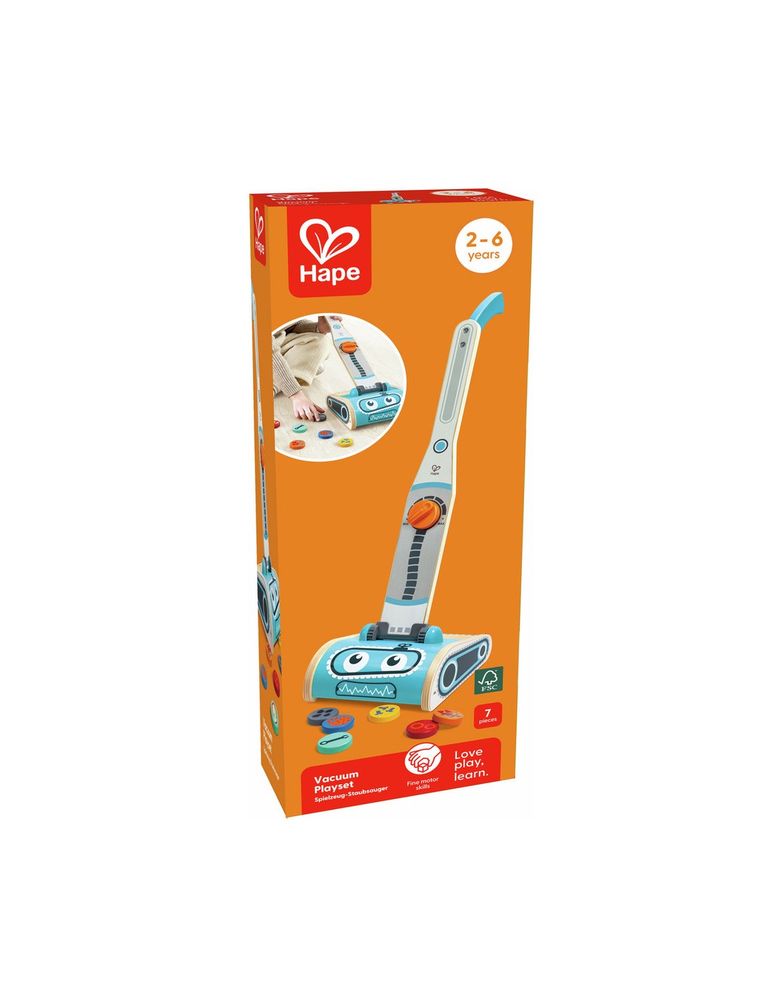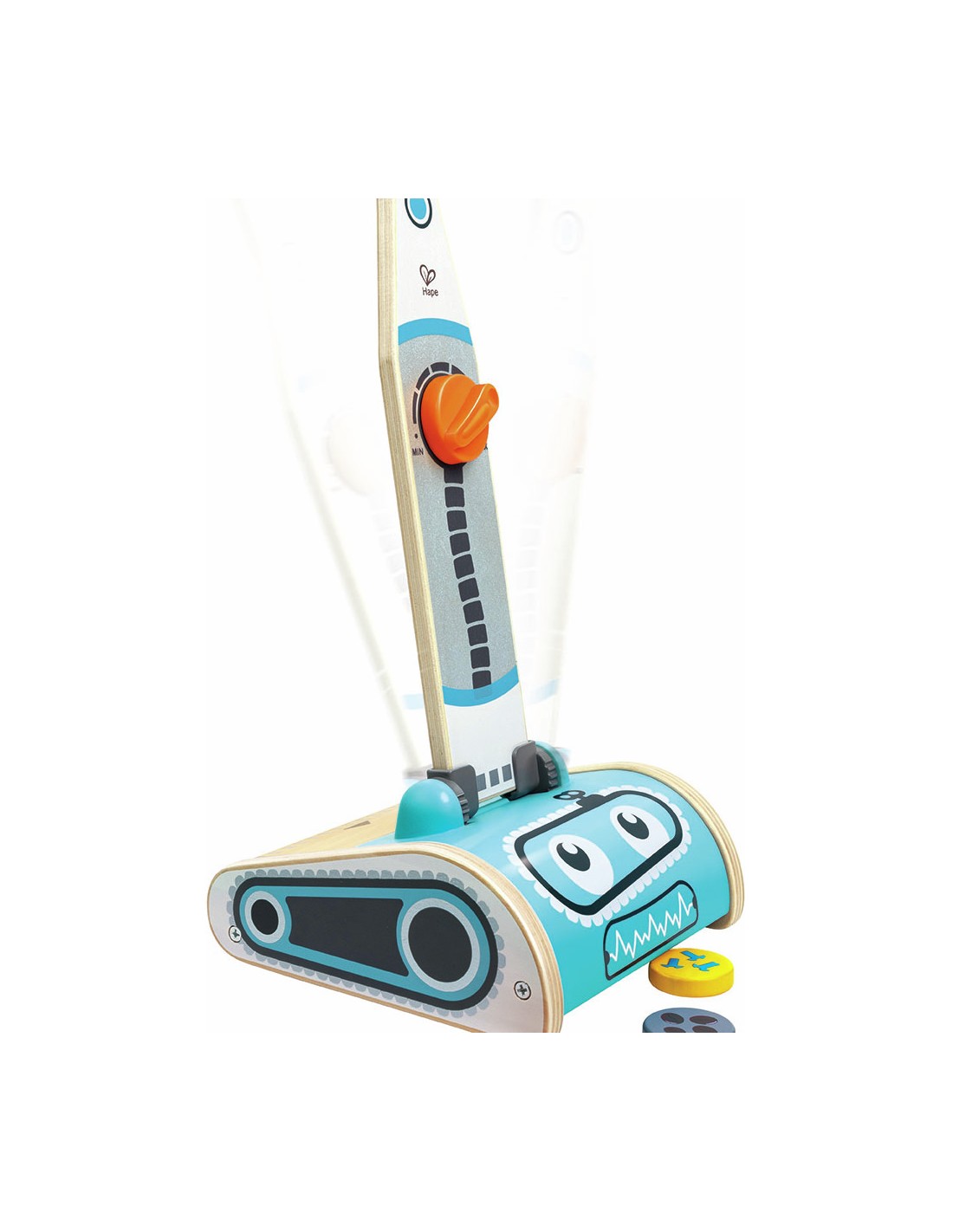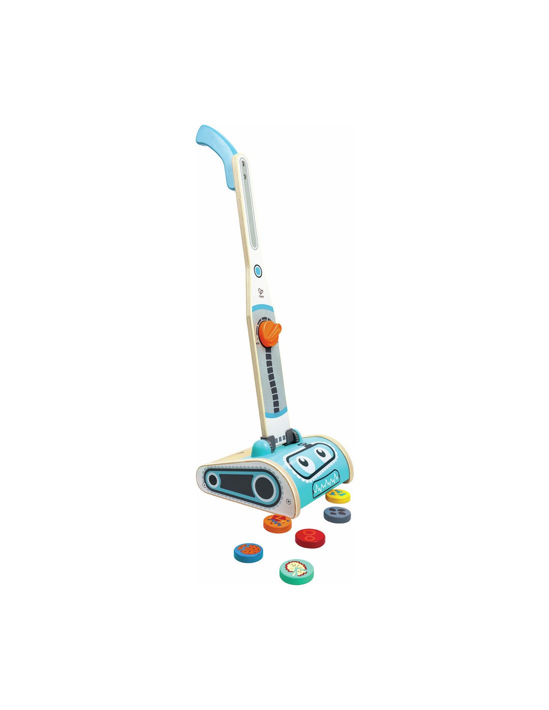 Gardez tout propre et bien rangé avec ce superbe aspirateur jouet. Avec son drôle de visage de robot, l'aspirateur peut réellement aspirer les six petites taches de saleté.