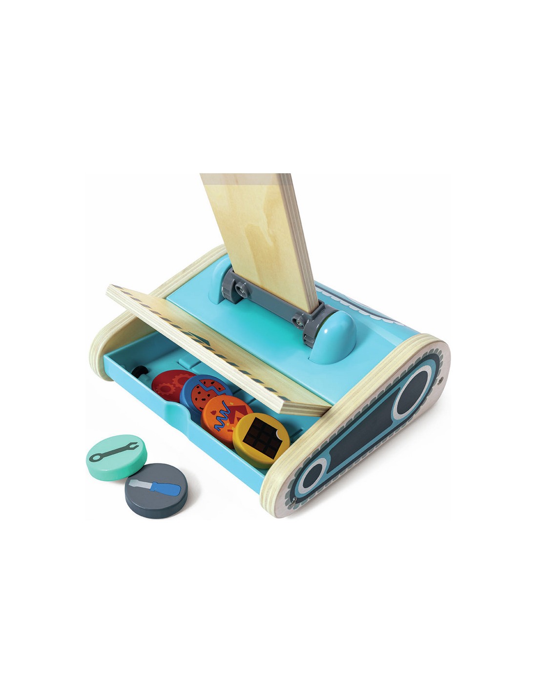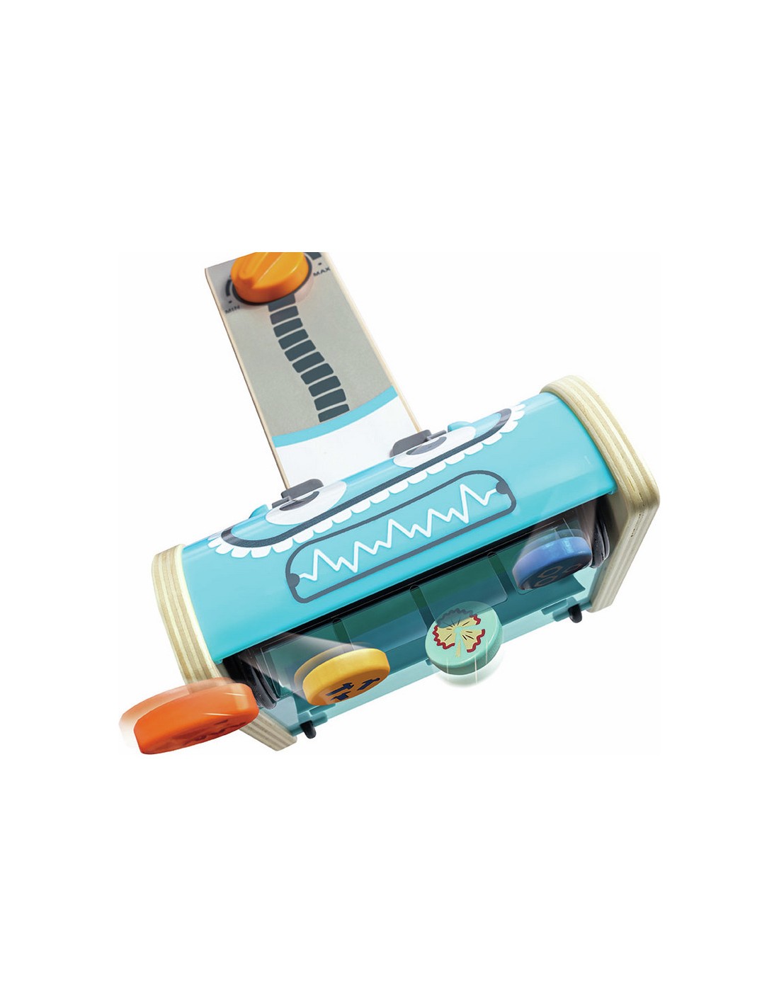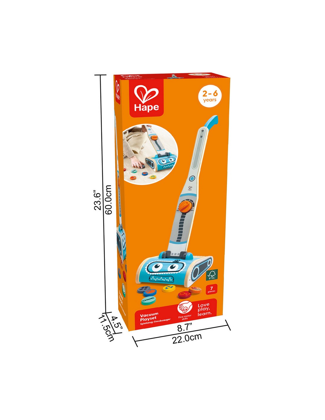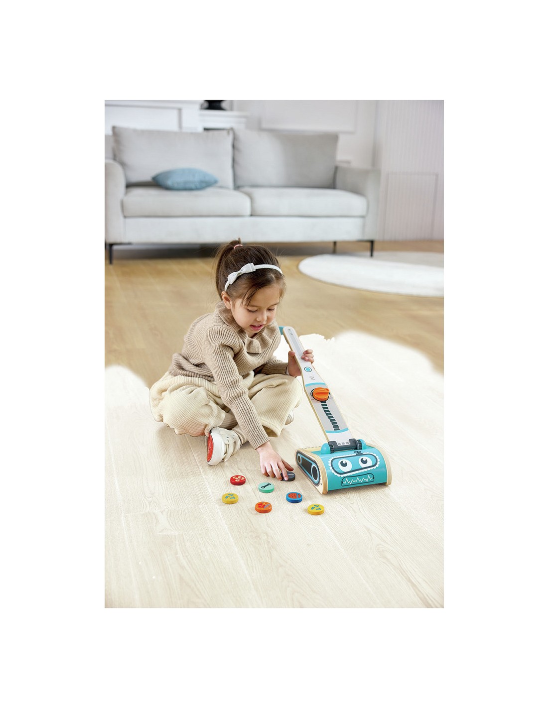 Gardez tout propre et bien rangé avec ce superbe aspirateur jouet. Avec son drôle de visage de robot, l'aspirateur peut réellement aspirer les six petites taches de saleté.