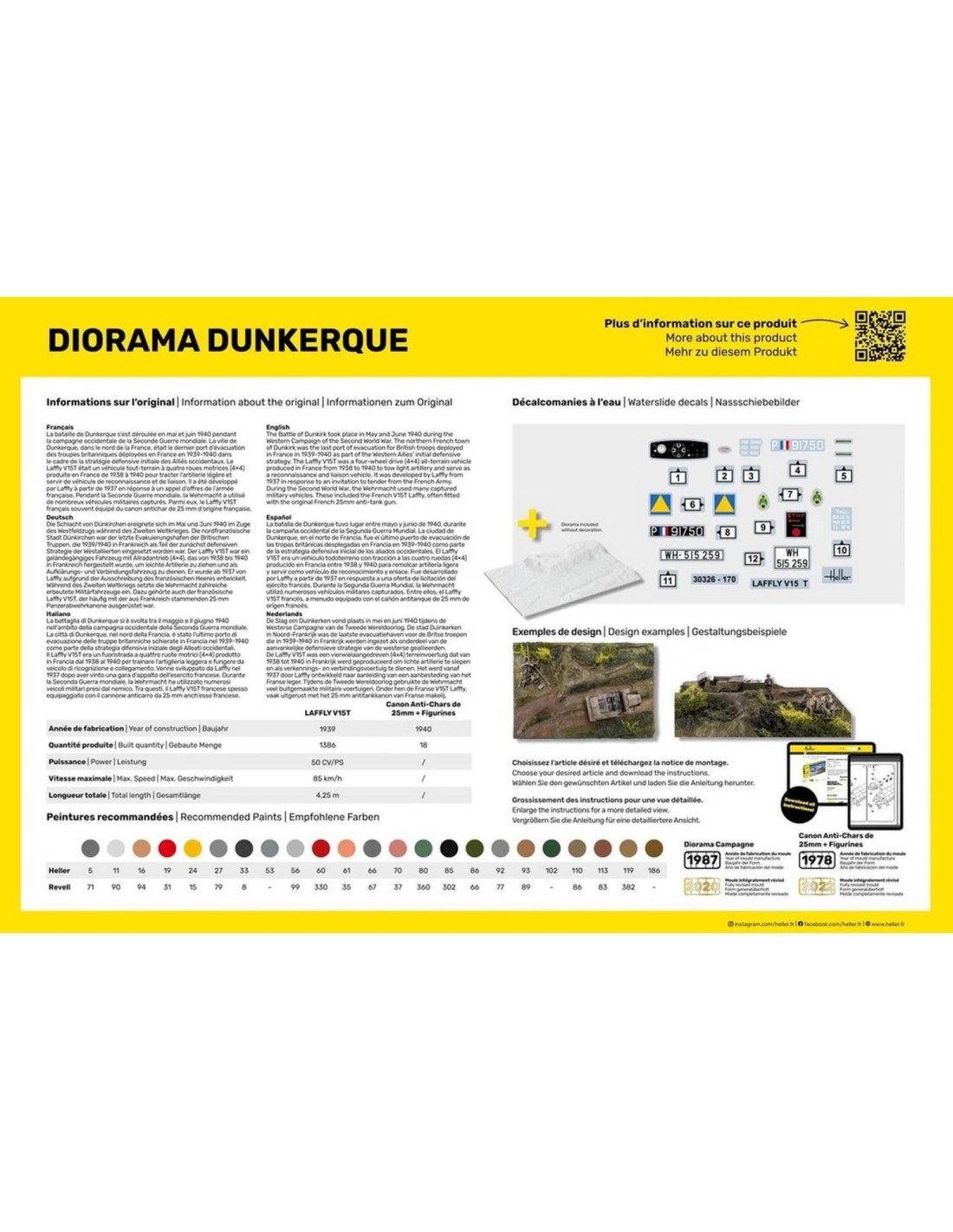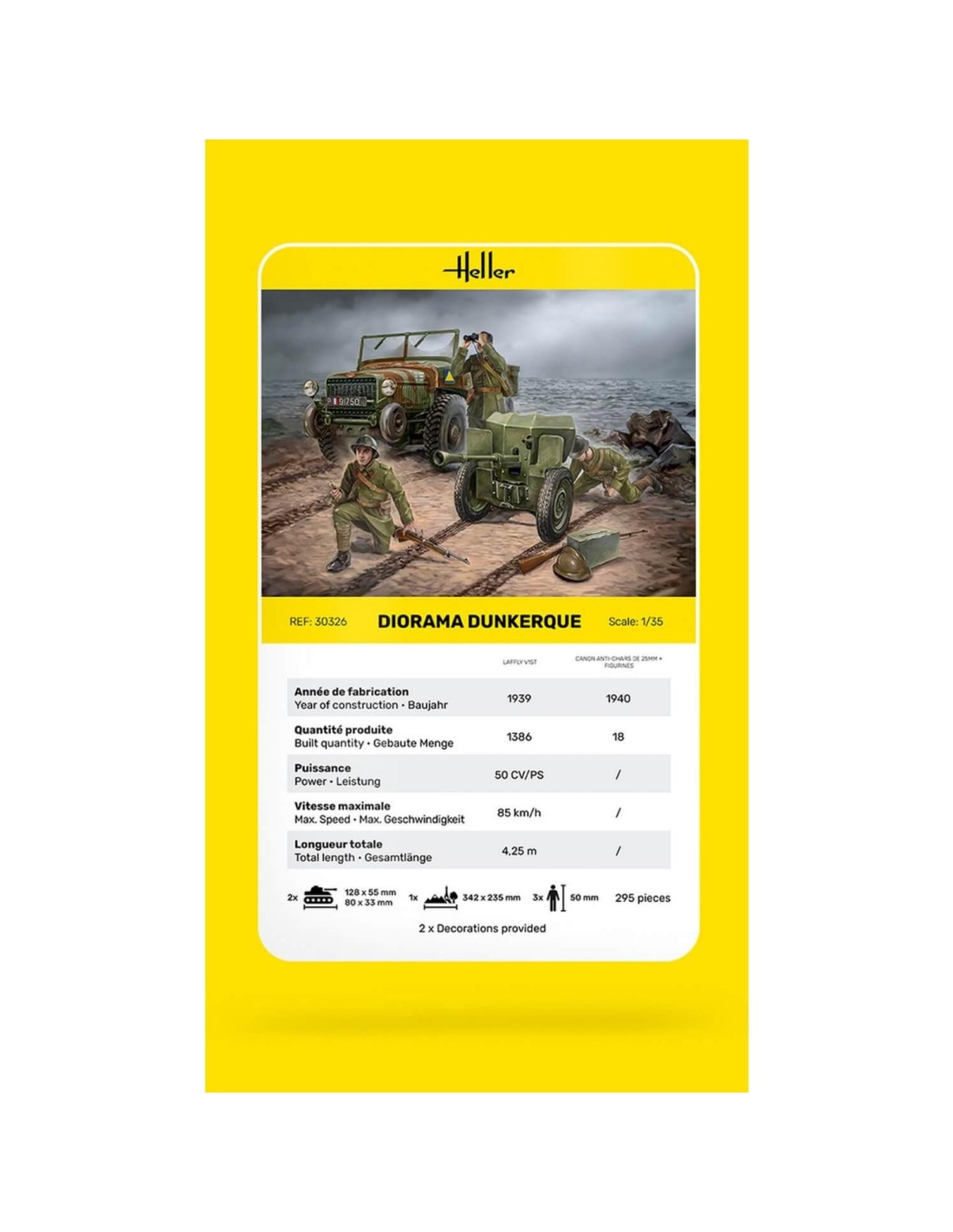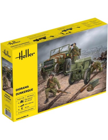 La bataille de Dunkerque s‘est déroulée en mai et juin 1940 pendant la campagne occidentale de la Seconde Guerre mondiale. La ville de Dunkerque, dans le nord de la France, était le dernier port d‘évacuation des troupes britanniques déployées en France en 1939-1940 dans le cadre de la stratégie défensive initiale des Alliés occidentaux. Le Laffly V15T était un véhicule tout-terrain à quatre roues motrices (4×4) produite en France de 1938 à 1940 pour tracter l‘artillerie légère et servir de véhicule de reconnaissance et de liaison. Il a été développé par Laffly à partir de 1937 en réponse à un appel d‘offres de l‘armée française. Pendant la Seconde Guerre mondiale, la Wehrmacht a utilisé de nombreux véhicules militaires capturés. Parmi eux, le Laffly V15T français souvent équipé du canon antichar de 25 mm d‘origine française.- Type de produit : Diorama Militaire