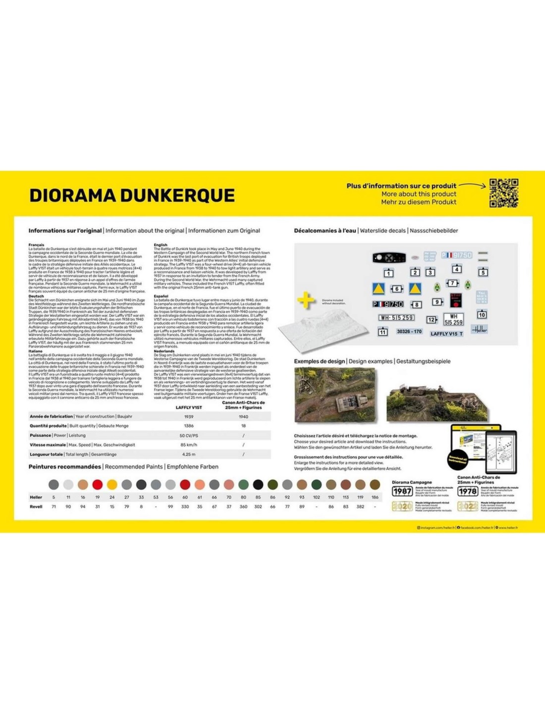 Inclus Colle · Pinceau · Peintures principalesLa bataille de Dunkerque s‘est déroulée en mai et juin 1940 pendant la campagne occidentale de la Seconde Guerre mondiale. La ville de Dunkerque, dans le nord de la France, était le dernier port d‘évacuation des troupes britanniques déployées en France en 1939-1940 dans le cadre de la stratégie défensive initiale des Alliés occidentaux. Le Laffly V15T était un véhicule tout-terrain à quatre roues motrices (4×4) produite en France de 1938 à 1940 pour tracter l‘artillerie légère et servir de véhicule de reconnaissance et de liaison. Il a été développé par Laffly à partir de 1937 en réponse à un appel d‘offres de l‘armée française. Pendant la Seconde Guerre mondiale, la Wehrmacht a utilisé de nombreux véhicules militaires capturés. Parmi eux, le Laffly V15T français souvent équipé du canon antichar de 25 mm d‘origine française.- Type de produit : Diorama Militaire