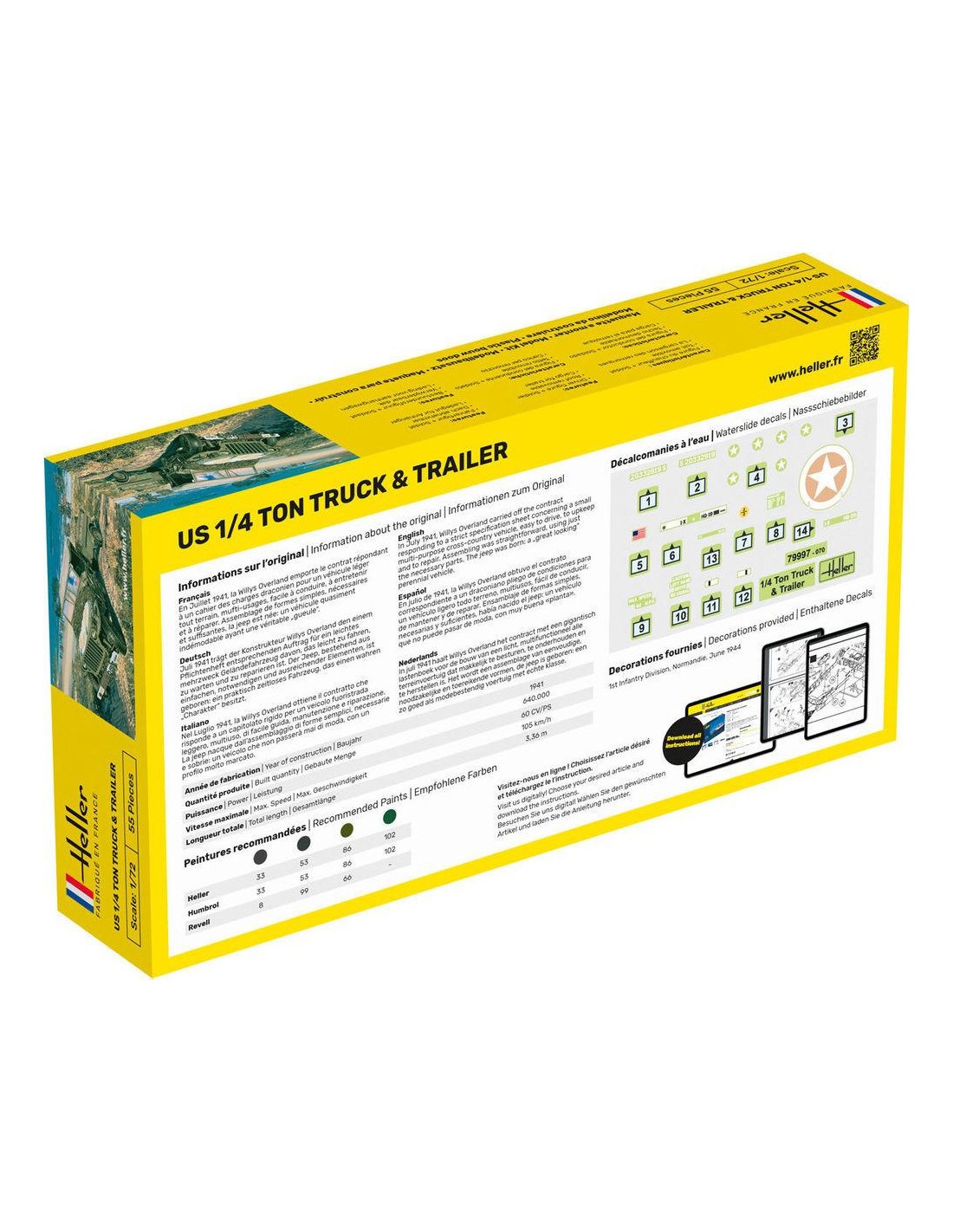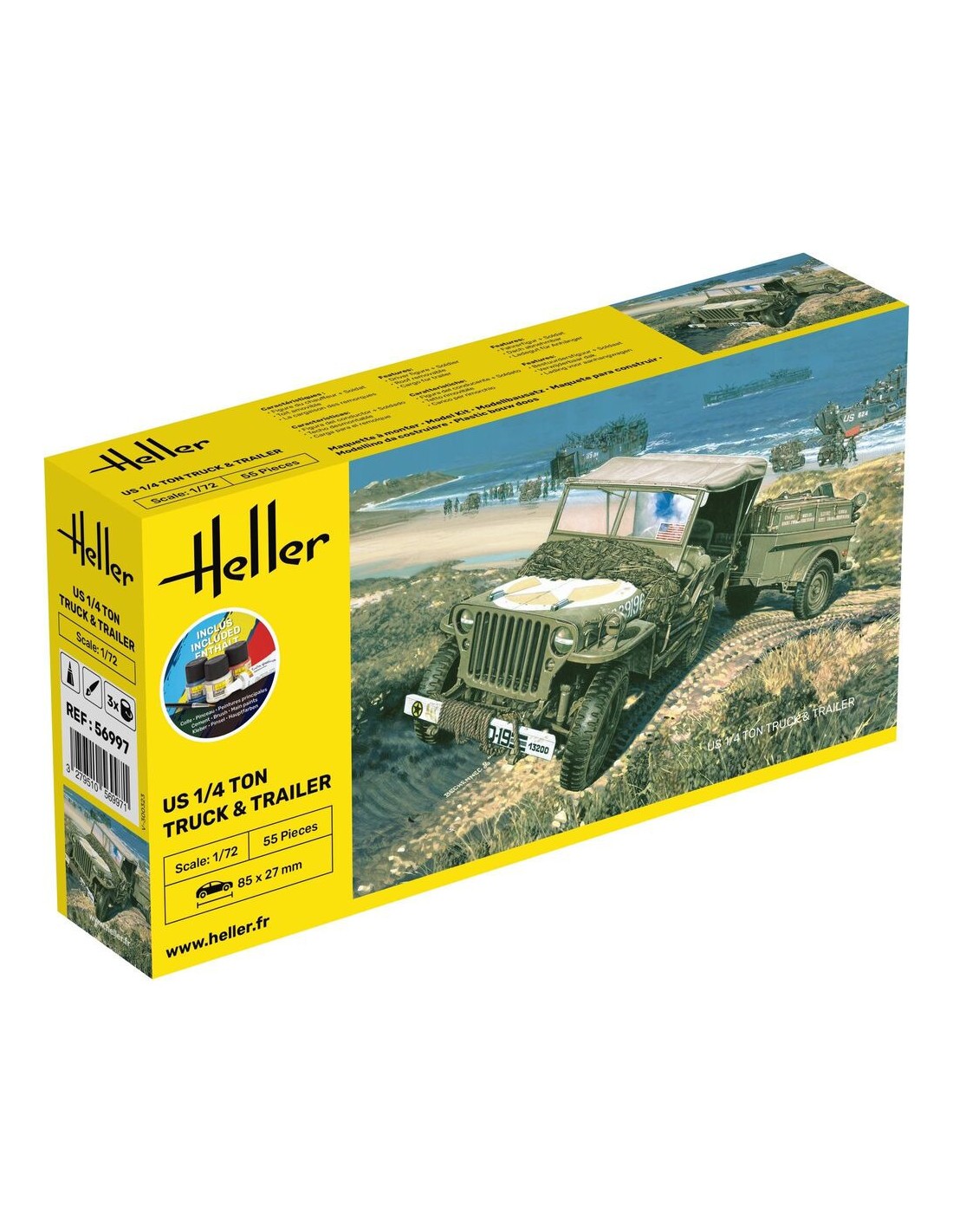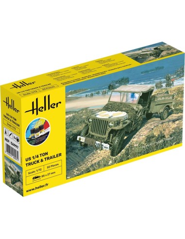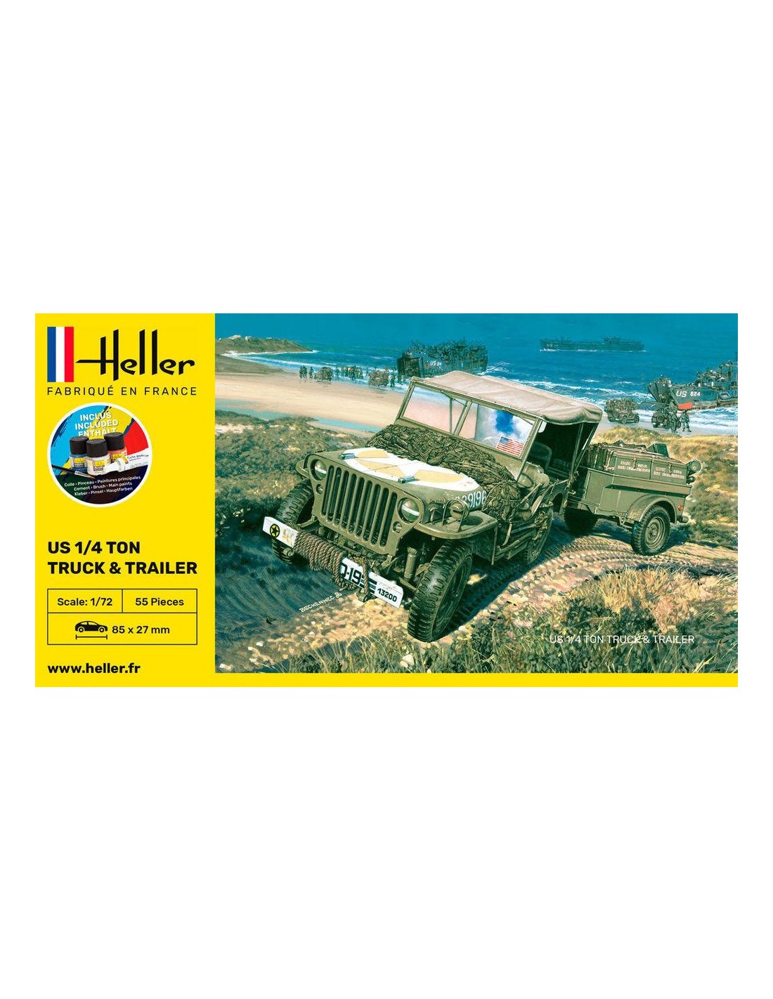 Maquette véhicule militaire - Kit de démarrage - Us 1/4 Ton Truck & Trailer 1:72 - Starter Kit (Kit de démarrage tout inclus : colle, pinceau, peintures) - Heller 56997