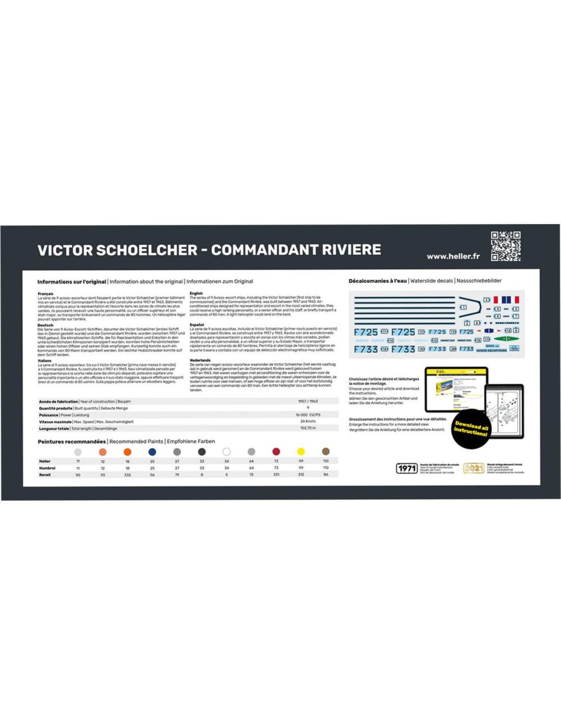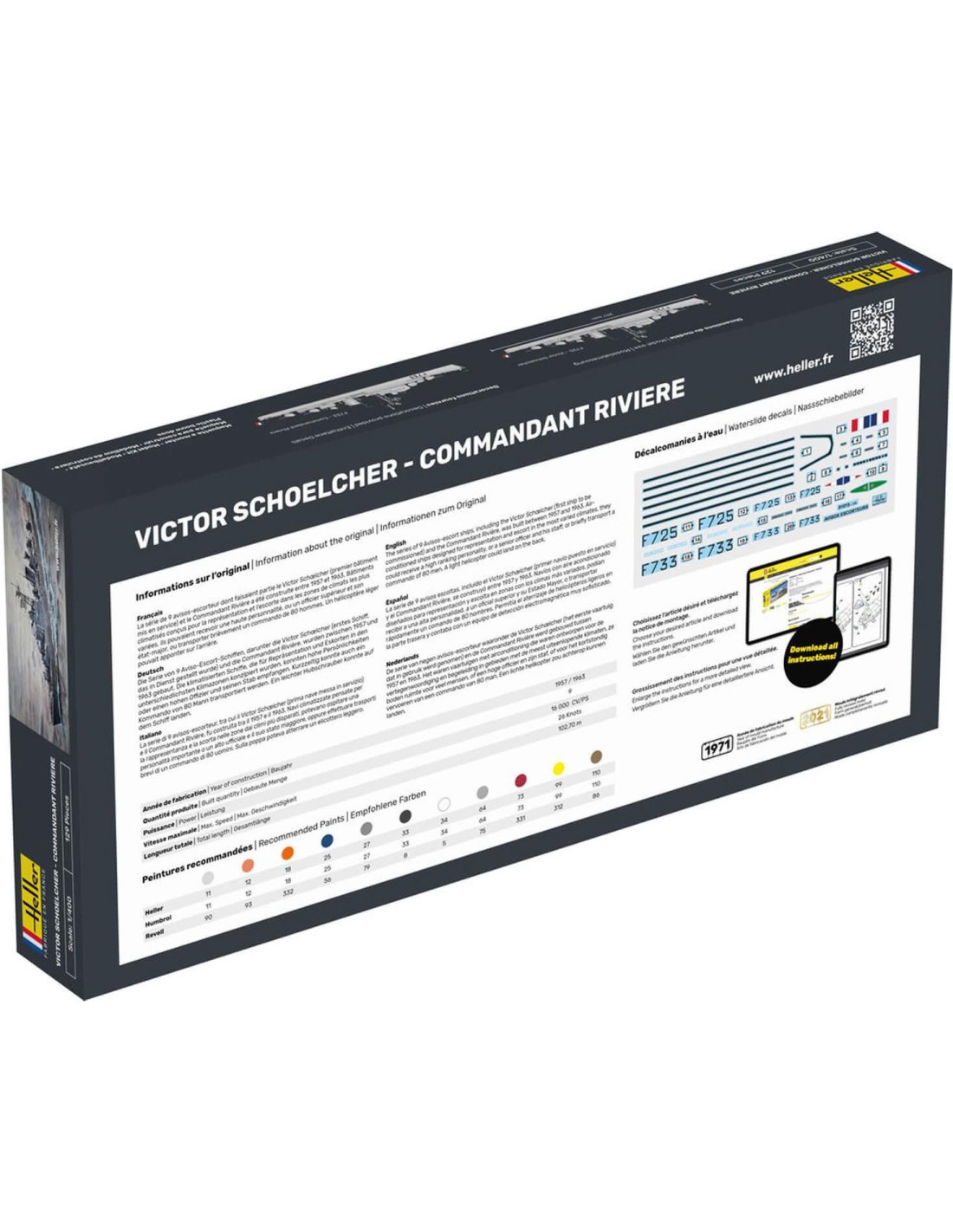 Inclus Colle · Pinceau · Peintures principalesLa série de 9 avisos-escorteur dont faisaient partie le Victor Schœlcher (premier bâtiment mis en service) et le Commandant Rivière a été construite entre 1957 et 1963. Bâtiments climatisés conçus pour la représentation et l‘escorte dans les zones de climats les plus variées, ils pouvaient recevoir une haute personnalité, ou un officier supérieur et son état-major, ou transporter brièvement un commando de 80 hommes. Un hélicoptère léger pouvait apponter sur l‘arrière.- Type de produit : Maquette bateau