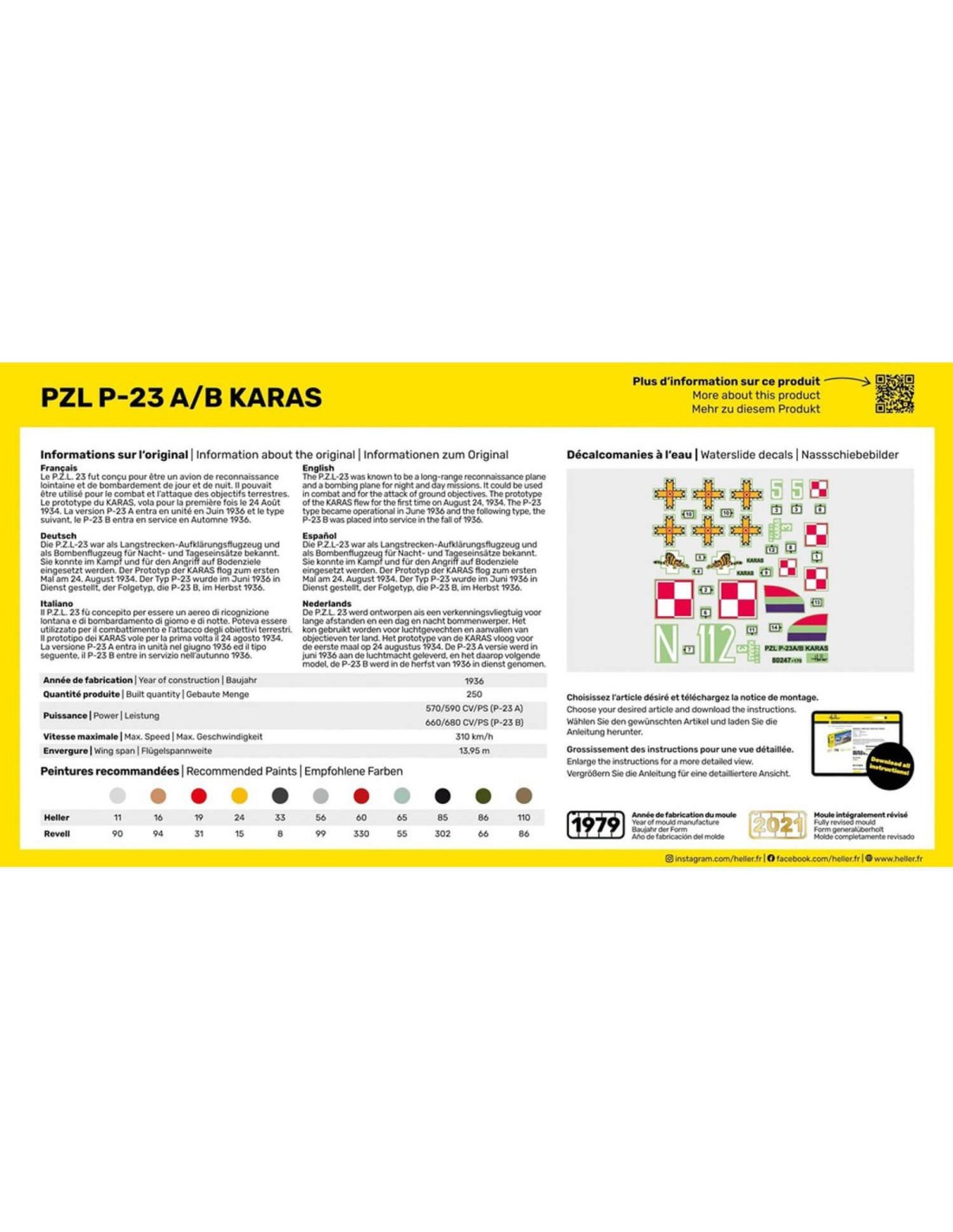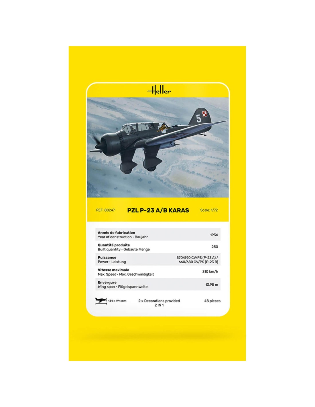 Le P.Z.L. 23 fut conçu pour être un avion de reconnaissance lointaine et de bombardement de jour et de nuit. Il pouvait être utilisé pour le combat et l‘attaque des objectifs terrestres. Le prototype du Karas, vola pour la première fois le 24 Août 1934. La version P-23 A entra en unité en Juin 1936 et le type suivant, le P-23 B entra en service en Automne 1936.- Type de produit : Maquette d'avion