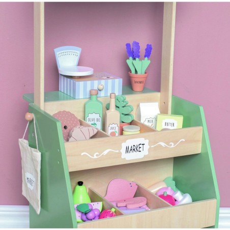 L'étal du marché se compose de 42 parties : 1 stand de marché, 2 sacs en tissu, 1 balance et caisse enregistreuse, 28 accessoires différents, viande, poisson, produits laitiers, fruits, légumes, herbes, pain, 10 pièces de monnaie de différentes valeurs. Le stand du marché a deux roues pour pouvoir être facilement déplacé.