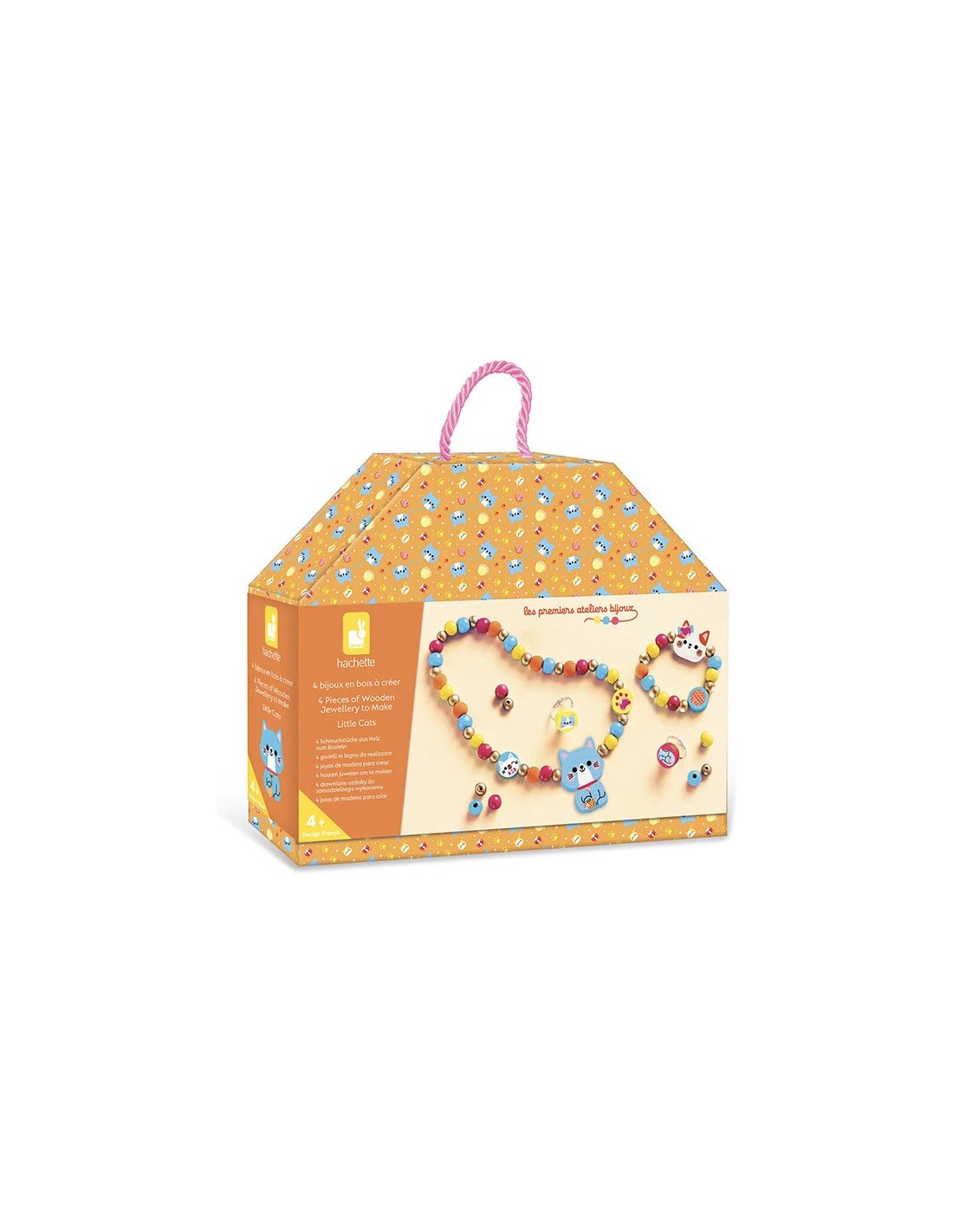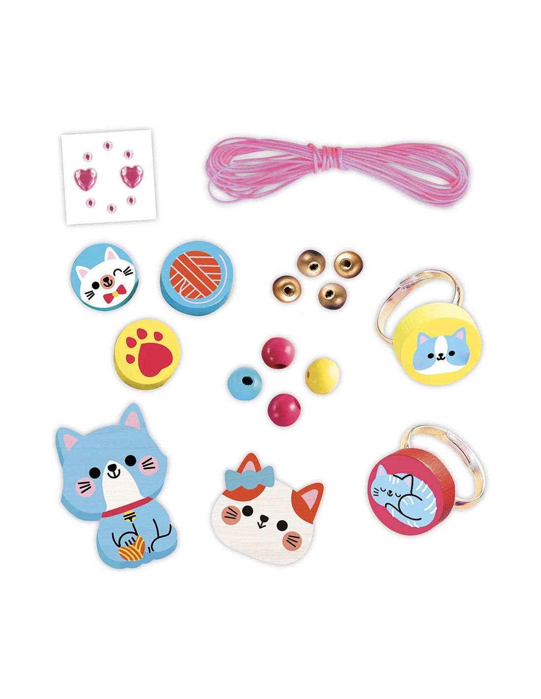 De jolis bijoux en bois à créer soi-même ! Grâce à ce coffret créatif, les enfants dès 4 ans pourront confectionner une parure complète composée de 2 bagues, 1 collier et 1 bracelet. Inspirés par l’univers des petits chats, ces bijoux en bois sont aussi amusants à fabriquer qu’agréables à porter ! En enfilant les perles, les enfants développent leur motricité fine et stimulent leur imagination. Ils apprennent également à créer des enchaînements harmonieux de couleurs et de tailles pour des bijoux uniques et élégants. Le kit comprend : 2 perles en bois silhouettées et imprimées, 3 perles rondes imprimées, 33 perles colorées, 22 perles dorées, 2 bagues avec perles plates imprimées, 1 planche de 8 strass et 1 fil élastique. Un livret explicatif avec modèles est inclus pour guider l’activité, que ce soit en autonomie ou avec l’aide d’un adulte. Le bois, solide et agréable au toucher, associé aux motifs vitaminés et aux touches dorées, donne du caractère à chaque création. Et ce n’est pas tout : la boîte se transforme en un joli petit sac pour ranger ses bijoux ou ses trésors. Alors, parez-vous de vos plus beaux bijoux en perles et profitez de la douce présence des petits chats partout où vous allez !