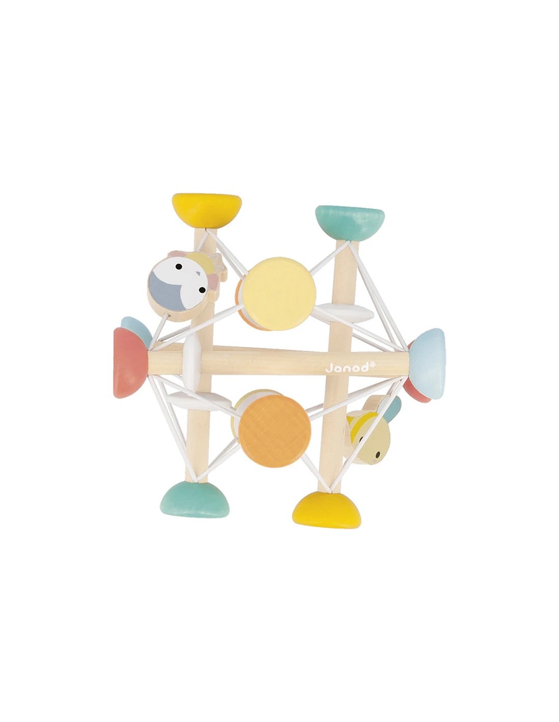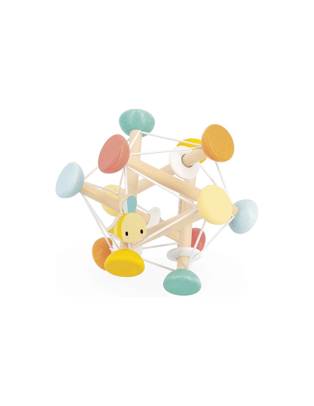 Un oiseau et une petite abeille ont répondu présent pour jouer avec bébé ! Faciles à repérer et à attraper, ils encouragent bébé à tendre la main, à manipuler et à explorer la balle sous tous les angles. Cette balle se compose de tiges en bois, chacune terminée par une perle blanche ou colorée.