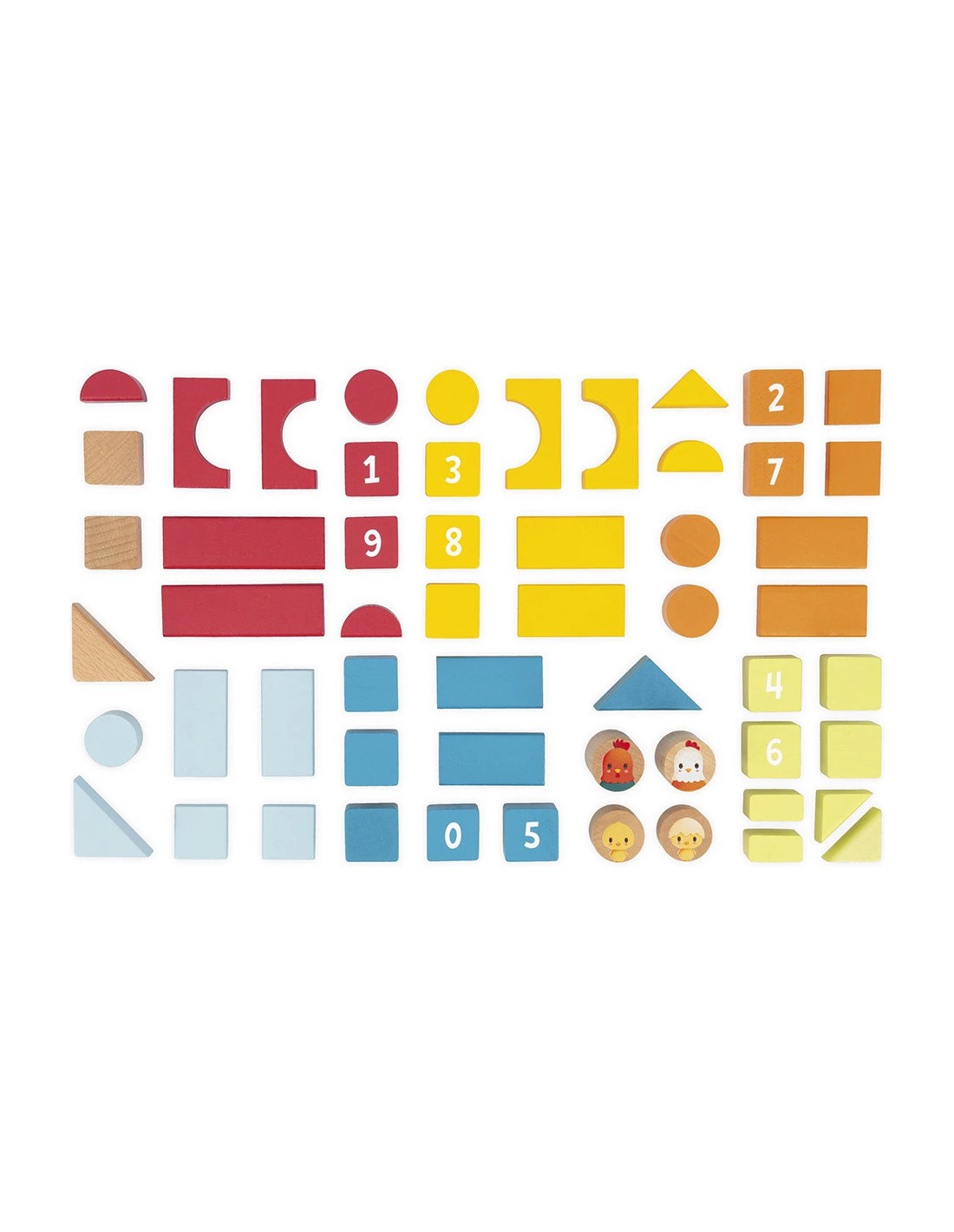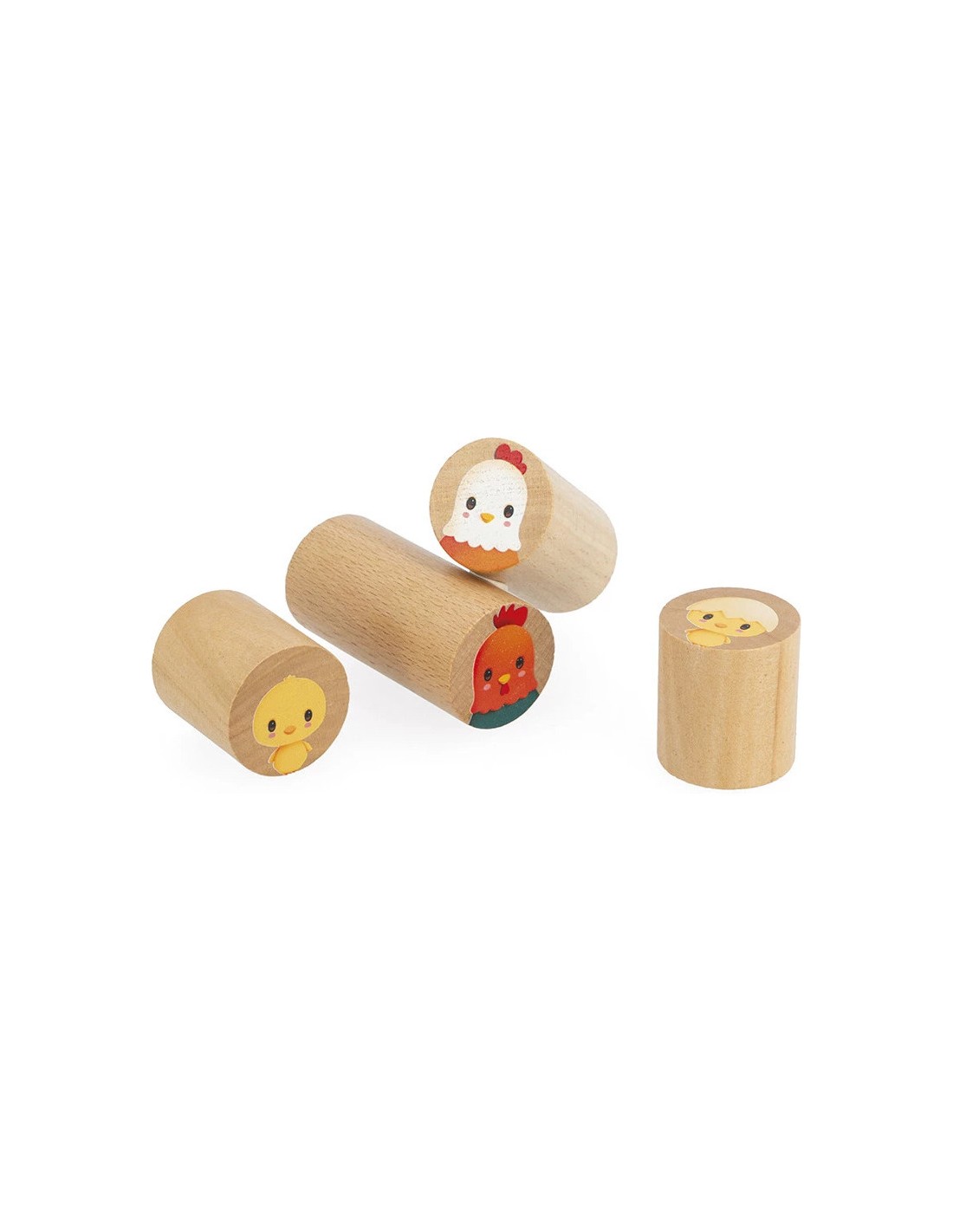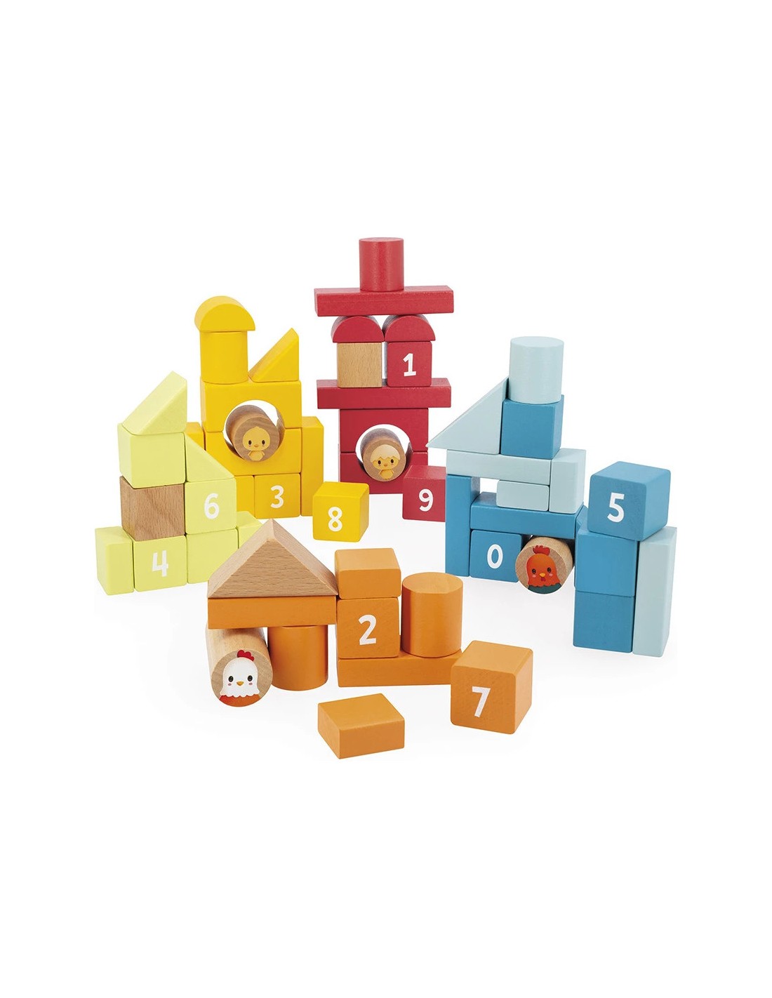 Parmi les pièces se trouvent des illustrations d’animaux de la ferme: une poule, un coq et deux adorables poussins. C'est parfait pour inventer des histoires ! Ce jeu est également évolutif : il accompagne l’enfant dans ses apprentissages grâce à des cubes numérotés de 0 à 9 qui permettent de se familiariser avec les chiffres et d’apprendre à compter tout en s’amusant.