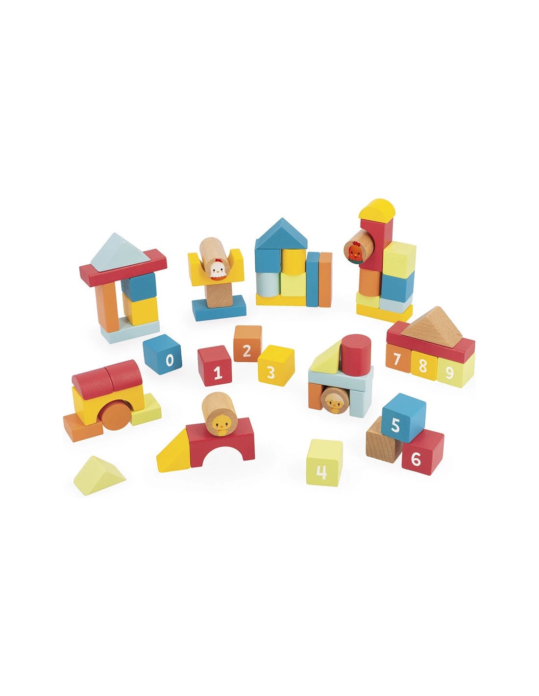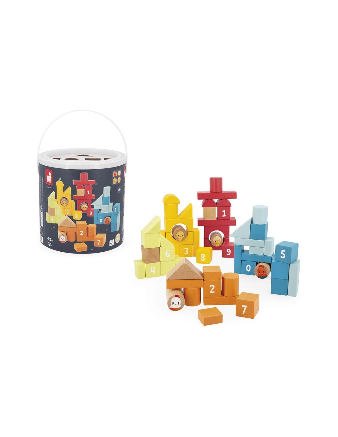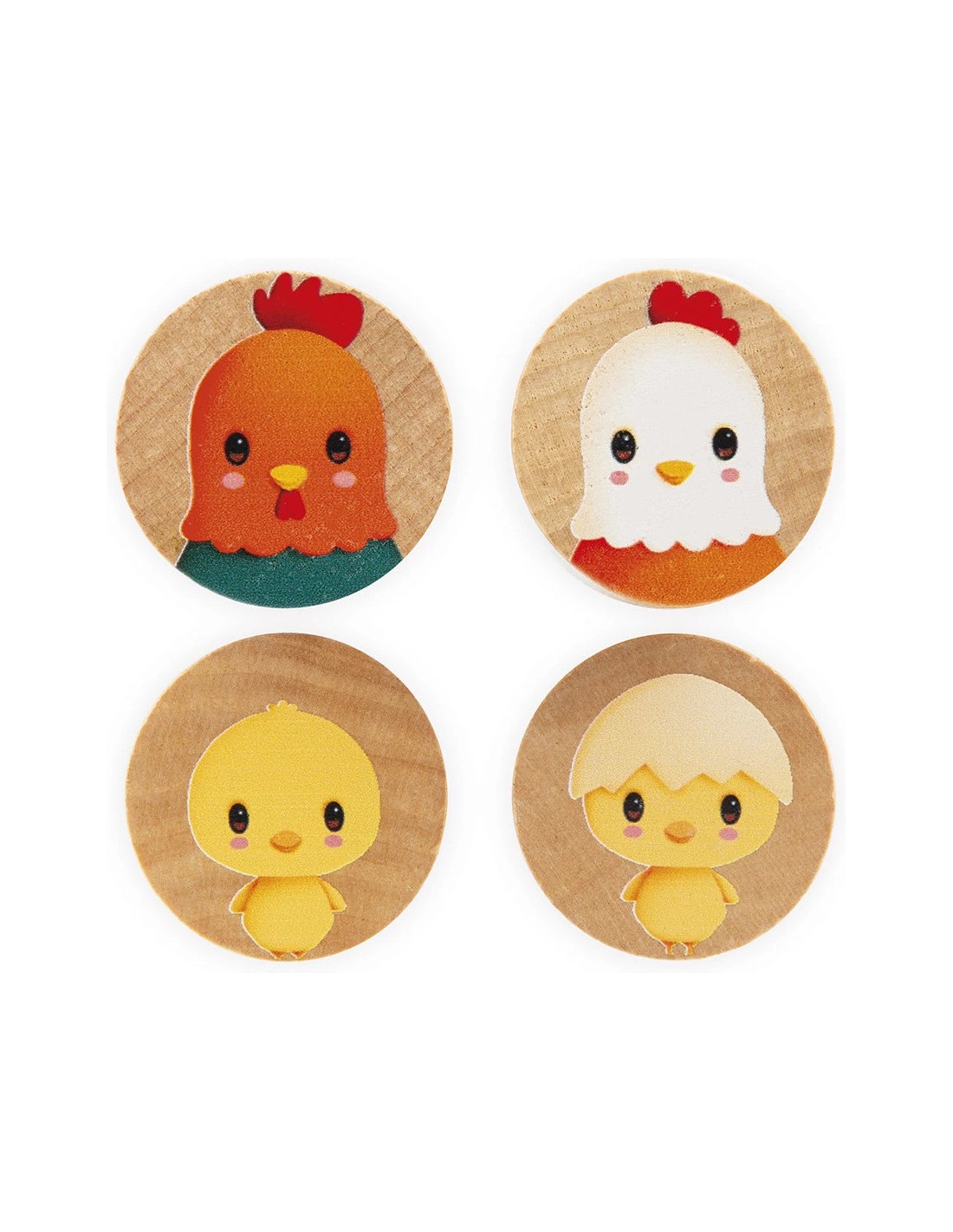 Parmi les pièces se trouvent des illustrations d’animaux de la ferme: une poule, un coq et deux adorables poussins. C'est parfait pour inventer des histoires ! Ce jeu est également évolutif : il accompagne l’enfant dans ses apprentissages grâce à des cubes numérotés de 0 à 9 qui permettent de se familiariser avec les chiffres et d’apprendre à compter tout en s’amusant.