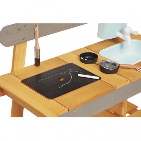 Ce véritable laboratoire de découverte de la nature est parfaitement équipé pour satisfaire tous les aventuriers des jardins grâce à ses 2 éviers et 2 petits pots amovibles en plastique permettant de partir à la recherche d'ingrédients de potions secrètes ! Un vrai robinet permet de passer au nettoyage facilement : il suffit de le remplir le bac puis d’ouvrir le robinet de droite à gauche pour laisser l’eau s’écouler !
