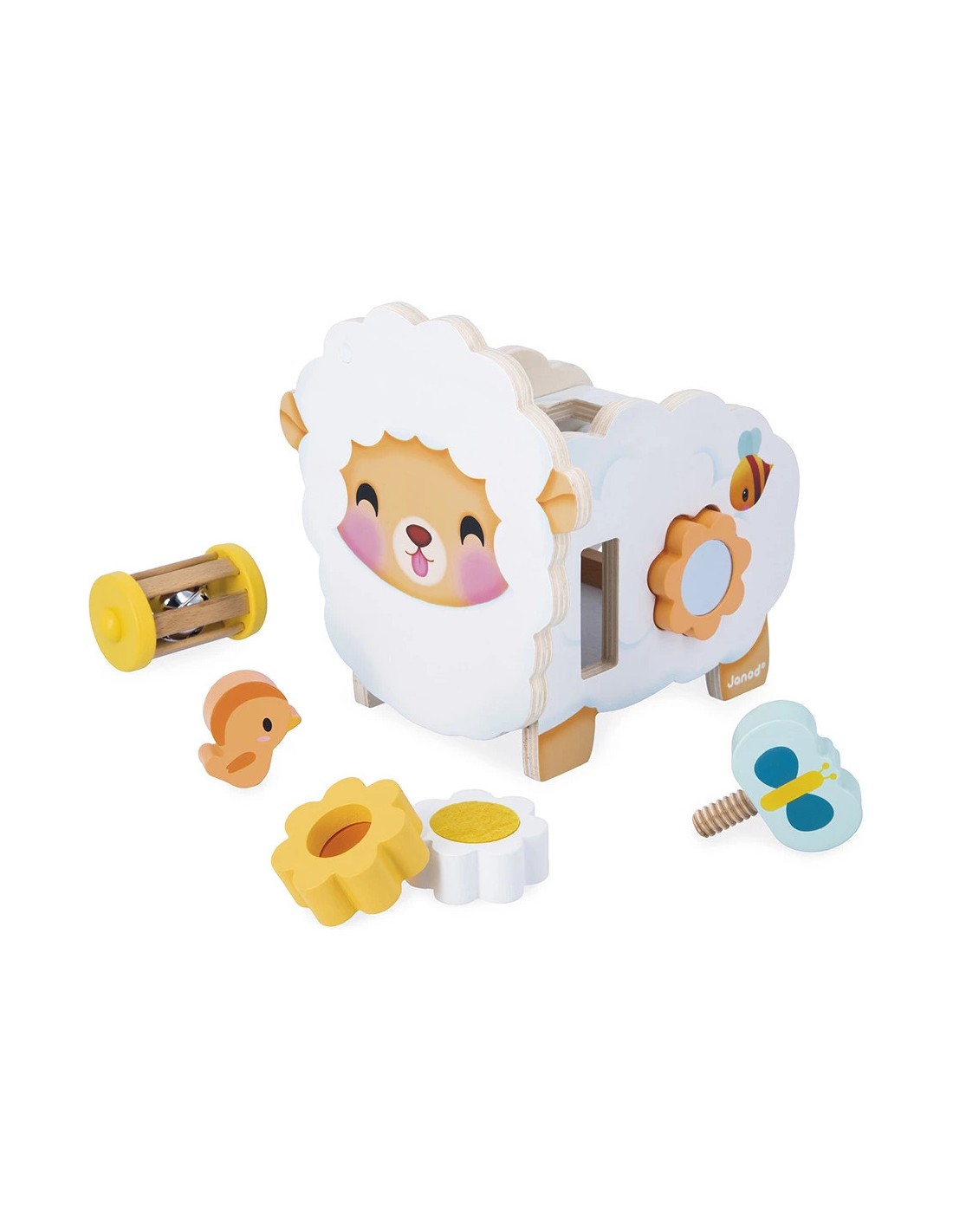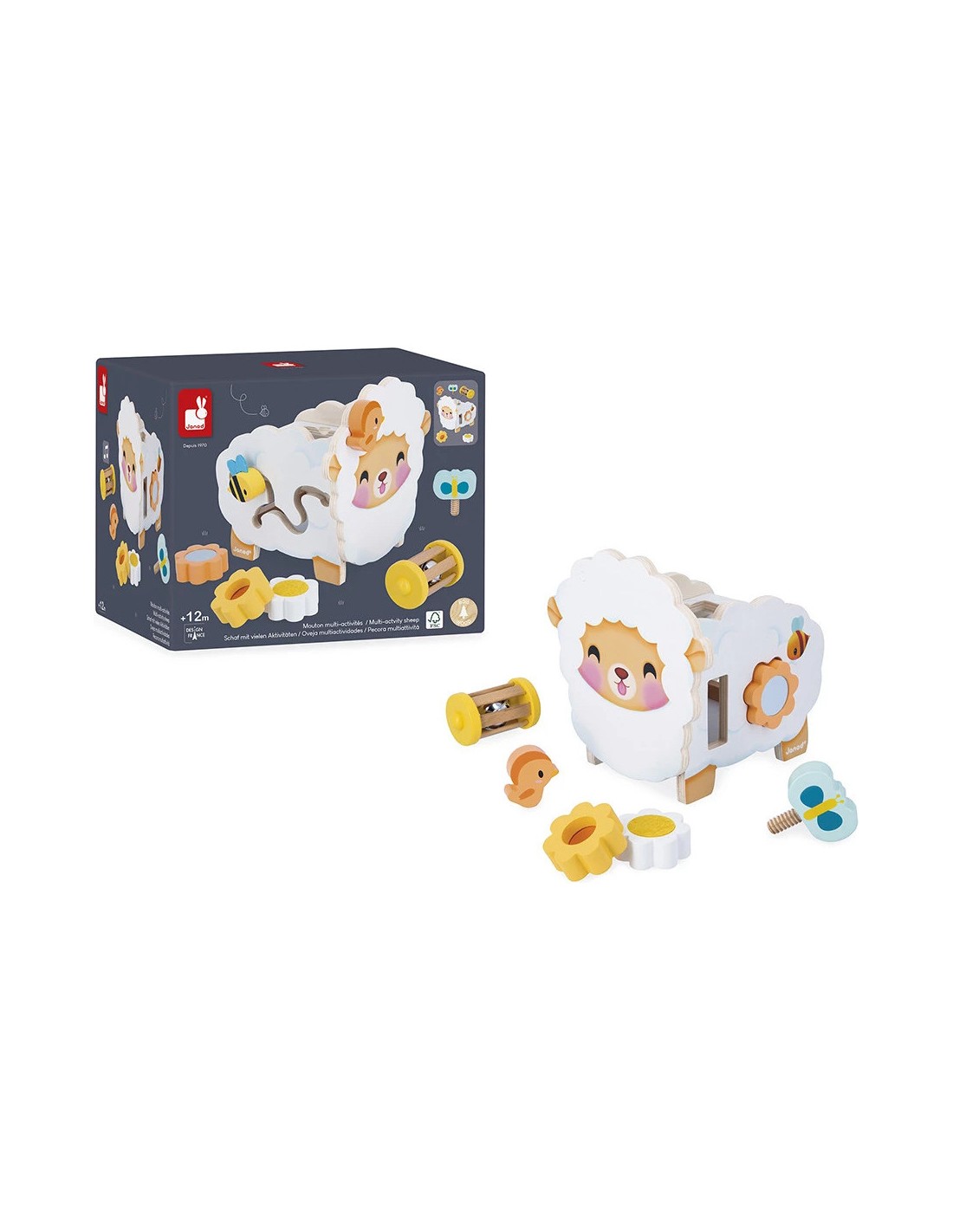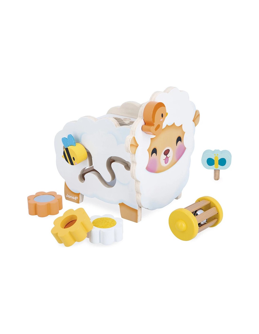 Qu'il est mignon ce mouton en bois à l'allure champêtre ! Fleurs, abeille, papillon… toute la nature est au rendez-vous ! Ce mouton multi-activités propose de nombreux jeux qui vont plaire aux enfants dès 12 mois. Sur le devant, niché au niveau de sa tête, se trouve un petit oiseau magnétique que l'enfant peut s'amuser à enlever et à remettre à sa guise.