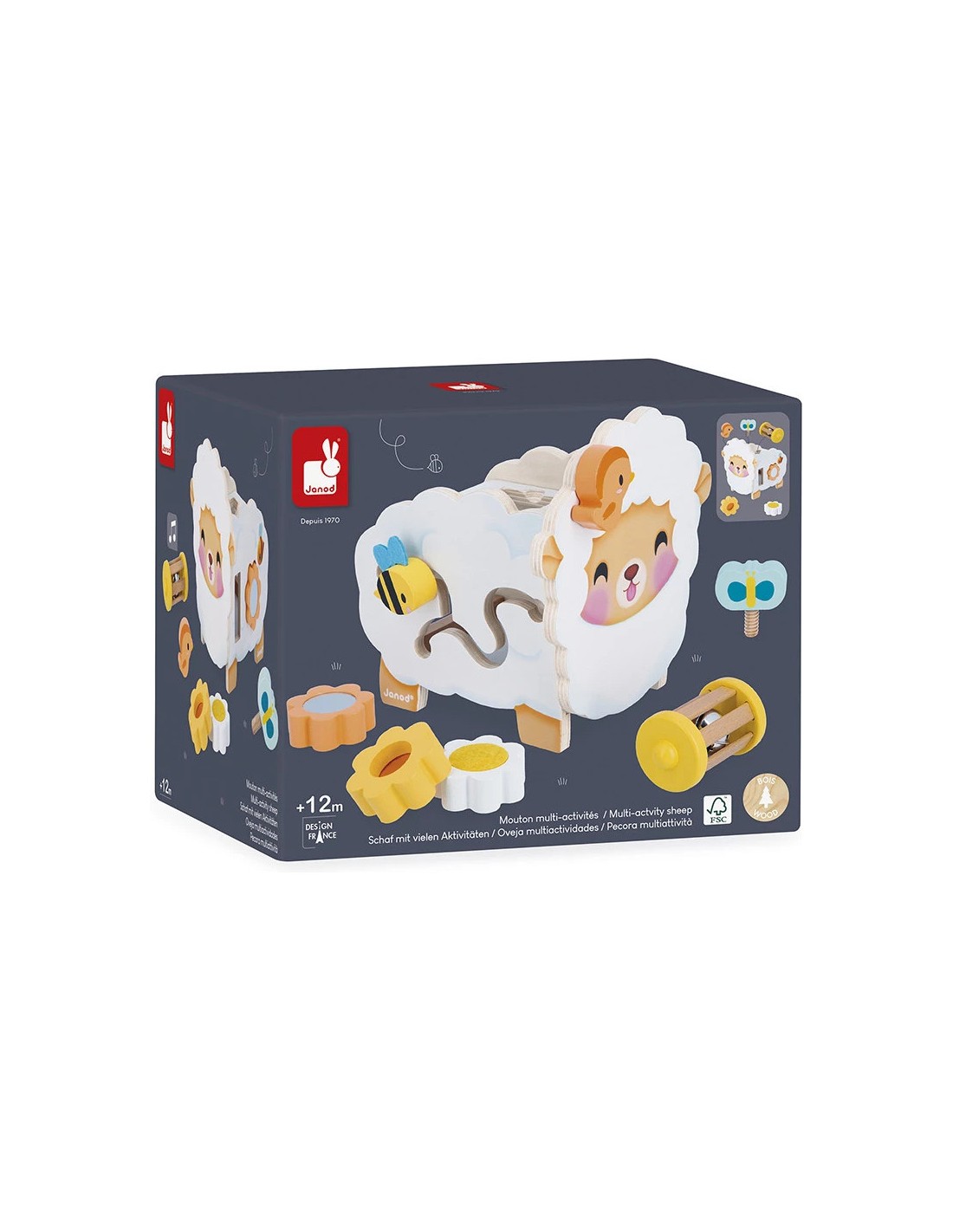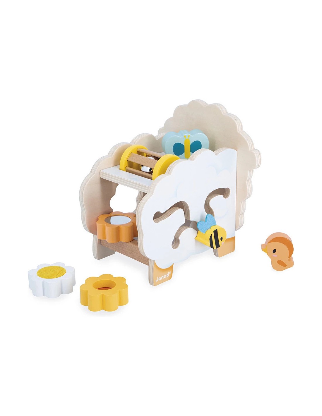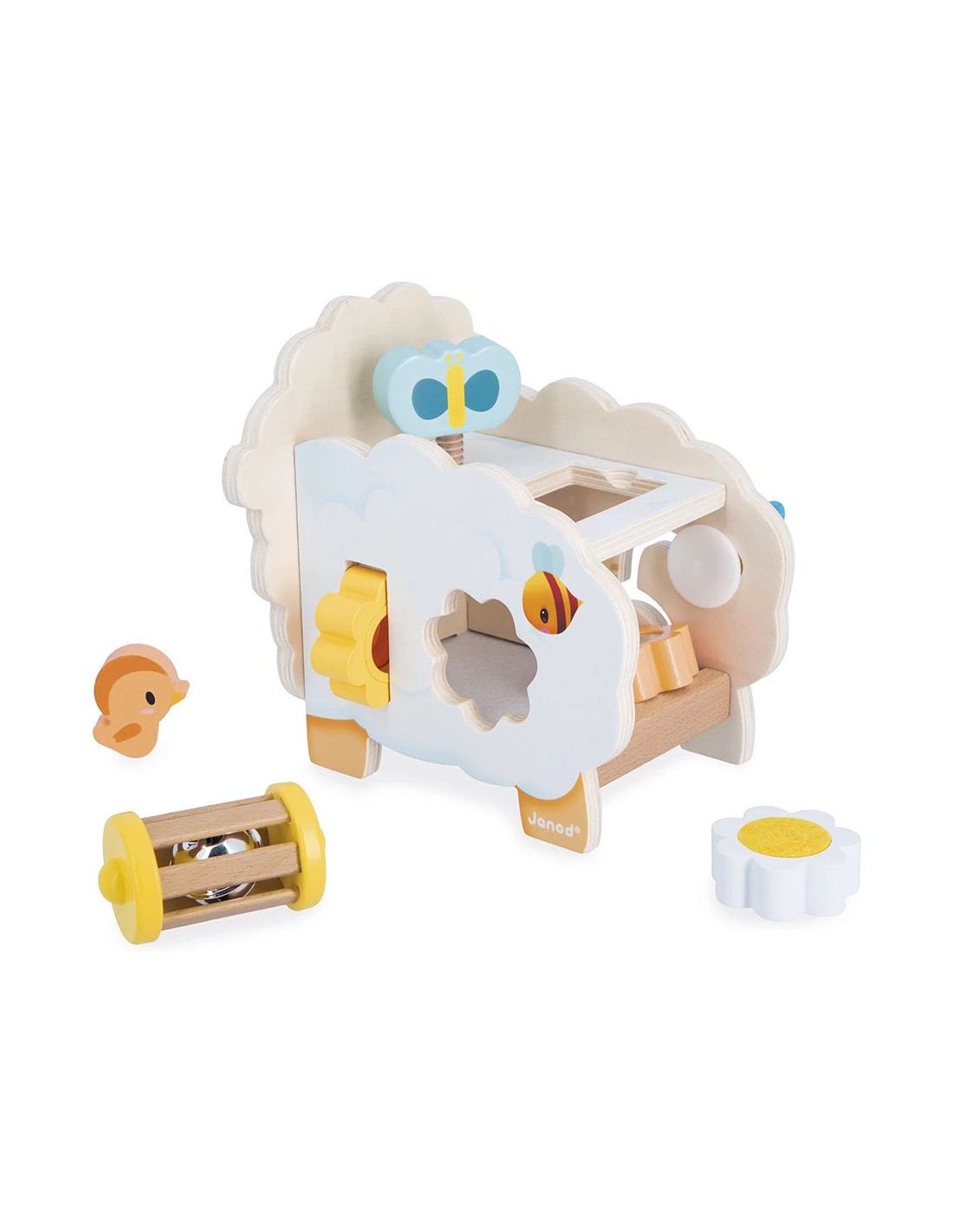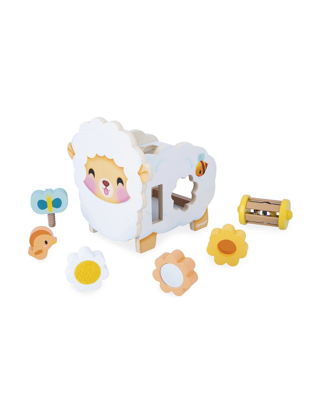 Qu'il est mignon ce mouton en bois à l'allure champêtre ! Fleurs, abeille, papillon… toute la nature est au rendez-vous ! Ce mouton multi-activités propose de nombreux jeux qui vont plaire aux enfants dès 12 mois. Sur le devant, niché au niveau de sa tête, se trouve un petit oiseau magnétique que l'enfant peut s'amuser à enlever et à remettre à sa guise.