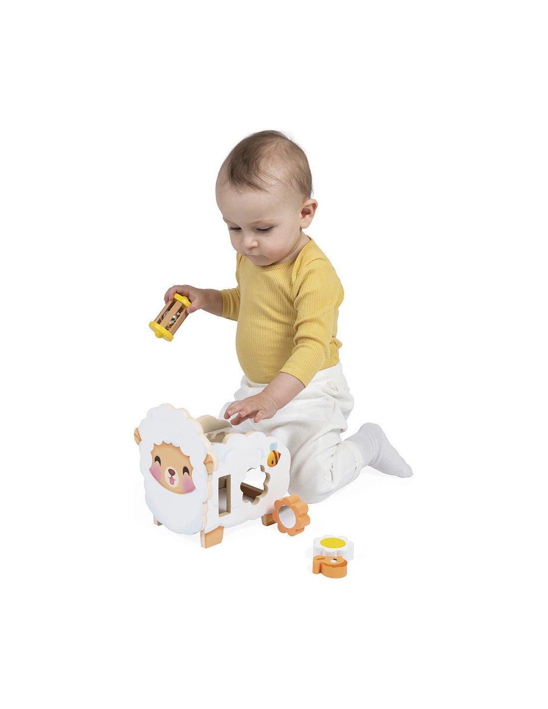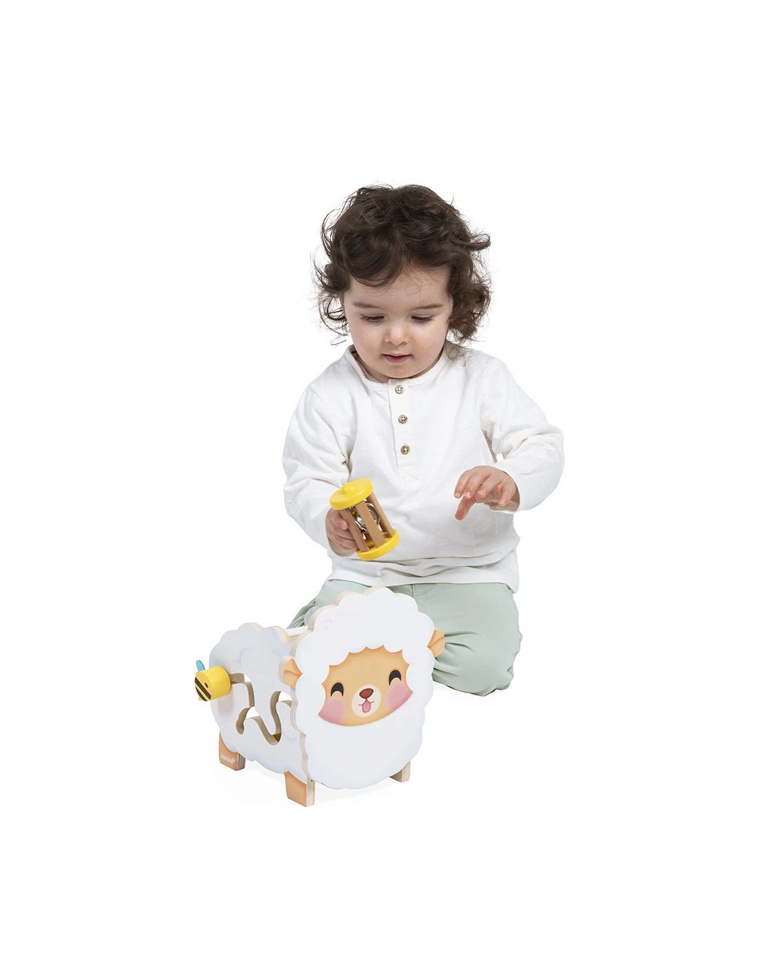 Sur le côté opposé, on retrouve un petit labyrinthe avec une adorable abeille en bois. Le défi pour bébé ? La faire glisser le long de son chemin ! Sur le dos du mouton, on peut y visser un papillon, permettant aux petits de faire leurs premières expériences avec la rotation.