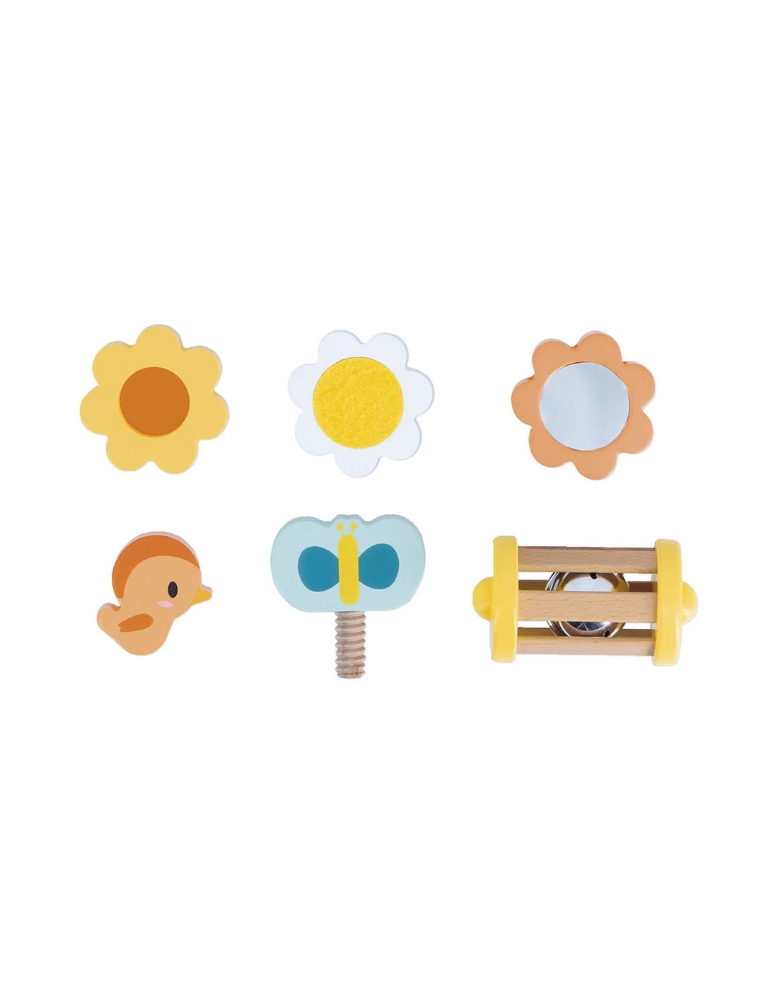 Juste à côté, un petit emplacement est prévu pour accueillir un hochet à grelot : bébé pourra le saisir, le secouer et écouter son doux tintement. C'est parfait pour stimuler l'ouïe dès le plus jeune âge. Malin, les 6 accessoires qui composent ce jouet peuvent aussi se ranger à l'intérieur !