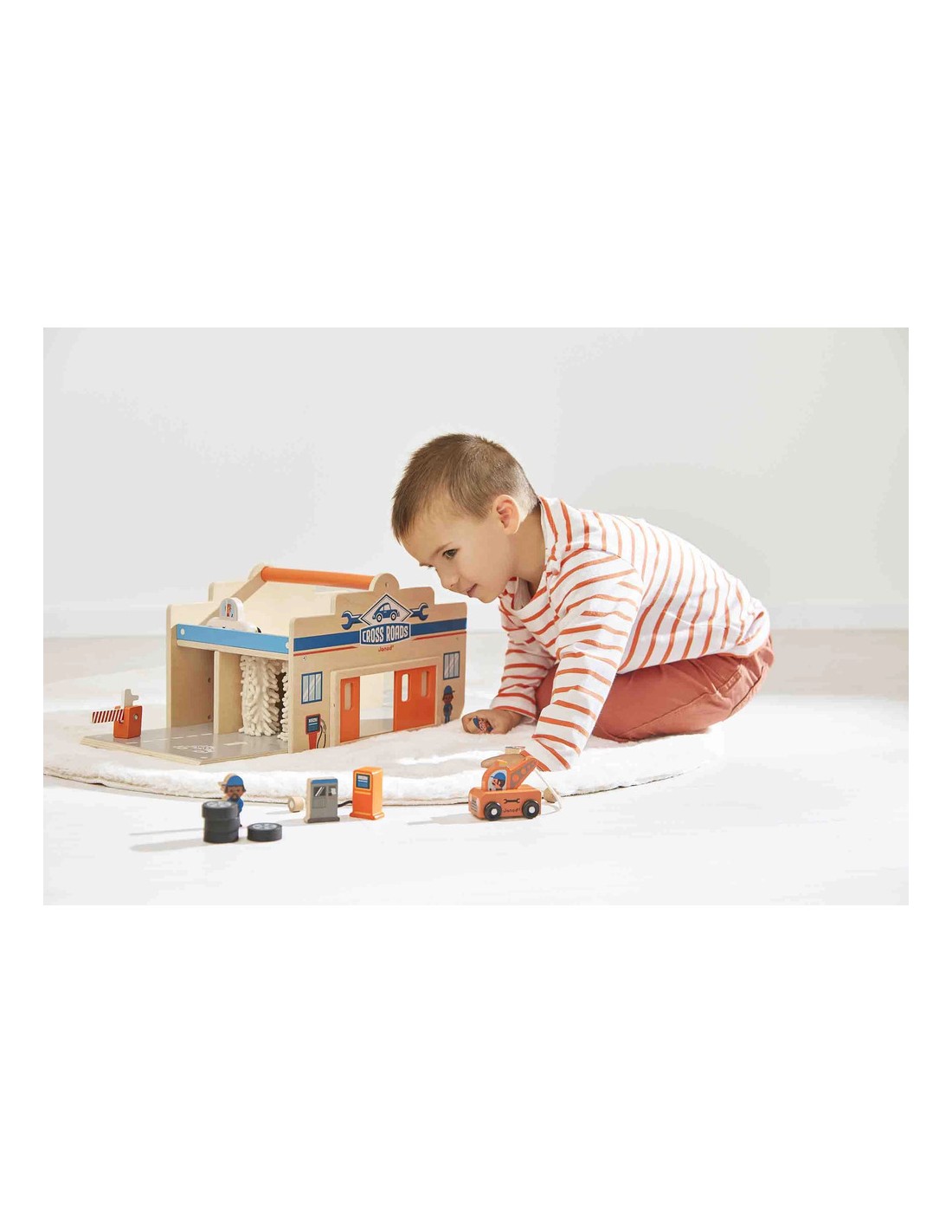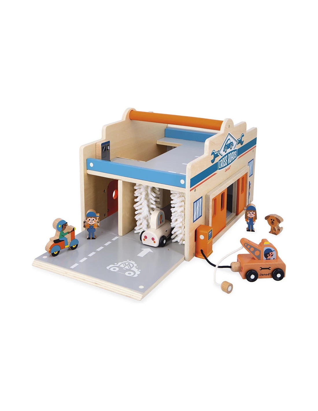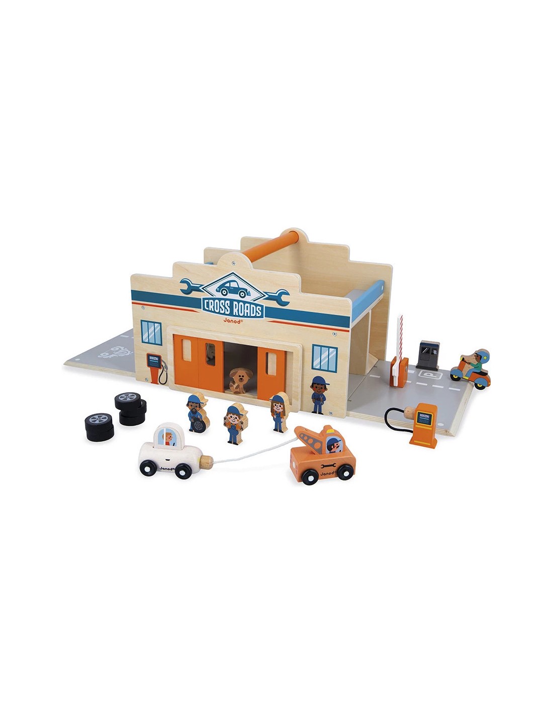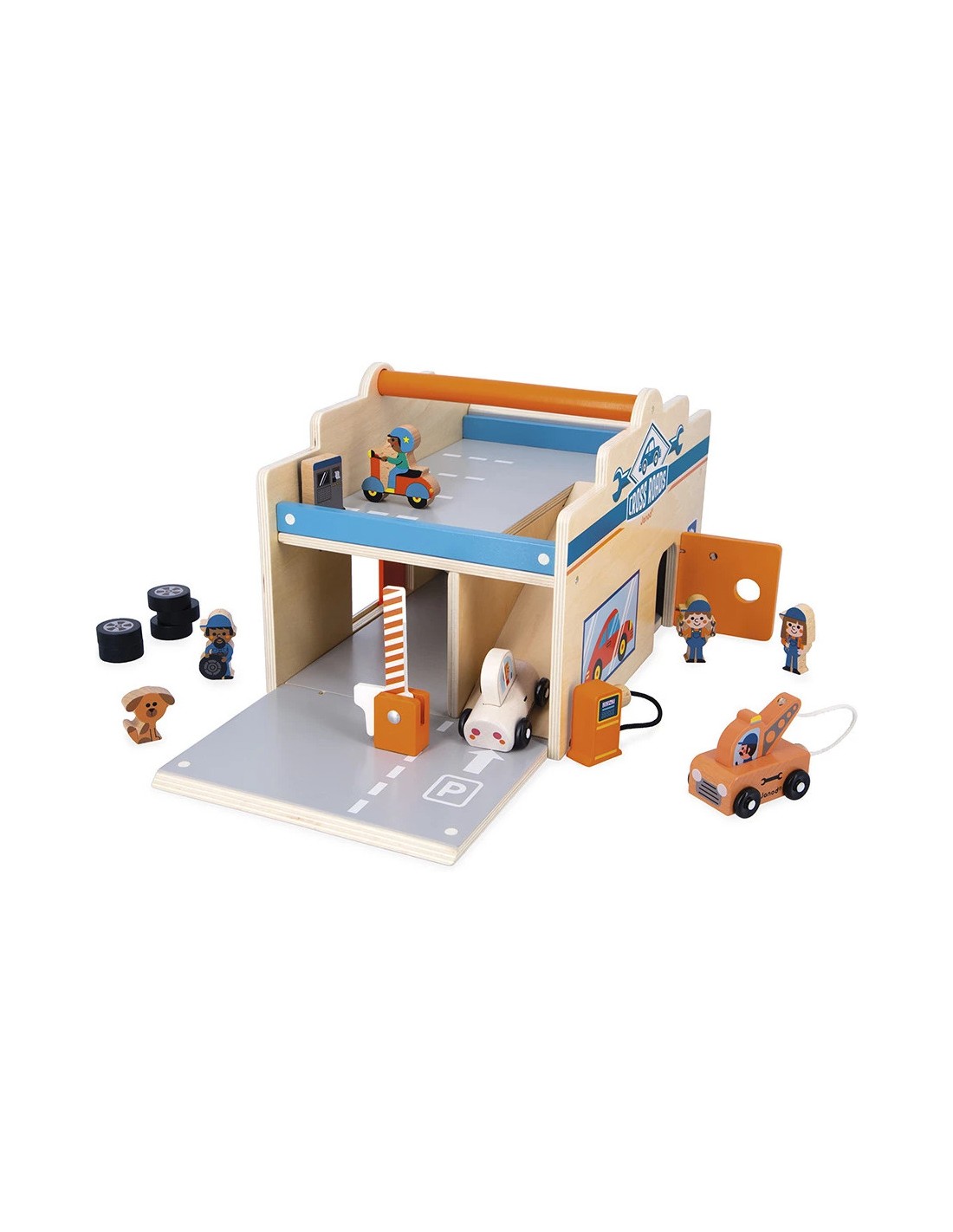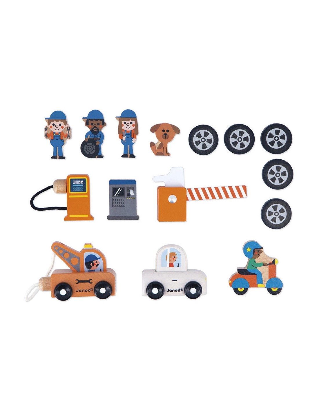 Il comprend 15 accessoires en bois : 1 dépanneuse, 1 voiture, 5 pneus, 3 mécaniciens, 1 personnage en scooter, 1 chien, 1 pompe à essence, 1 horodateur et 1 barrière amovible qui donne accès au parking à l'étage. Ce dernier permet de garer les véhicules en attendant leur tour à l’atelier : comme dans un vrai garage ! En cas de panne, la dépanneuse est envoyée pour remorquer la voiture jusqu'au garage.