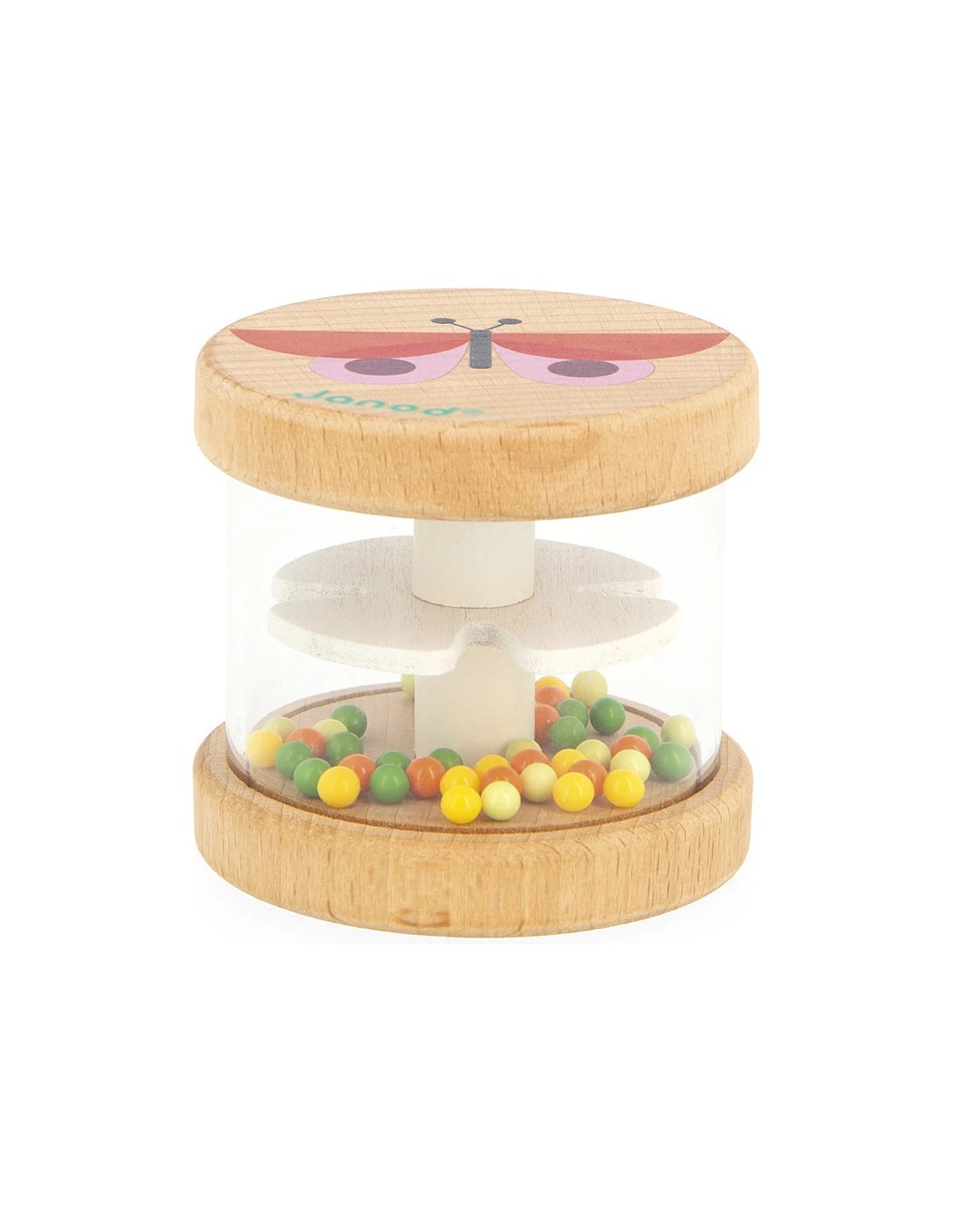 Il suffit de le secouer pour entendre le doux cliquetis des petites billes colorées, un bruit apaisant qui introduit ainsi un premier contact avec les sons, stimulant l’ouïe de bébé. À l’intérieur, les billes multicolores glissent autour d’une hélice en bois, créant un mouvement fluide et captivant qui invite à l'exploration.