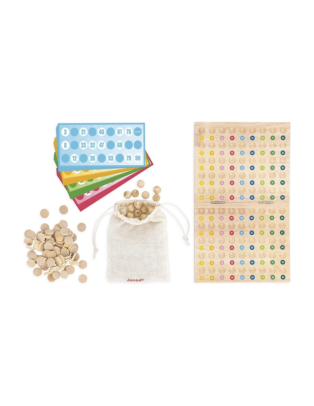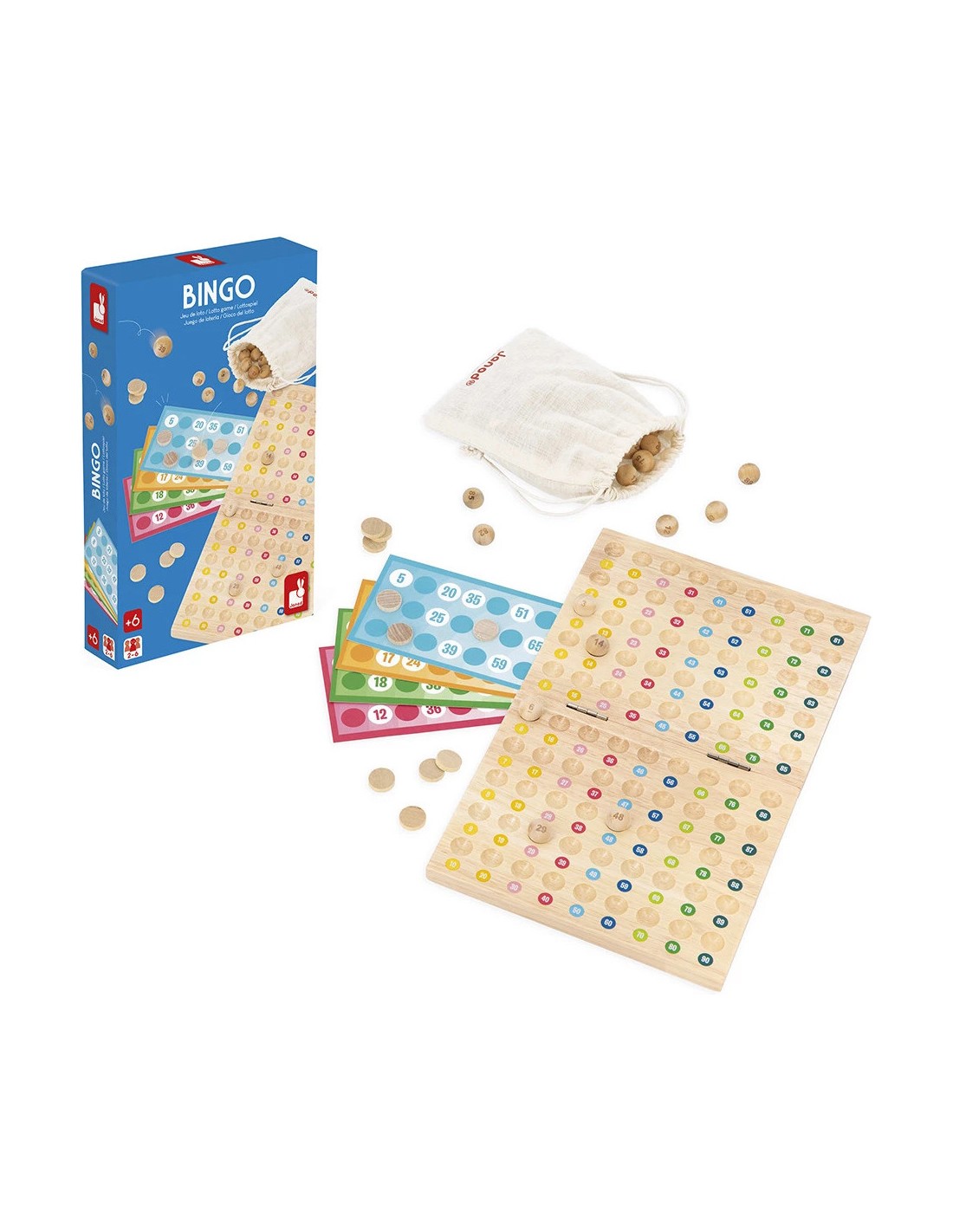 Le premier à la compléter crie "Bingo !" et remporte la partie. Un petit sac en coton est inclus pour tirer les numéros en tout discrétion... et pour tout ranger facilement une fois la partie terminée ! Le jeu comprend 90 boules numérotées, 90 pions en bois à placer sur les grilles et 48 cartes imprimées prêtes à être complétées.