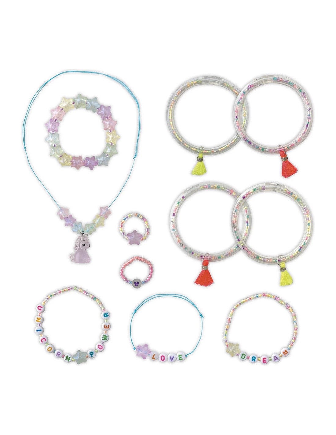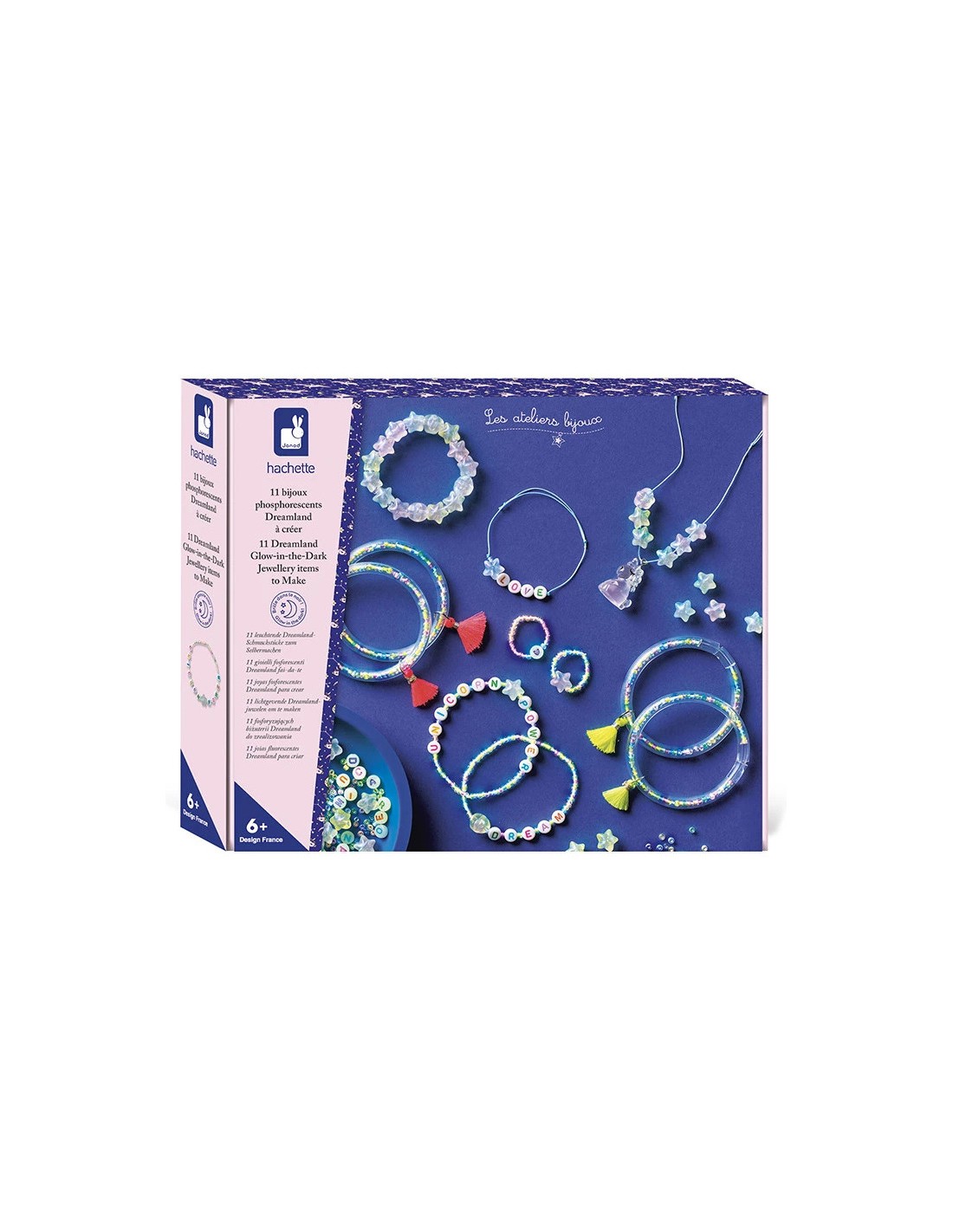 Des bijoux qui brillent pour illuminer la nuit ! Ce coffret créatif permet de réaliser 11 bijoux phosphorescents : 8 bracelets, 2 bagues et 1 collier. Sur le thème féerique de Dreamland, les enfants vont adorer assembler les perles et formes magiques pour des créations qui scintillent dans l’obscurité. Le livret inclus propose des modèles simples à suivre, mais chacun peut laisser libre cours à son imagination pour inventer des bijoux uniques. Les perles phosphorescentes apportent une touche spectaculaire : étoiles, cœurs, petites licornes et lettres se combinent pour créer des accessoires pleins de fantaisie. Le coffret contient : 1 breloque licorne phosphorescente, 25 perles étoiles, 1 perle cœur, environ 550 perles de rocaille, 21 perles lettres, du fil de jade, du fil élastique, 4 bracelets avec tubes en plastique et 4 pompons fluo. Une activité ludique d'environ 1h50 qui développe la créativité et la motricité fine, idéale dès 6 ans. Quand la lumière s’éteint, la magie opère… et les bijoux prennent vie ! Plongez dans l'univers de la collection "Dreamland", des kits de loisirs créatifs et de papeterie pour enfant sur le thème des licornes, dans un style coloré original. Pour des après-midis créatifs et fantastiques !