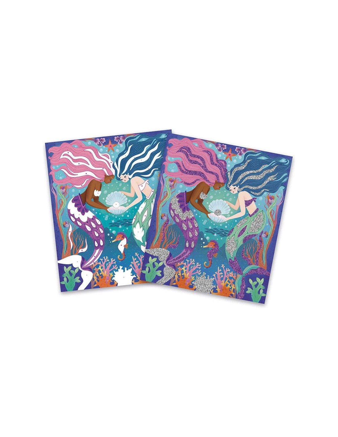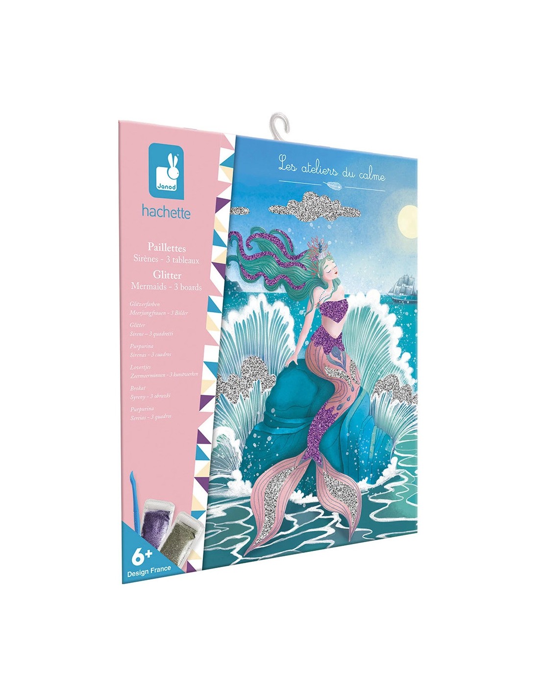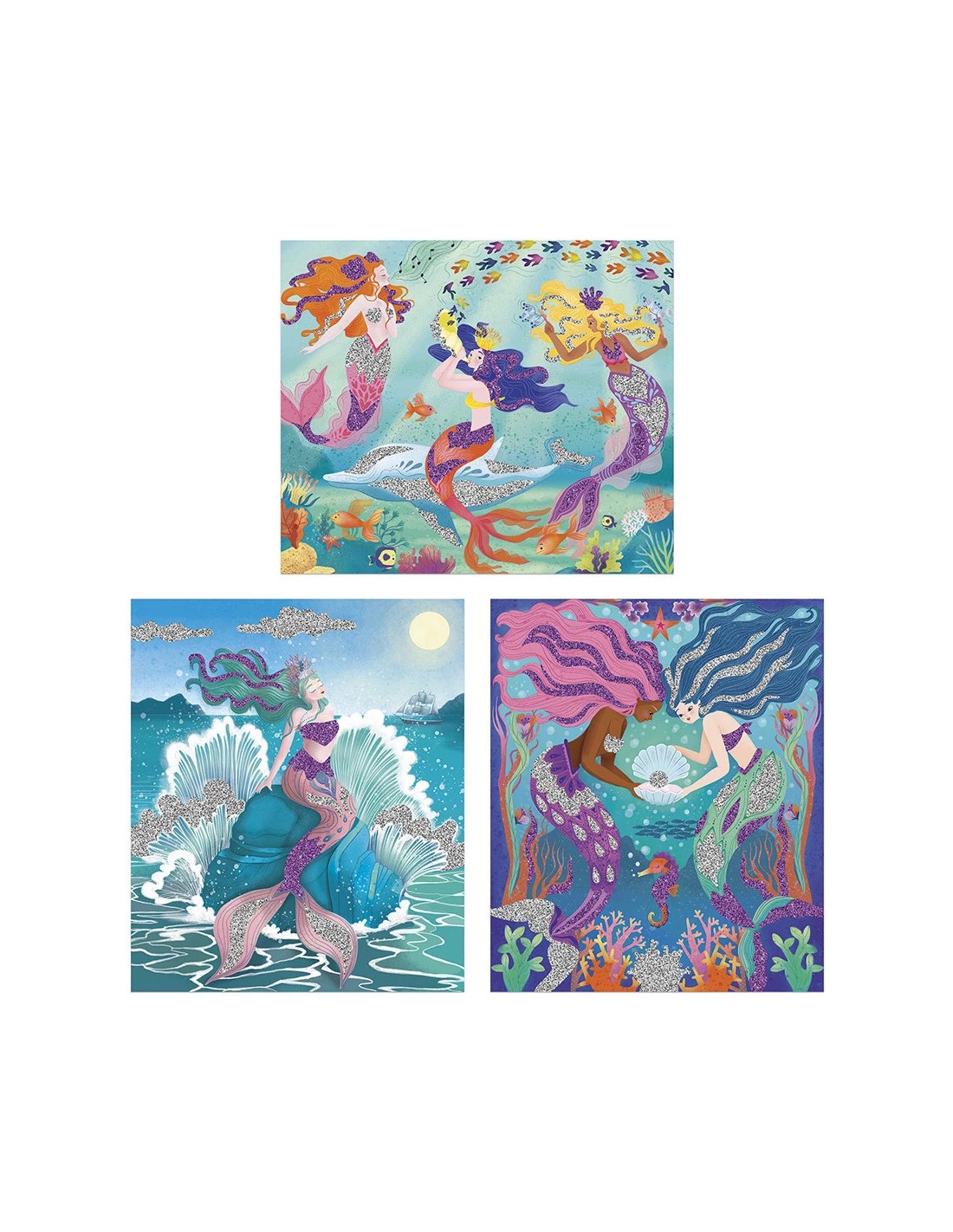 Plongez dans le royaume des sirènes et révélez sa magie scintillante ! Ce kit créatif est idéal pour les enfants à partir de 5 ans. En déposant progressivement les paillettes sur les illustrations fournies, ils développent leur créativité et leur dextérité, mais aussi leur patience. Trop malin, les paillettes se rangent dans des sachets à zip refermables pour les garder bien à l'abri entre deux créations ! D'ailleurs, l'embout "cuillère" de l'outil fourni permet de les remettre facilement à l'intérieur. Pour guider les enfants pas à pas dans la réalisation de l'activité, un livret est inclus ! Ce coffret créatif permet de décorer 3 tableaux sur le thème des sirènes à l’aide de zones autocollantes à recouvrir de paillettes biodégradables. L'enfant se muni de l'outil et utilise la pointe pour décoller le papier qui protège les zones à décorer. Et il ne reste plus qu'à y déposer les paillettes : un joli résultat qui illumine et fascine les petits comme les grands ! La pochette contient : 3 tableaux de 21 x 25 cm, 2 sachets de paillettes (argent et violet), 1 outil en plastique avec 2 embouts différents et 1 livret explicatif. Entre la découverte d'un trésor des mers, un soir de pleine lune au coeur des vagues et la mélodie envoûtante des sirènes qui chantent et jouent pour l’océan, laissez-vous embarquer par leur monde merveilleux et féérique ! Issu de la collection "Les Ateliers du Calme", cette activité est parfaite pour proposer un temps relaxant à votre enfant. À vos paillettes les artistes !