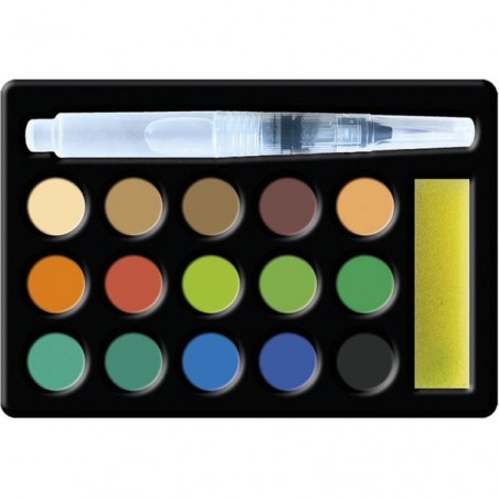 Contenu du coffret : 2 tableaux à peindre (dont 1 avec détails en dorure), 1 palette de peinture aquarelle (15 godets, 1 éponge, 1 feutre-pinceau avec réservoir d’eau), 1 cadre à peindre.