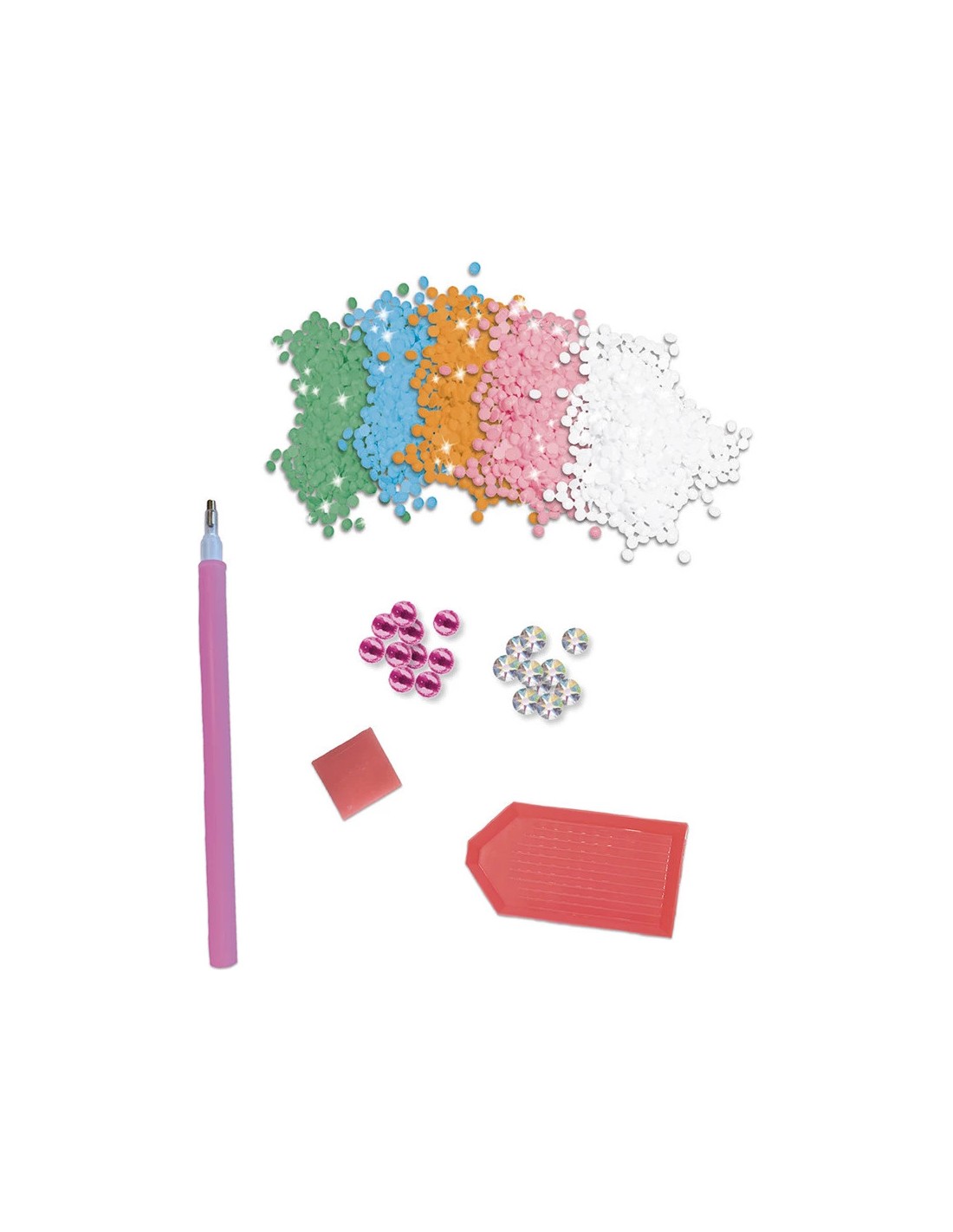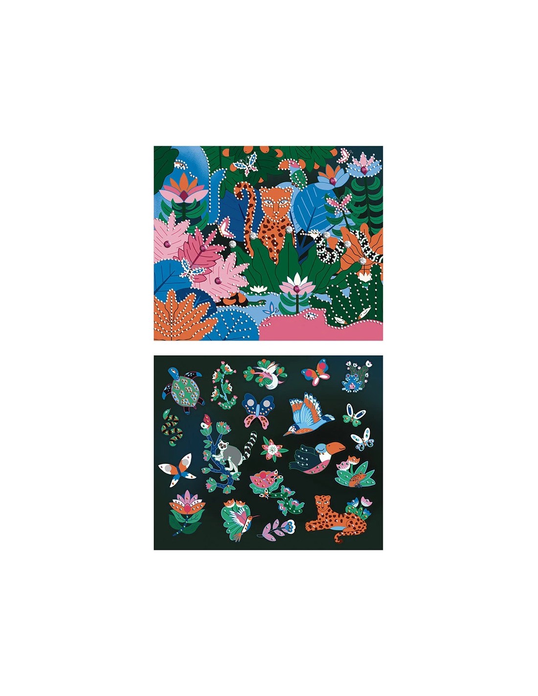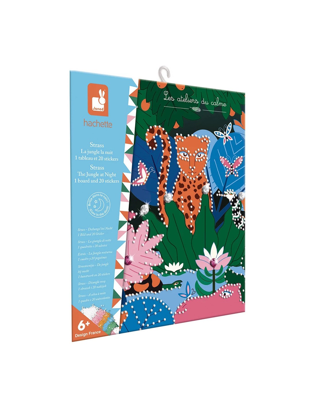 La nuit enveloppe la jungle et les animaux sauvages s’éveillent ! Donnez vie à ce décor nocturne en le parant de strass colorés pour en faire un univers scintillant et mystérieux. Le kit comprend aussi une planche de stickers à personnaliser avec cette même technique créative. Cette pochette, qui fait appel au diamond painting, est idéale pour les enfants à partir de 5 ans. Cette activité dure environ 1h40 et stimule la créativité et la motricité fine, tout en développant la patience. Un livret, présent dans le set, guide étape par étape la réalisation des modèles. Ce coffret créatif permet ainsi de décorer 1 tableau et des stickers sur le thème de la jungle à l’aide de strass autocollants de tailles et de couleurs variées. L’enfant commence par verser les strass dans le plateau pour les trier. Il prépare ensuite le stylet en appuyant sa pointe dans le carré de gomme : cela dépose une petite quantité de matière qui rend la pointe légèrement collante. Grâce à cela, il peut attraper facilement chaque strass et le coller sur le tableau. Une fois ce dernier terminé, il utilise la même technique pour décorer les stickers, qui sont déjà équipés de points de colle fugitive. Maintenant, il ne reste plus qu'à afficher fièrement les créations ! Et lorsque la nuit tombe, le tableau révèle sa magie : parmi les strass se trouve une couleur phosphorescente qui s’illumine dans l’obscurité pour un effet spectaculaire. Issu de la collection "Les Ateliers du Calme", ce kit contient : 1 tableau (21 x 25 cm), 1 planche de 20 stickers avec points de colle fugitive, 1 200 mini-strass de 5 couleurs différentes dont 1 phosphorescente, 20 strass (de 8 mm et de 2 couleurs), 1 stylet, 1 carré de cire, 1 plateau et 1 livret explicatif. Prêts à faire briller le guépard ?