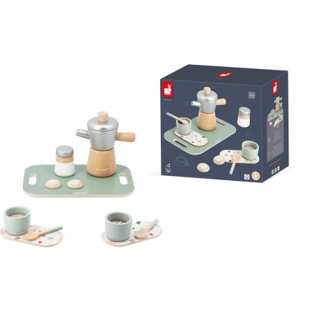 Un petit café ? (Re)découvrez les plaisirs d'un bon café à l'italienne avec votre enfant et ce set d'imitation en bois. 13 pièces composent cet ensemble pour sublimer les fins de repas ou les petits-déjeuners : 1 plateau avec poignées, 1 cafetière à l'italienne, 1 sucrier, 2 tasses à café, 2 sous-tasses, 2 cuillères à café, 2 biscuits et 2 types de café (noir et capuccino).