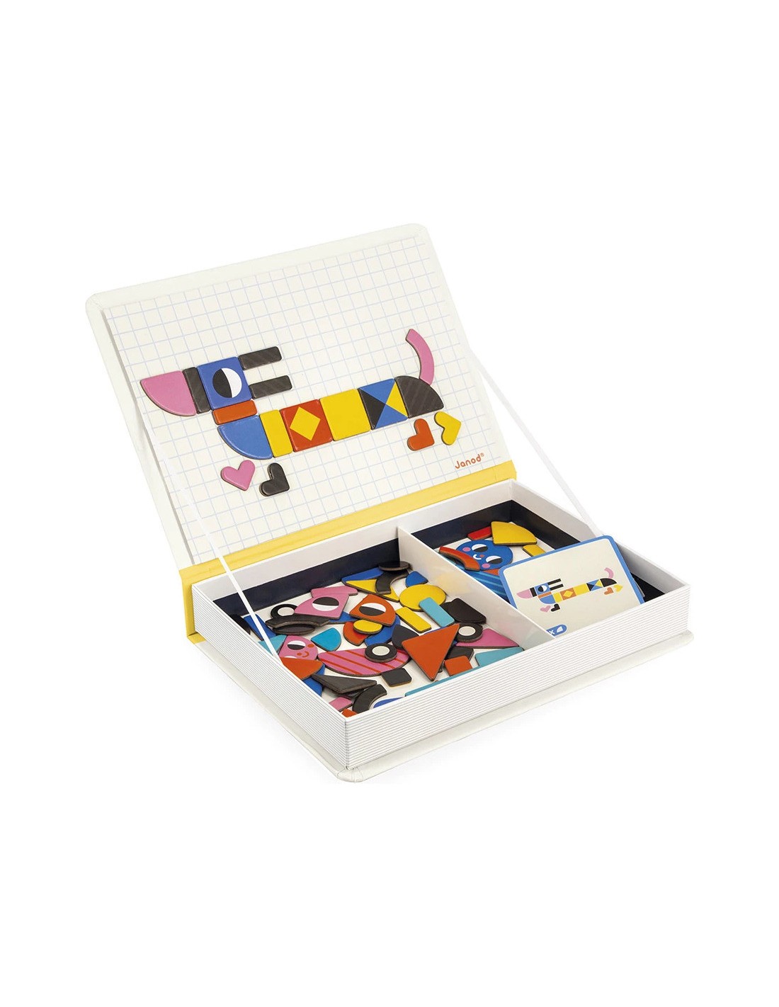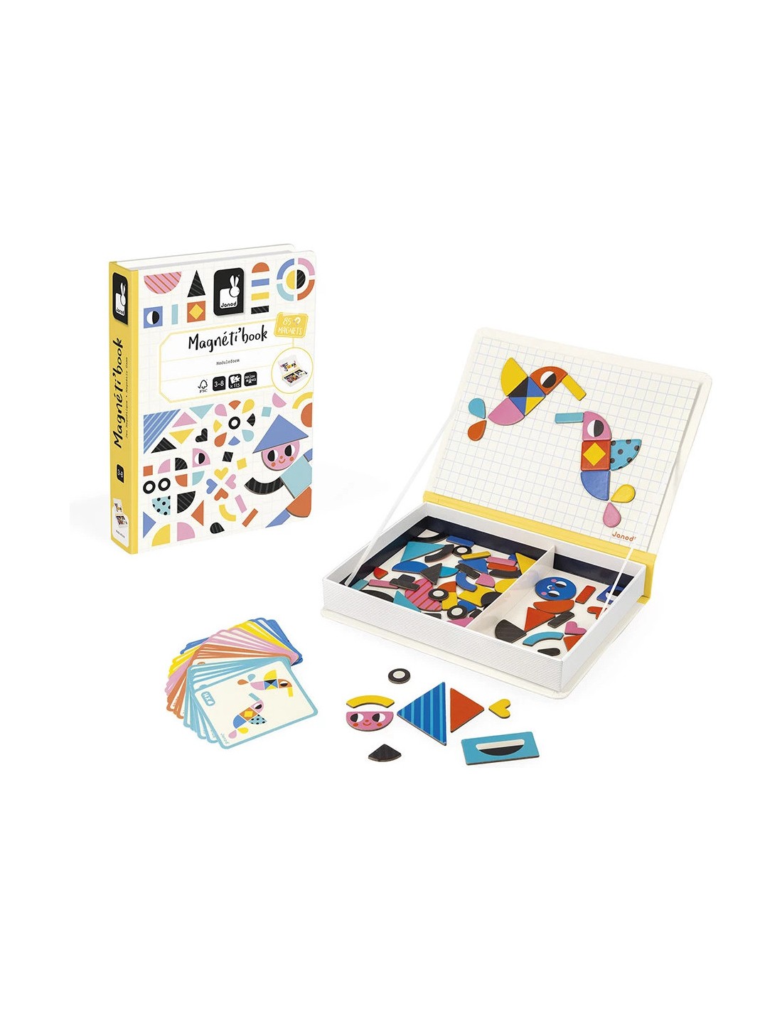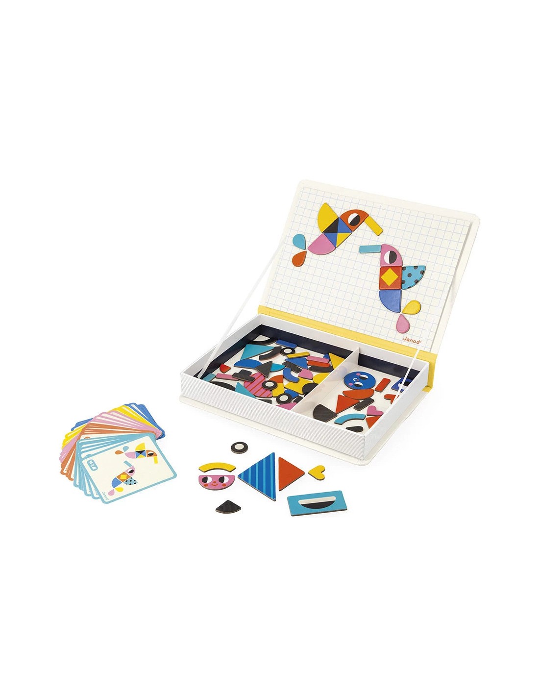 Hop, une forme bouge… et tout change ! Le Magnéti'book tangram propose 85 magnets colorés pour permettre aux enfants dès 3 ans de créer de nombreuses figures amusantes : oiseaux, personnages, véhicules… et bien plus encore ! Son format livre aimanté est ultra pratique : il suffit de l’ouvrir pour découvrir les magnets, les 30 cartes modèles et la surface magnétique sur laquelle assembler les magnets.