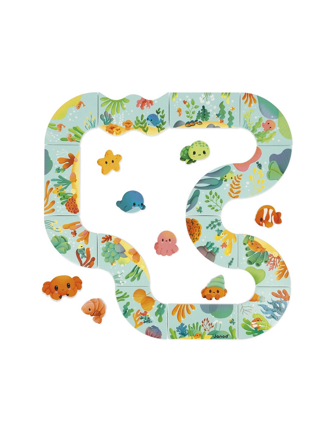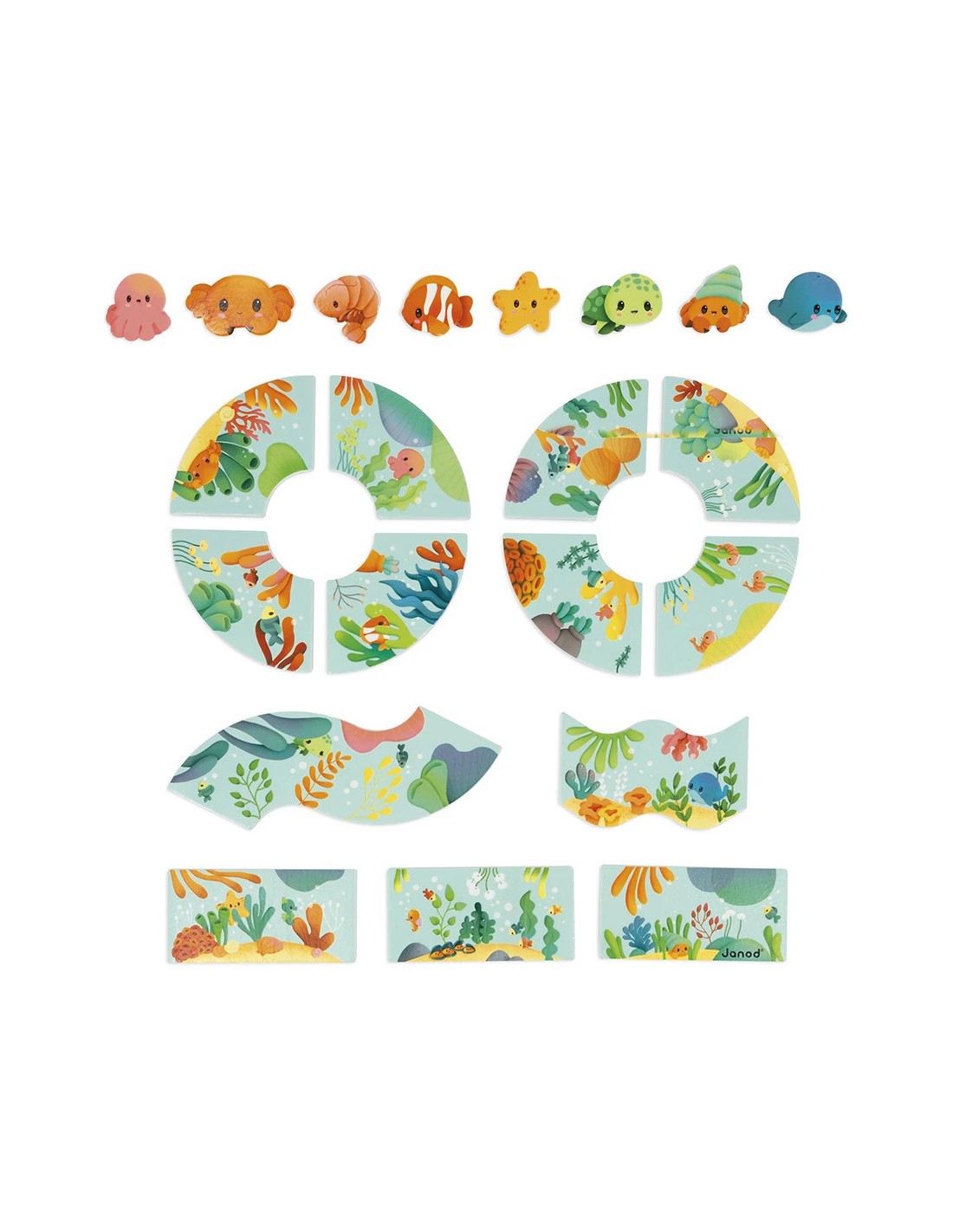 Chaque pièce s’assemble pour former un décor sur le thème de la mer et les enfants s’amusent à retrouver les bébés cachés pour les associer au bon parent. Une activité ludique qui stimule la vue et la motricité fine des petits ! Bébé pourra retrouver 8 animaux des mers : tortue, étoile de mer, baleine, poulpe, poisson clown, crabe, crevette et même bernard-l'hermite.