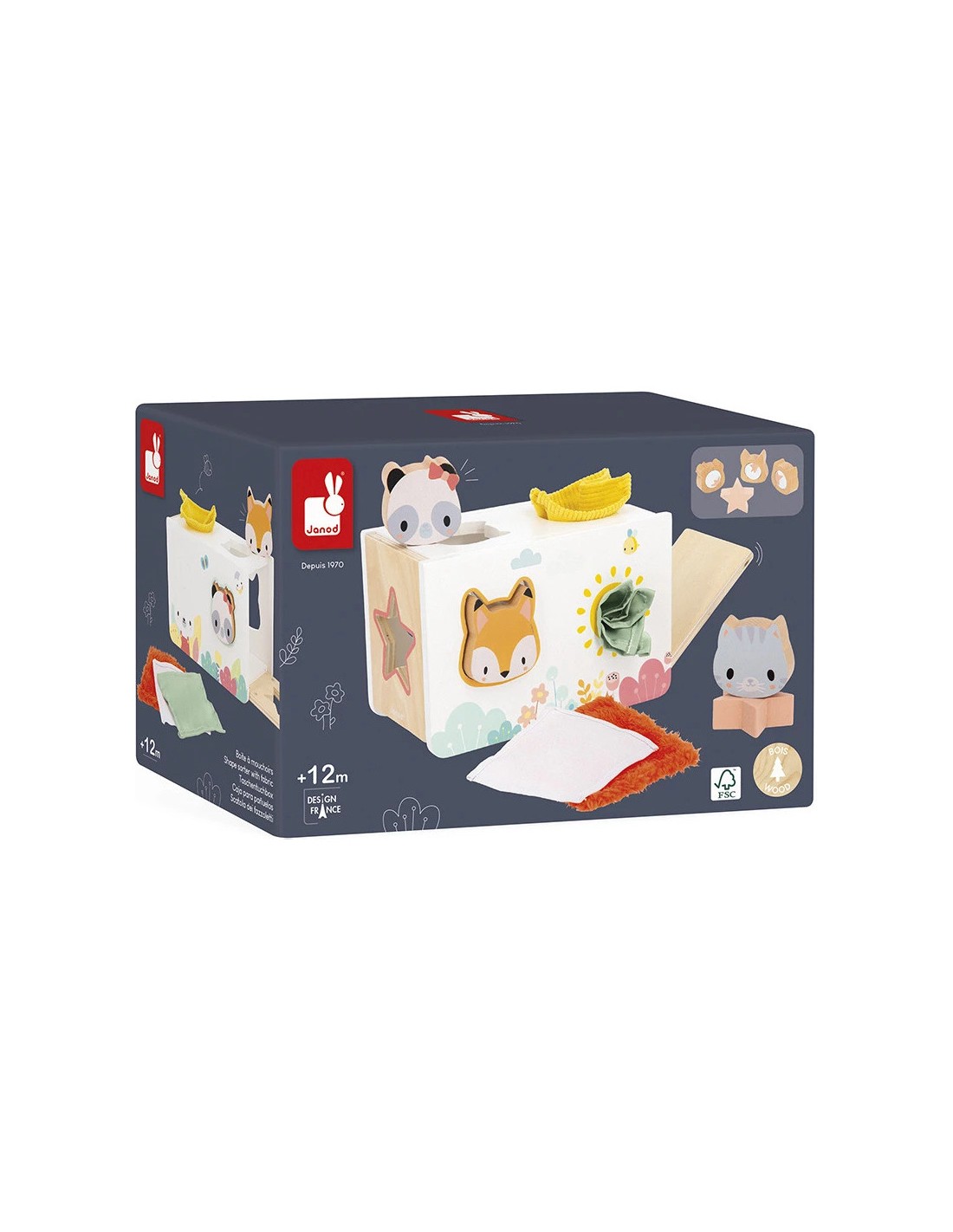 Chaque tissu est une nouvelle découverte à toucher, tirer, froisser. Bébé pourra y trouver 4 mouchoirs aux textures variées. De quoi satisfaire sa curiosité et son envie de tout explorer ! Trop pratique, les petites portes en bois sur les côtés s’ouvrent… et hop, bébé peut récupérer facilement les pièces qu’il a glissées dans la boîte.