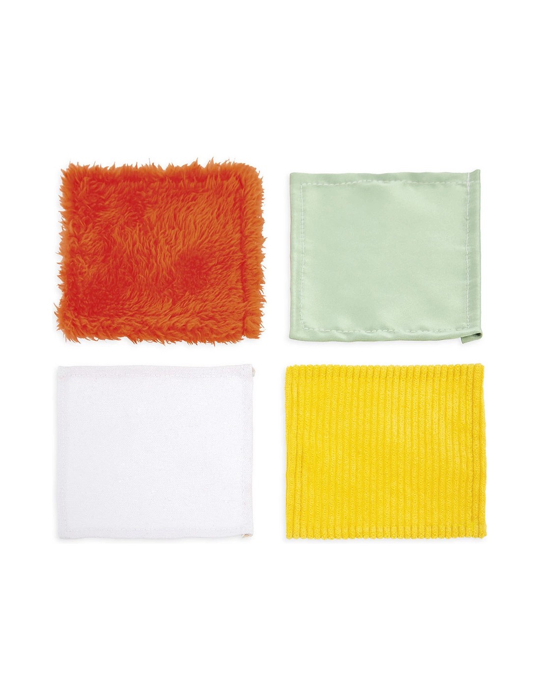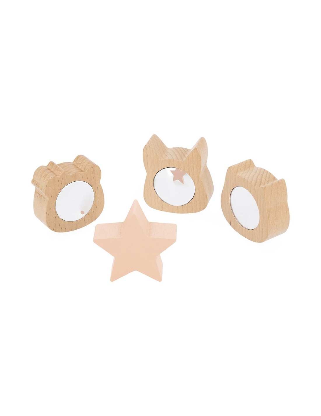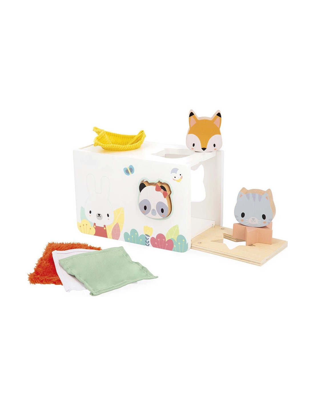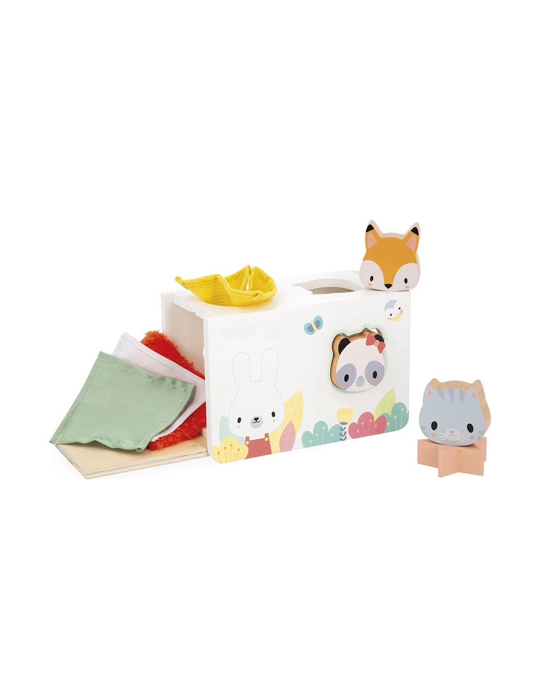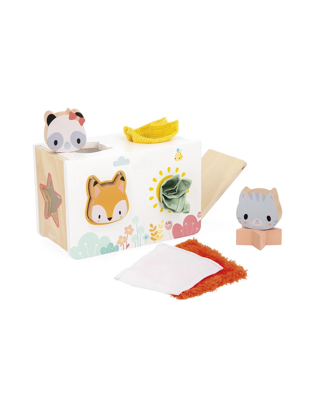 On retrouve 1 étoile et 3 adorables têtes d'animaux : 1 panda, 1 chat et 1 renard. Trop rigolo, derrière chaque tête, il y a un miroir déformant qui fera bien rire les tous-petits ! Bébé glisse sa petite main dans la boîte… surprise ! Un mouchoir tout doux apparaît. Et là, un autre tout rugueux !