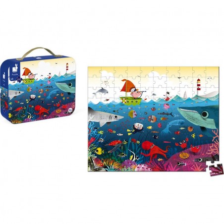 Le puzzle Janod Le Monde Sous Marin se présente dans une jolie valisette en carton avec poignée en tissu, idéale pour le transport et le rangement.