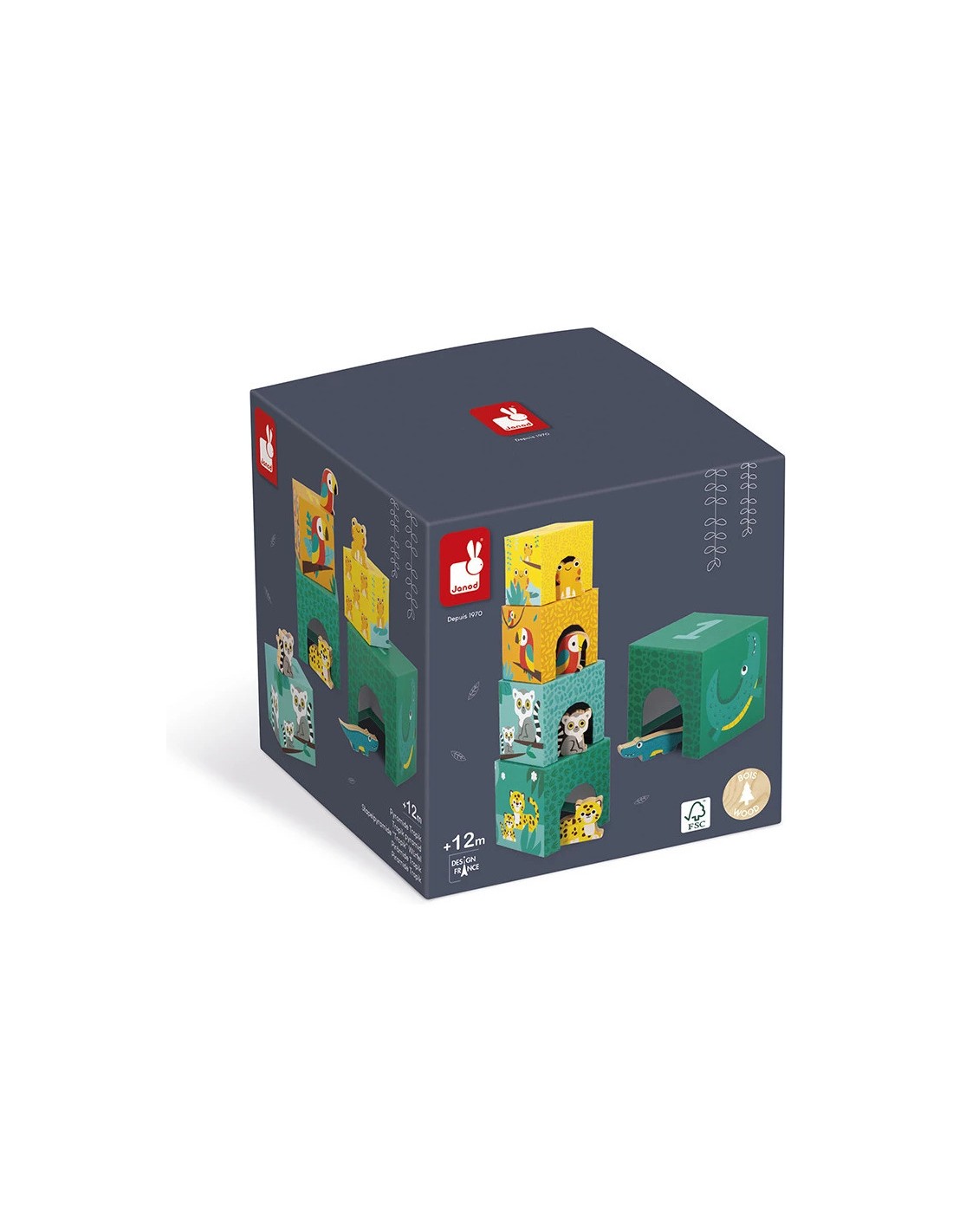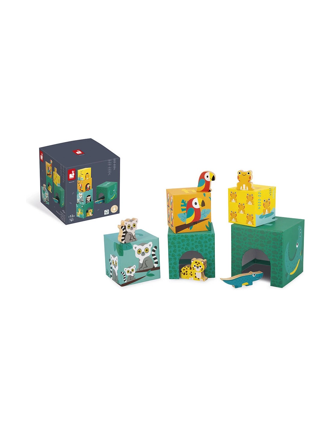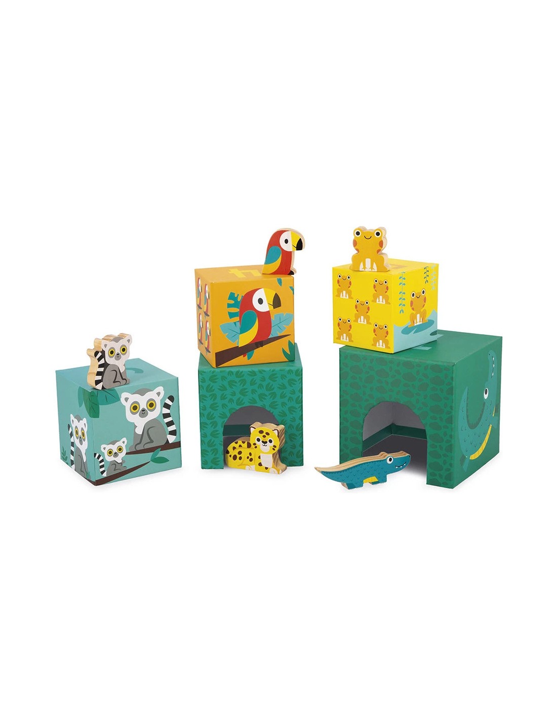 Les animaux de la jungle se sont lancés dans une partie de cache cache ! Le crocodile, le jaguar, le lémurien, le perroquet et la grenouille se sont cachés dans leurs abris respectifs. Avec cette belle pyramide carrée en carton composée de 5 cubes, bébé , dès 12 mois, pourra explorer plusieurs façons de jouer !