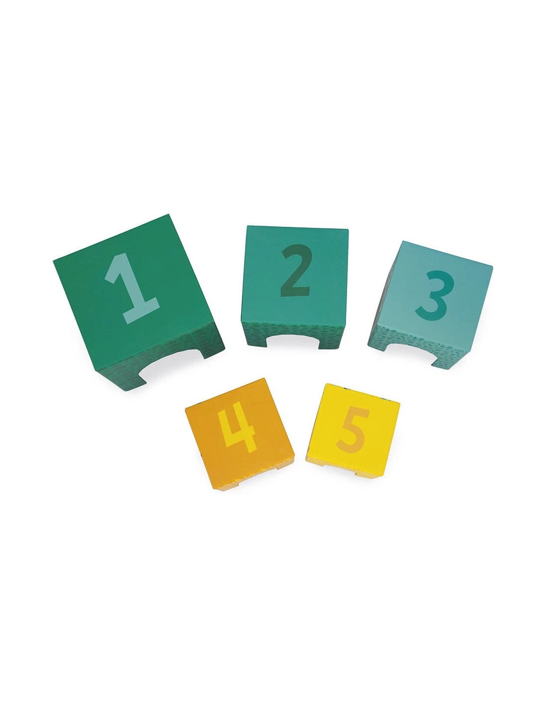 Il pourra d’abord empiler les cubes du plus grand au plus petit pour reconstituer la pyramide. Chaque cube représente un animal de taille différente : le lémurien, plus grand que le perroquet, se retrouve naturellement sur un bloc plus bas. Pour l’aider à se repérer, les cubes sont numérotés de 1 à 5.