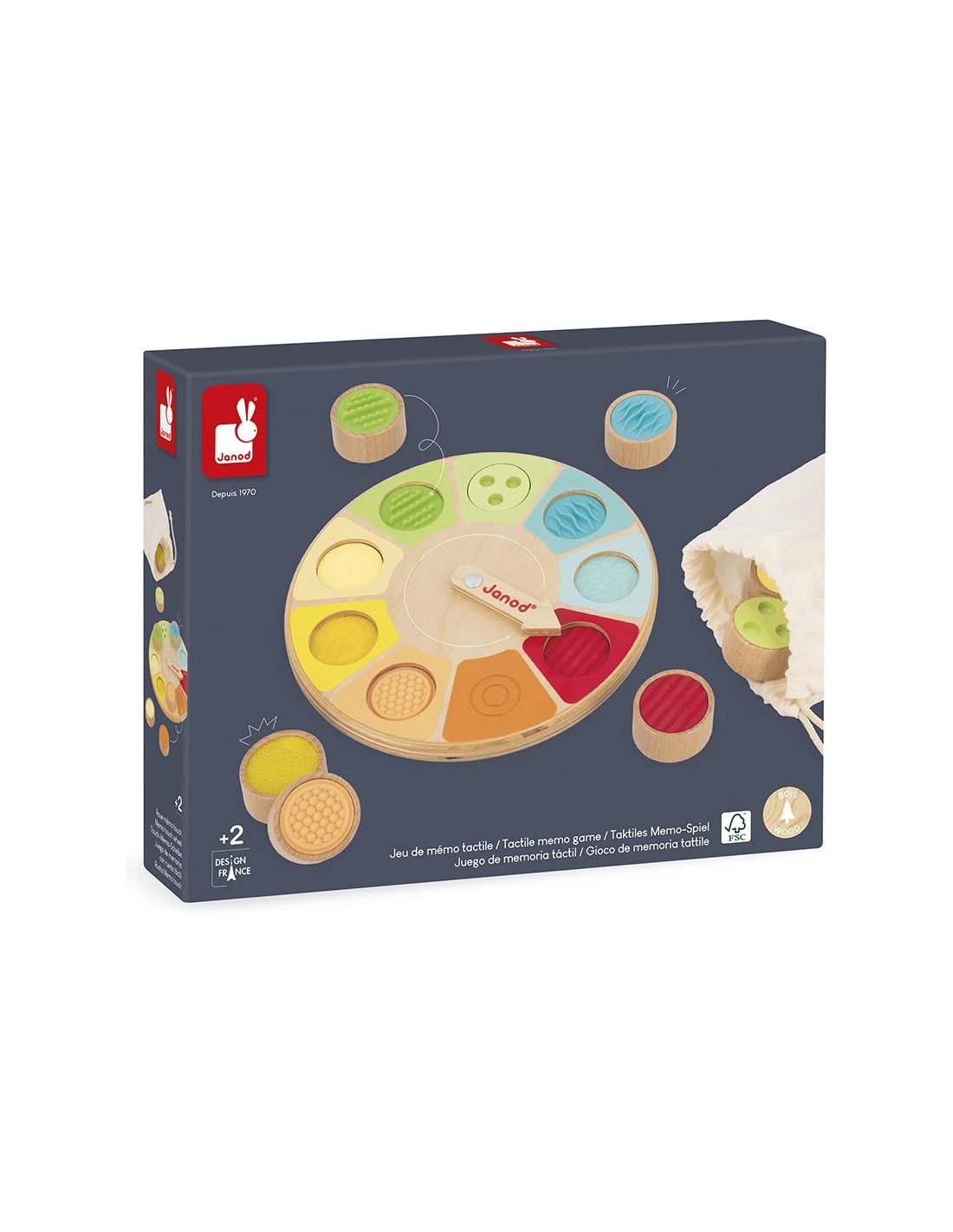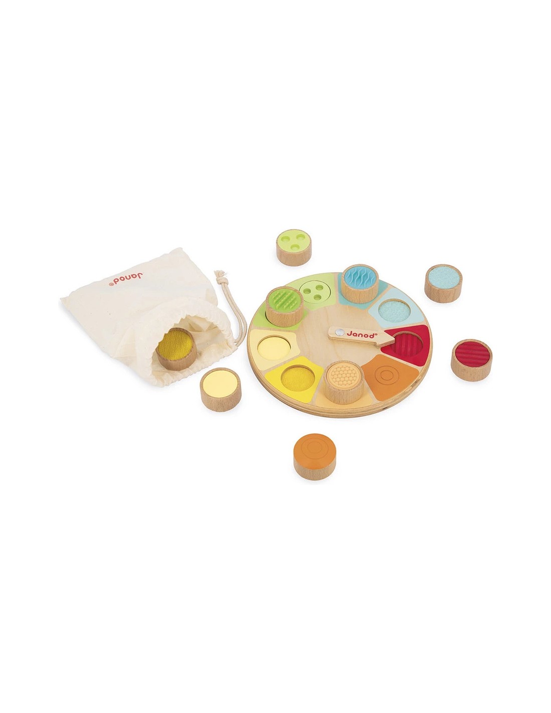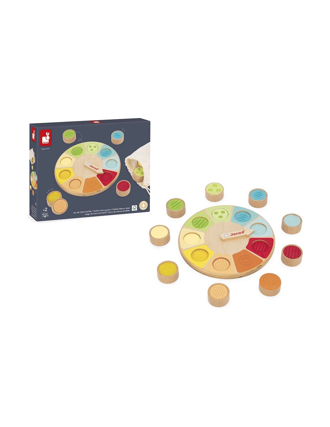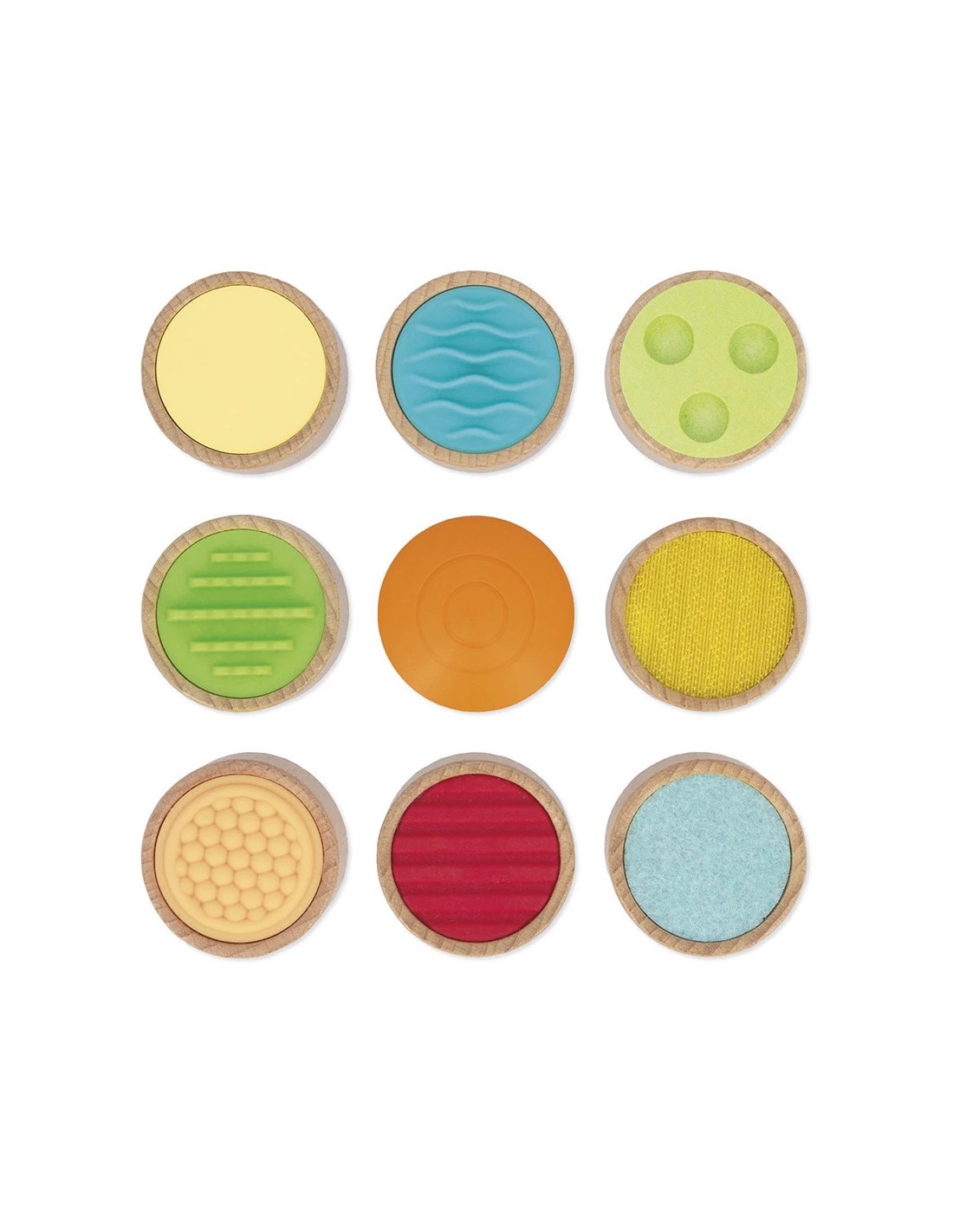 Le jeu comprend 9 pièces en bois avec des textures et matières variées : feutrine, scratch, bois, silicone, surface lisse ou à reliefs. Chaque texture est reprise sur le plateau pour faciliter l’association. Ce jeu de reconnaissance tactile fait appel au toucher mais aussi à la mémoire sensorielle. Les couleurs douces et contrastées différencient chaque texture pour stimuler l’attention visuelle des tout-petits.