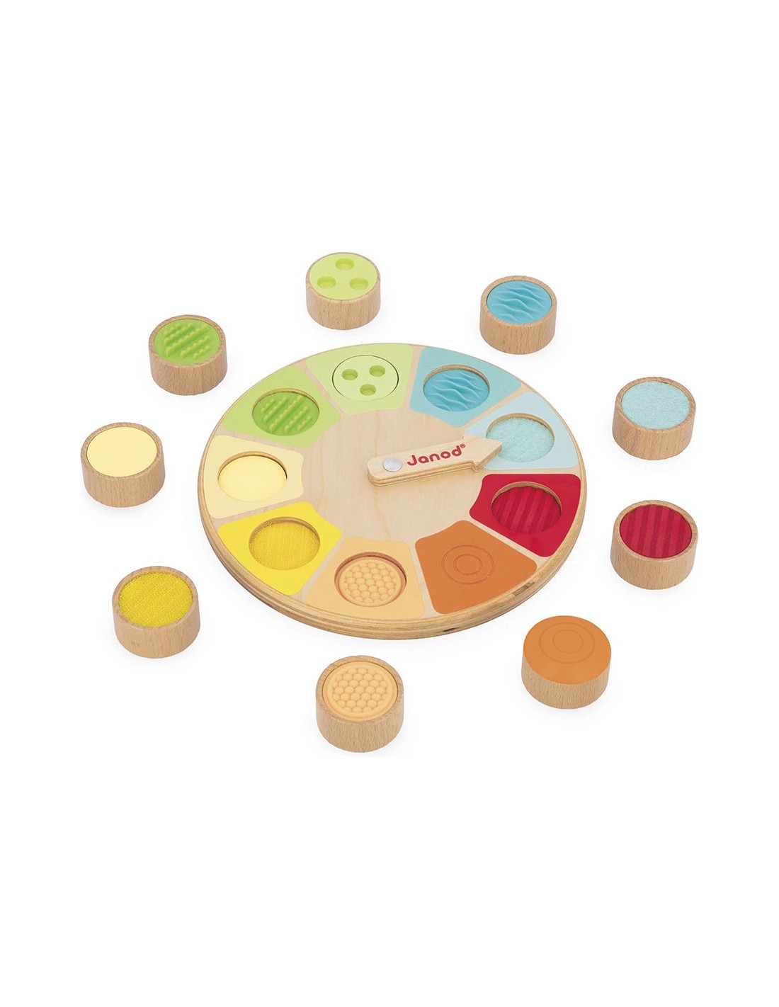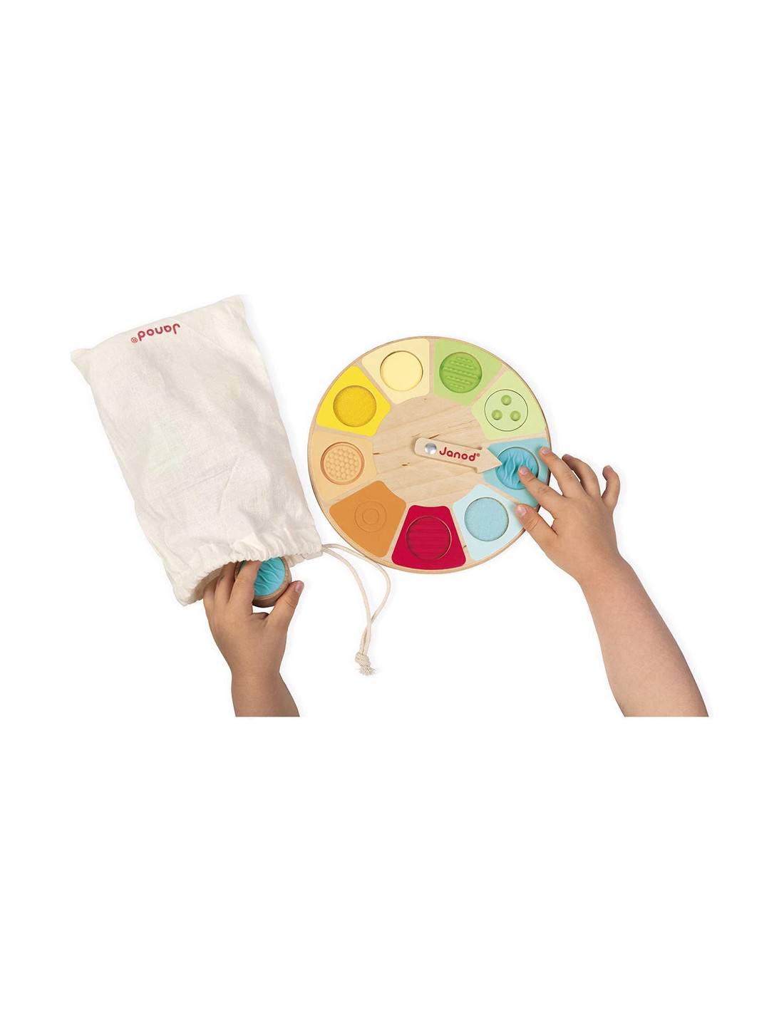 Deviner juste avec les doigts ! Voici une roue sensorielle qui va permettre aux enfants dès 2 ans de développer leurs sens et notamment le toucher. Le principe est simple : une fois la flèche lancée, l’enfant doit plonger sa main dans le sac en coton et retrouver, par le toucher, la pièce qui correspond à la texture indiquée sur le plateau !