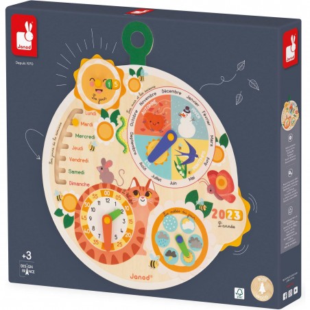 Ce calendrier en bois joliment décoré avec des éléments naturels et de petits animaux se fond à merveille dans une chambre d'enfant. Il laisse apparaître du bois naturel, certifié Fsc®. Petites abeilles et autres papillons accompagnent les enfants en maternelle qui peuvent reproduire les rituels en place à l'école. Cette roue du temps est aussi un jouet éducatif pour les plus grands qui apprennent à lire. Elle est disponible en français uniquement.