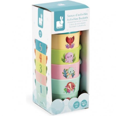 Ces 5 seaux aux belles couleurs et aux jolies illustrations d'animaux marins feront bien rire bébé à partir de 10 mois! On remplit les seaux d'eau puis on s'amuse à la voir s'échapper par le dessous et à observer les seaux se vider.