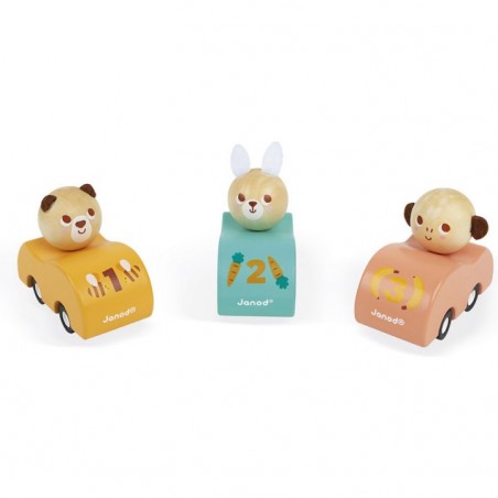 Il suffit de faire reculer la voiture puis de la lâcher pour qu'elle roule toute seule comme un vrai bolide. Les oreilles des animaux sont en feutrine. Sur le capot de chaque voiture est imprimé un chiffre et un motif différent en rapport avec l'animal (ex : carottes pour le lapin, abeilles pour l'ours et bananes pour le singe).