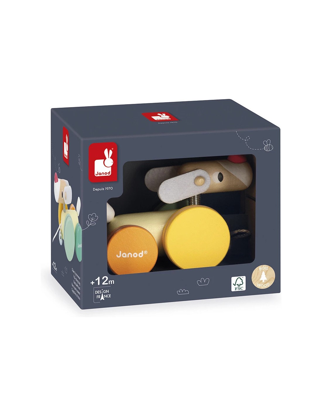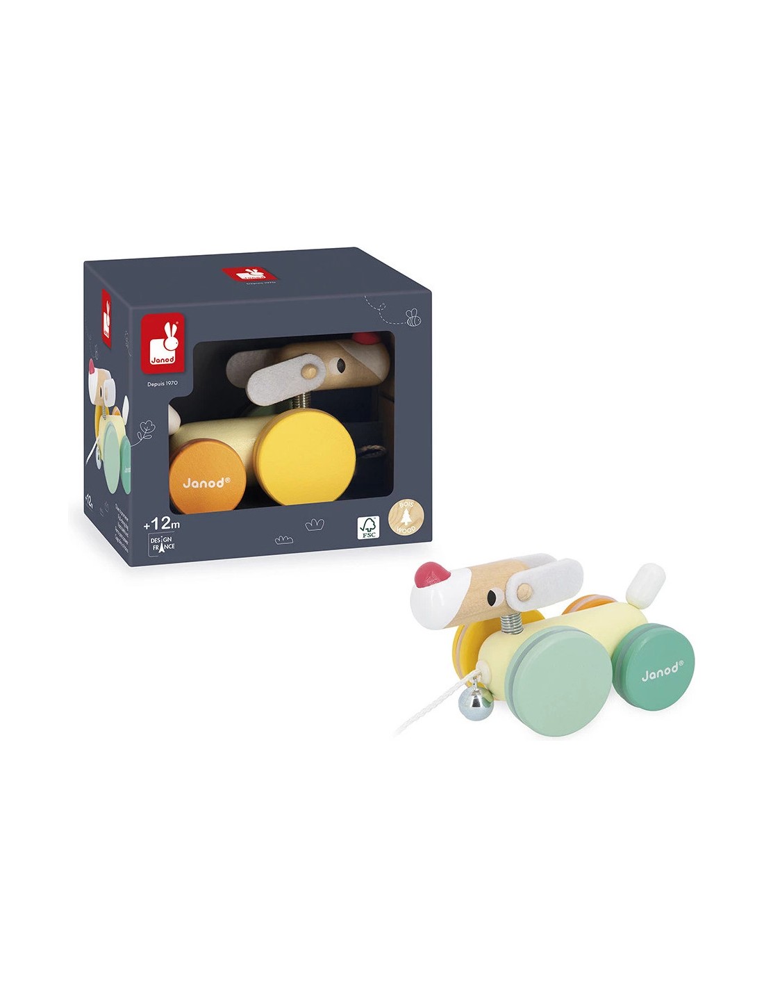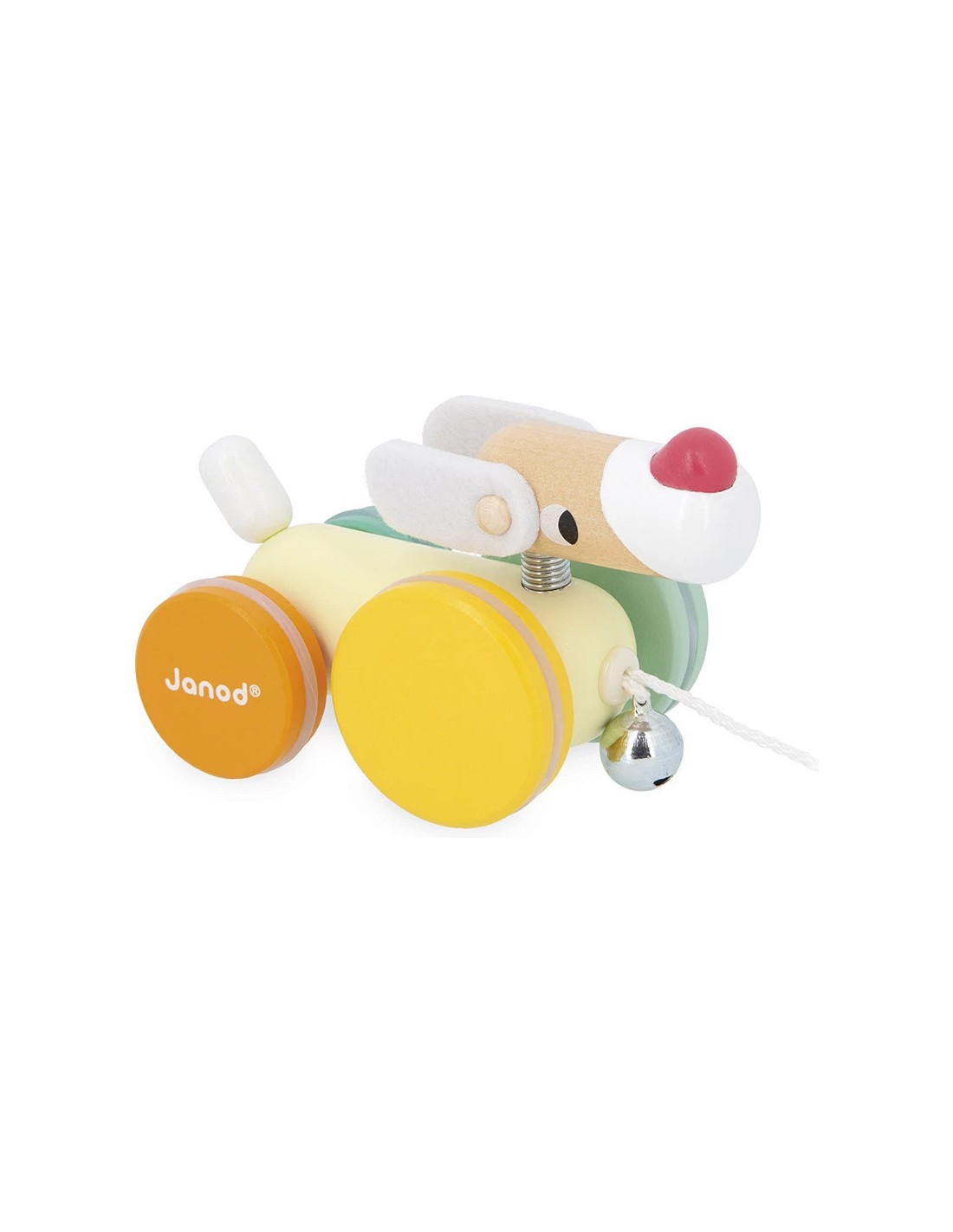 C'est l'heure de la promenade ! Ce petit chien en bois coloré ne demande qu'à être adopté ! Il va vite devenir le compagnon préféré des tout-petits, toujours prêt pour une balade dans la maison ou une expédition dans le jardin. Avec sa tête sur ressort, son museau rouge rigolo et sa clochette qui tinte dès qu’on le fait rouler, il est Le compagnon idéal pour les premières balades de bébé.