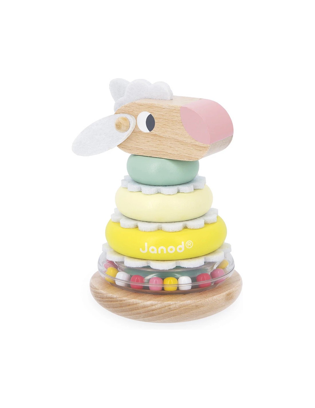 Une fois le jouet entièrement empilé, il peut le secouer pour faire bouger les billes dans l’anneau, ajoutant une dimension sonore et sensorielle au jeu. Mais ce n'est pas tout ! Le mouton se transforme aussi en culbuto grâce à sa base arrondie : il se balance doucement sans jamais tomber.